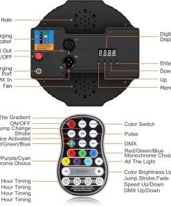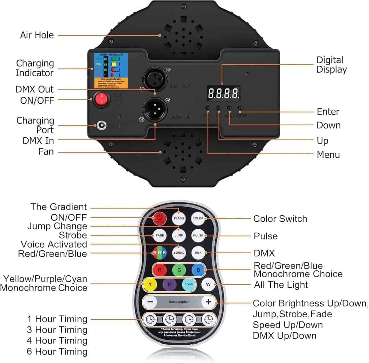 1. Modos de iluminación: Estas luces dj con batería incluyen varios modos: Color Estático/ Saltar/ Fundido/ Automático/ Estrobo/ Activado por Sonido/ Maestro-Esclavo/ DMX. Todos estos modos pueden ser seleccionados mediante control remoto. Además, el brillo, velocidad y color pueden ser fácilmente modificados con el control remoto.