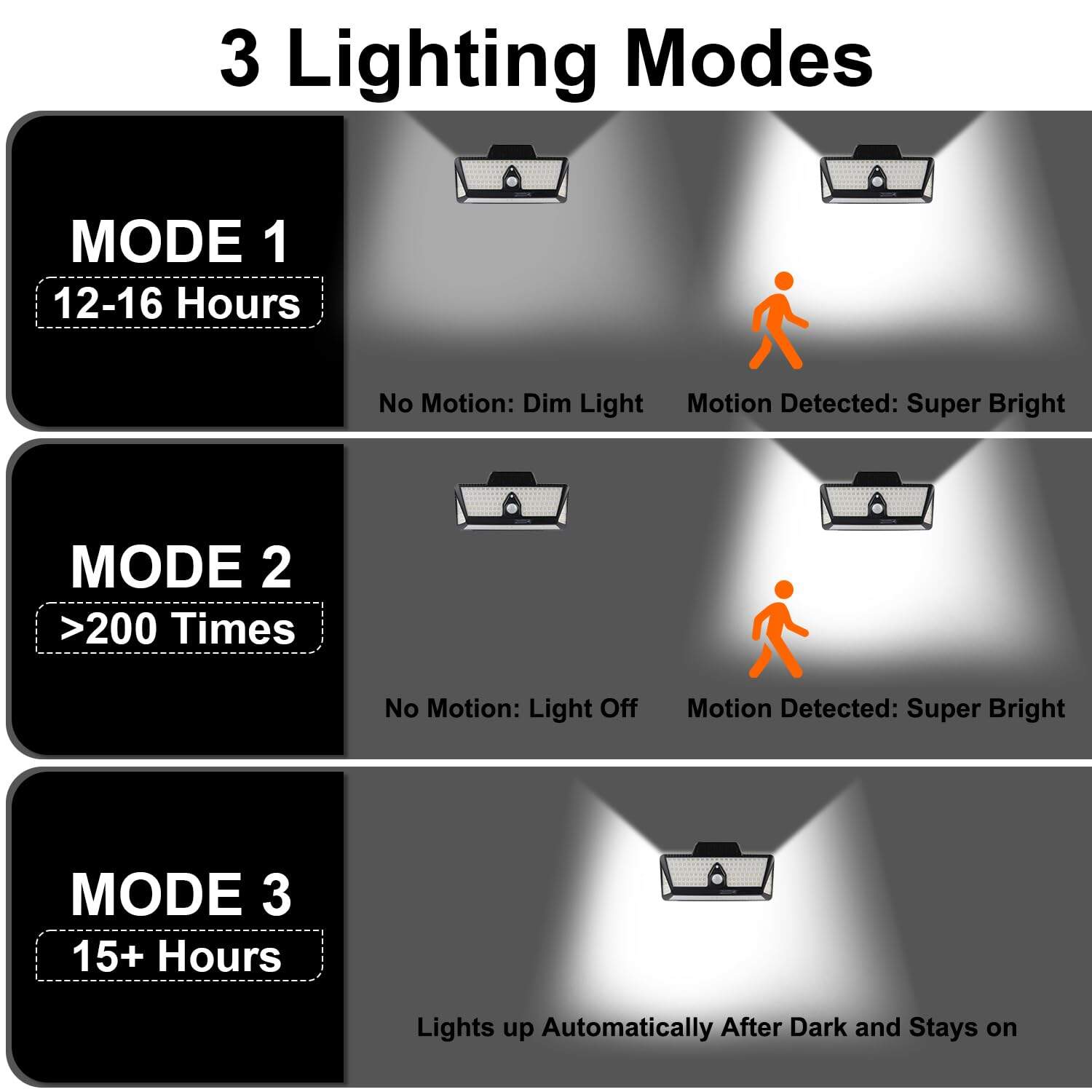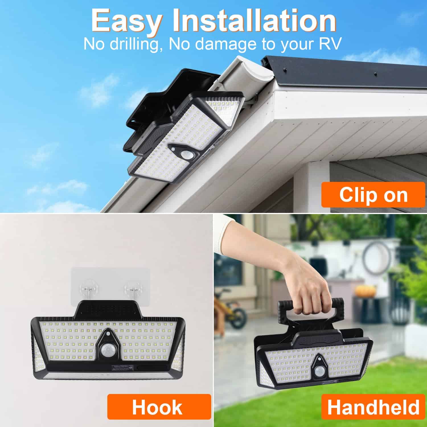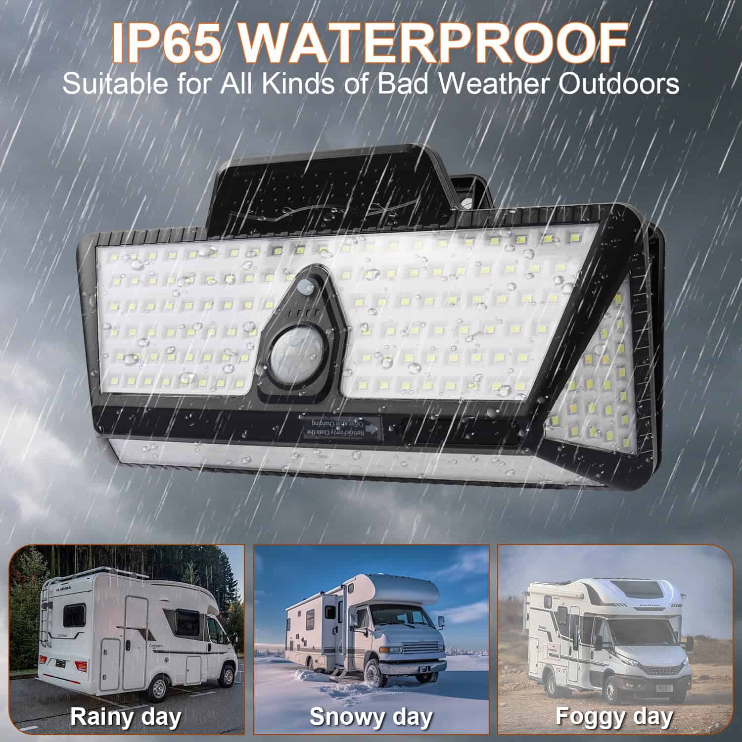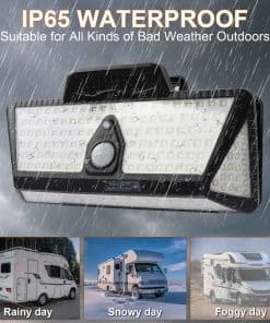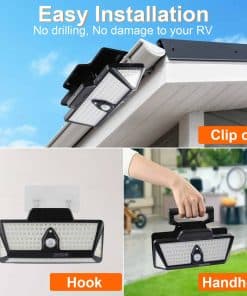 Las luces solares para RV son una excelente adición a su vehículo recreativo, proporcionando iluminación exterior de alta calidad para sus actividades al aire libre. Con un sensor de movimiento PIR de 3 modos, estas luces se encenderán automáticamente cuando se detecte movimiento en un rango de 16.4 pies, y se apagarán cuando no haya movimiento. Con tres modos de iluminación diferentes, puede ajustar fácilmente la configuración para satisfacer sus necesidades específicas. El panel solar de alta eficiencia asegura una carga rápida y una larga duración de la batería, lo que le proporciona hasta 15 horas de iluminación por la noche. Con 208 LED súper brillantes y una amplia iluminación de ángulo de 300, estas luces proporcionan una excelente visibilidad en un área de hasta 150 pies cuadrados. Además, las luces son resistentes al agua con clasificación IP65, lo que las hace adecuadas para su uso en una variedad de condiciones climáticas. Con cinco métodos de instalación diferentes, puede montar estas luces de forma segura en una variedad de superficies. Ya sea que esté acampando, viajando en su RV, o simplemente necesite iluminación adicional en el exterior de su vehículo, estas luces solares para RV son la solución perfecta.