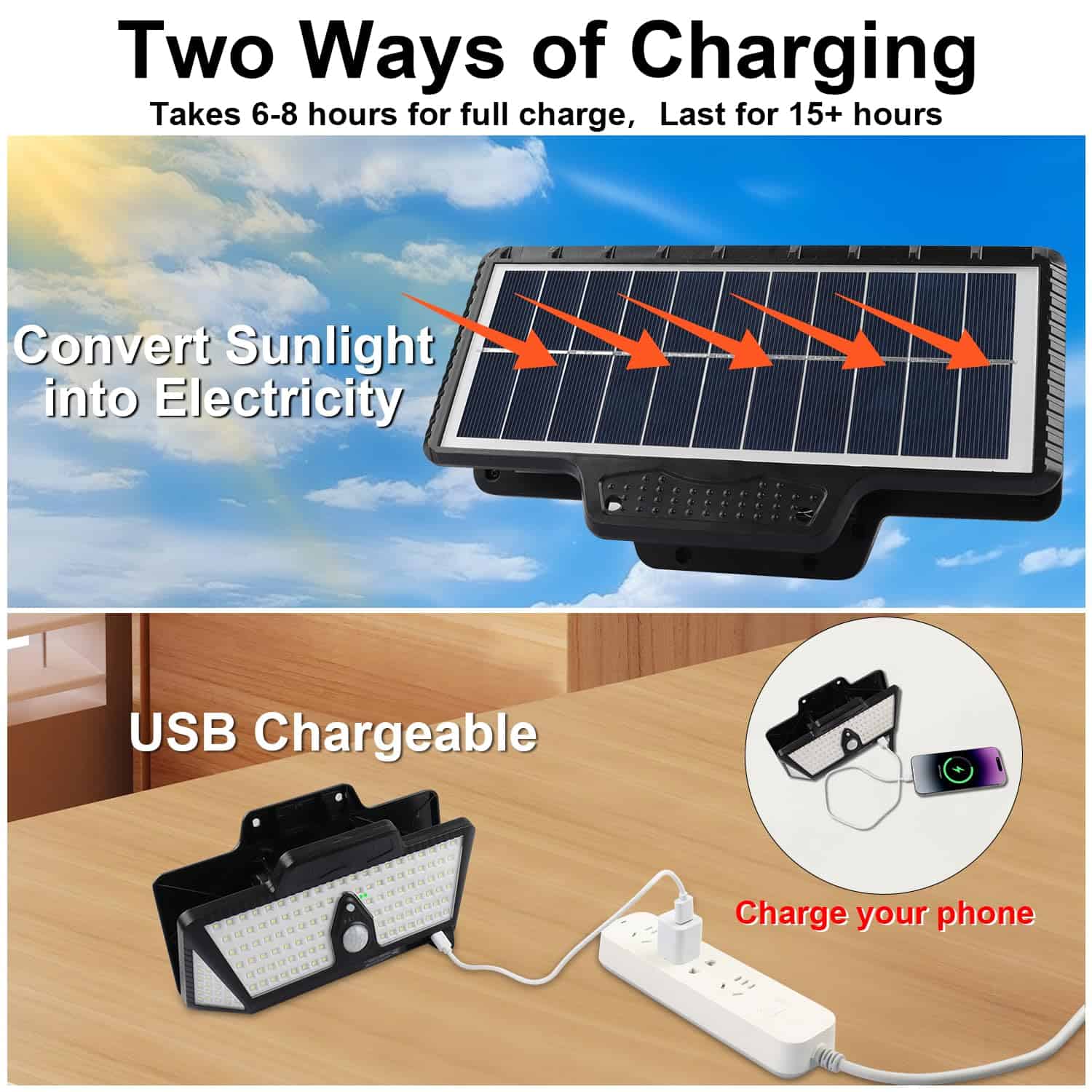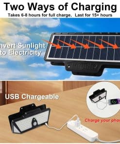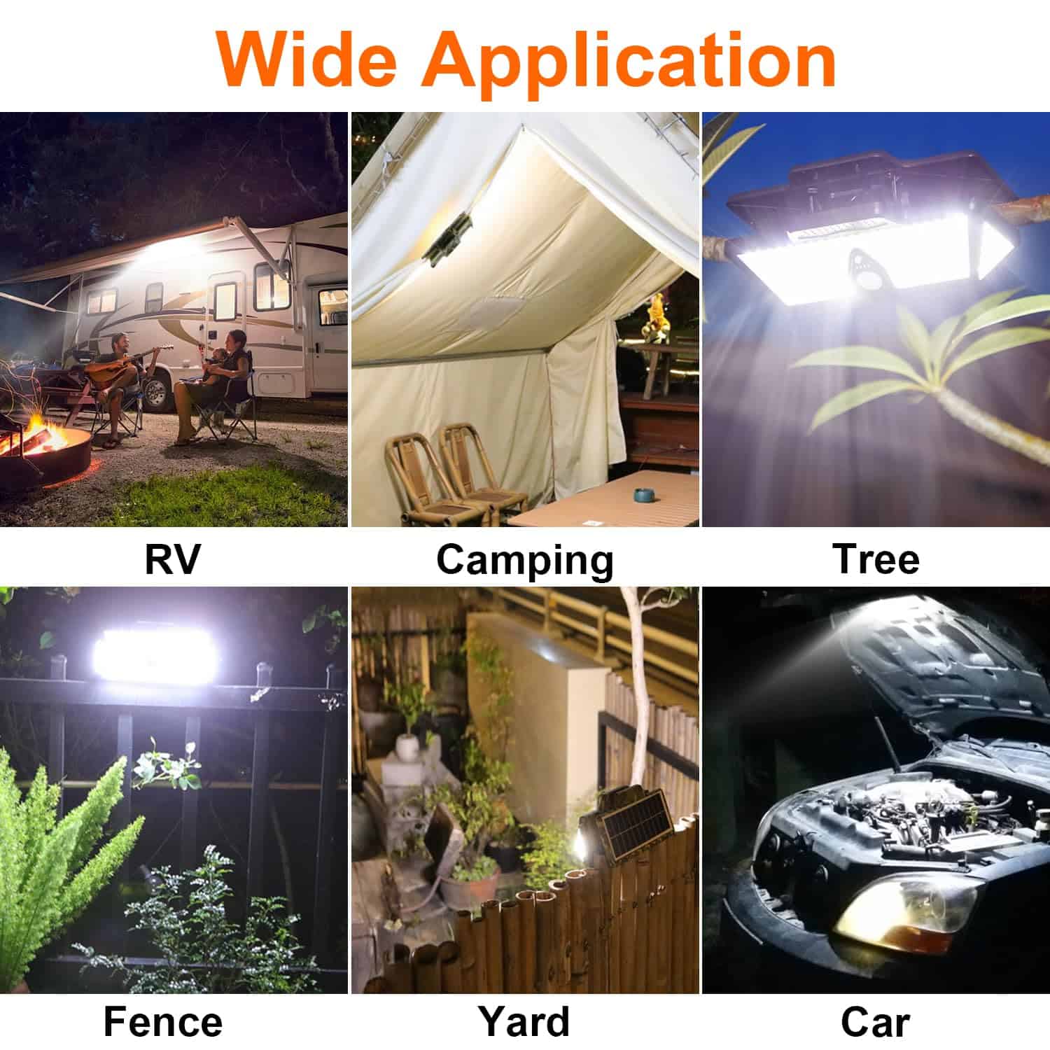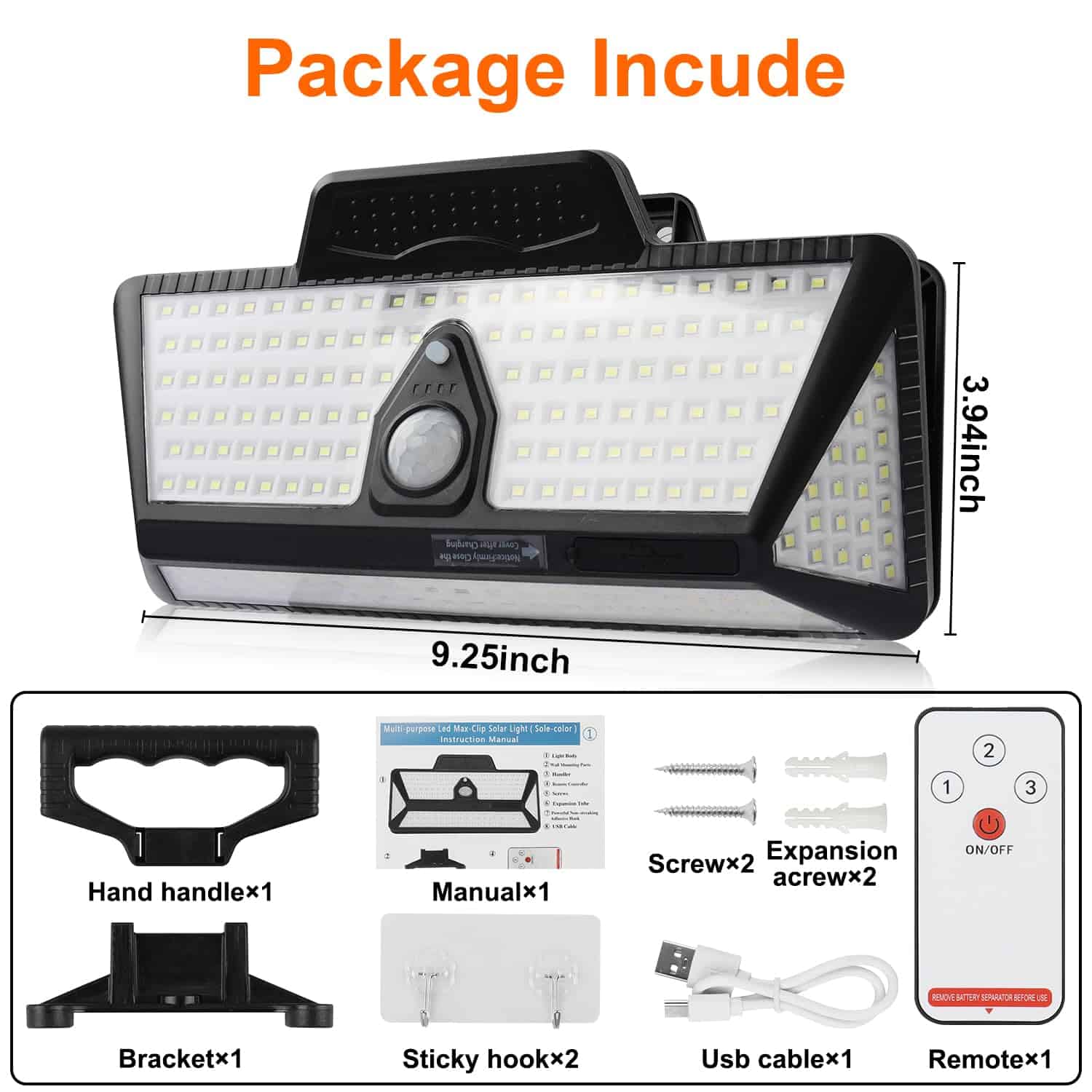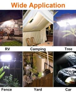 1. Luz de RV con sensor de movimiento de 3 modos: el sensor de movimiento PIR puede detectar movimiento en un rango de 16.4 pies, una vez que se detecte su movimiento, la luz solar se encenderá automáticamente en la oscuridad, y cuando no se detecte movimiento, la luz solar se apagará automáticamente. Hay tres modos de iluminación para elegir, que se pueden ajustar fácilmente con el control remoto o el pequeño botón blanco de encendido/apagado en la luz para satisfacer sus diferentes necesidades. 2. Panel solar de alta eficiencia: las luces exteriores solares para rv utilizan paneles solares de silicio monocristalino mejorados con una tasa de conversión de energía solar de hasta el 30% y una carga más rápida, se puede cargar completamente en 8 horas bajo la luz solar directa; cuando no haya luz solar, se puede cargar completamente en 5-6 horas con un cable de carga USB. Las luces exteriores del camper tienen una batería de alta capacidad de 6000mAh que puede proporcionar hasta 15 horas de iluminación por la noche. 3. Iluminación de ángulo amplio: la luz de porche solar para rv consta de 208 perlas LED súper brillantes, con un brillo de hasta 1000LM, proporcionando una iluminación de ángulo amplio de 300 y un rango lumínico de hasta 150 pies cuadrados. Las luces del remolque cerrado con puerto de salida USB se pueden utilizar como una fuente de alimentación de respaldo en caso de emergencia para cargar teléfonos y otros dispositivos de 5v. 4. Impermeable IP65: las luces exteriores del rv están hechas de material impermeable IP65, que puede soportar diferentes condiciones climáticas. La luz solar del campista se enciende automáticamente cuando está oscuro; se apaga automáticamente cuando está iluminado y entra en el estado de carga, lo que es adecuado para muchos lugares con diferentes necesidades de iluminación, proporcionando gran comodidad para usted en un ambiente oscuro. 5. Instalación fácil: hay cinco métodos de instalación para las luces exteriores solares para rv: clip, gancho, tornillo, portátil y trípode, que pueden satisfacer sus diferentes necesidades. Se puede utilizar no solo en campistas, RV y remolques de viaje, sino también en patios, jardines, garajes, entradas, puertas delanteras, terrazas, cercas, ramas de árboles y donde desee.