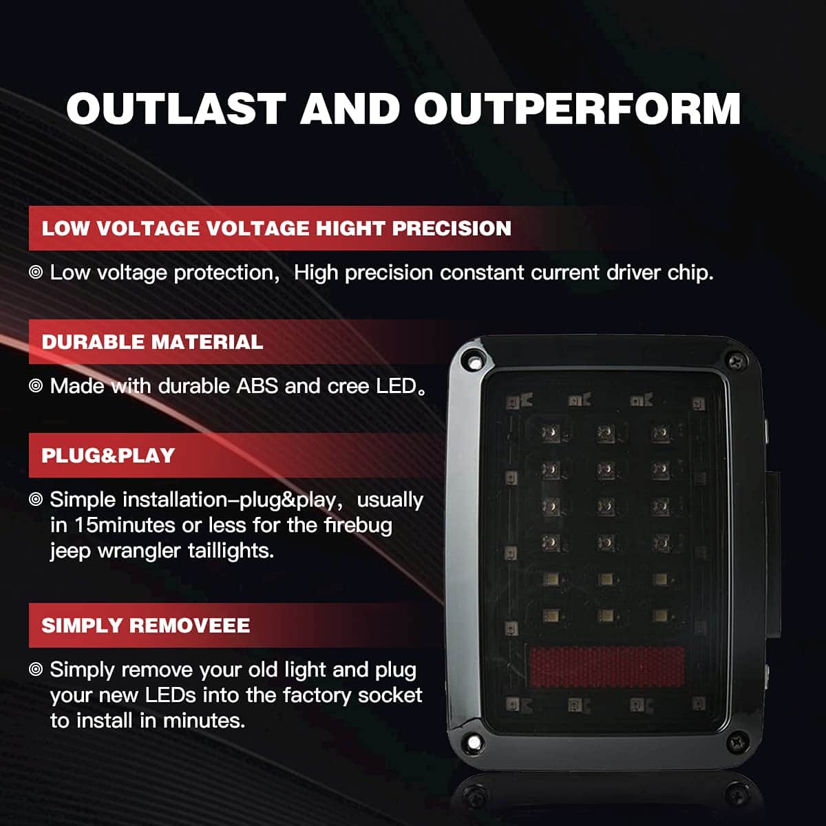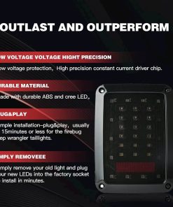 Compatible con Jeep Wrangler JK de 2 puertas 07-18 y Jeep Wrangler Unlimited JK de 4 puertas 07-18. ¿Por qué elegir las luces traseras LED de JHLion? Plug and play, no se requiere taladrar, compatible con DOT, nuevo diseño, alto brillo, tiempo de respuesta rápido de 12 horas, bajo costo pero alta calidad, vida útil de más de 50,000 horas. Para los clientes de JHLion: Simplemente encuentra los detalles del pedido para contactar al vendedor si tienes consultas sobre las siguientes situaciones: No se ajusta a tu vehículo. Se empañan o la luz se apaga. Luces defectuosas o rotas. Faltan algunos accesorios o piezas. Causa código de falla, código de problema, parpadeo o flash hiperactivo. El faro no se ajusta al bisel o al soporte del faro original. Paquete incluido: 2 luces traseras LED de 7 pulgadas, 2 adaptadores H4 a H13, 2 x pegatinas exquisitas, guía de instalación.
