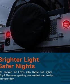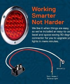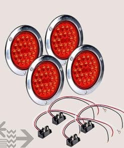No pierdas tiempo Cuando estás decidiendo si deberías actualizar a LED, una consideración importante es el tiempo invertido vs. la recompensa. Vamos a hacerlo fácil para ti. Nuestras luces son estándar de la industria de 4 pulgadas, por lo que no se necesita ninguna modificación para instalarlas. El bisel incluido bloquea rápidamente tus luces en su lugar y las luces son un reemplazo directo, cable por cable, para tus luces de freno de doble filamento/luces de giro/luces de estacionamiento. No hay nada más fácil que esto. Tamaño estándar, habilidades no estándar ¿Hacen que valgan la pena la pequeña inversión de tiempo todas estas características! 24 LED rojos súper brillantes detrás de una lente de policarbonato difuminada superan a las bombillas estándar y te hacen más visible y seguro por la noche, en la niebla y en la lluvia. Y hablando de la lluvia, nuestras luces son sumergibles y tienen una calificación impermeable IP67 para que no tengas que preocuparte por el clima o el lago. ¿Pueden tus luces traseras actuales hacer todo esto? Sí, funcionarán para ti ya sea que estés actualizando tu tractor, remolque o Jeep, estas luces son la elección ideal. Incluso si estás trabajando en un espacio reducido, como en la parte trasera de un Wrangler, nuestro conector de 90 grados te tiene cubierto. Y como nuestras luces están certificadas por SAE y DOT FMVSS-108, puedes estar seguro de que son un ajuste perfecto y completamente legales. Características – Certificadas por SAE y DOT FMVSS-108 – Tamaño estándar de la industria – 24 LED rojos con lente roja – Clasificación impermeable sumergible – Bisel y conector de acero inoxidable incluidos – Funciones de estacionamiento/giro/freno – Garantía de 12 meses Lo que se incluye (4) Luces traseras redondas de 4 pulgadas con 24 LED con bisel de acero inoxidable – Rojo (1) Luz trasera redonda de 4 pulgadas (1) Bisel de acero inoxidable y tornillos (1) Conector de 3 pines (1) Manual de instrucciones