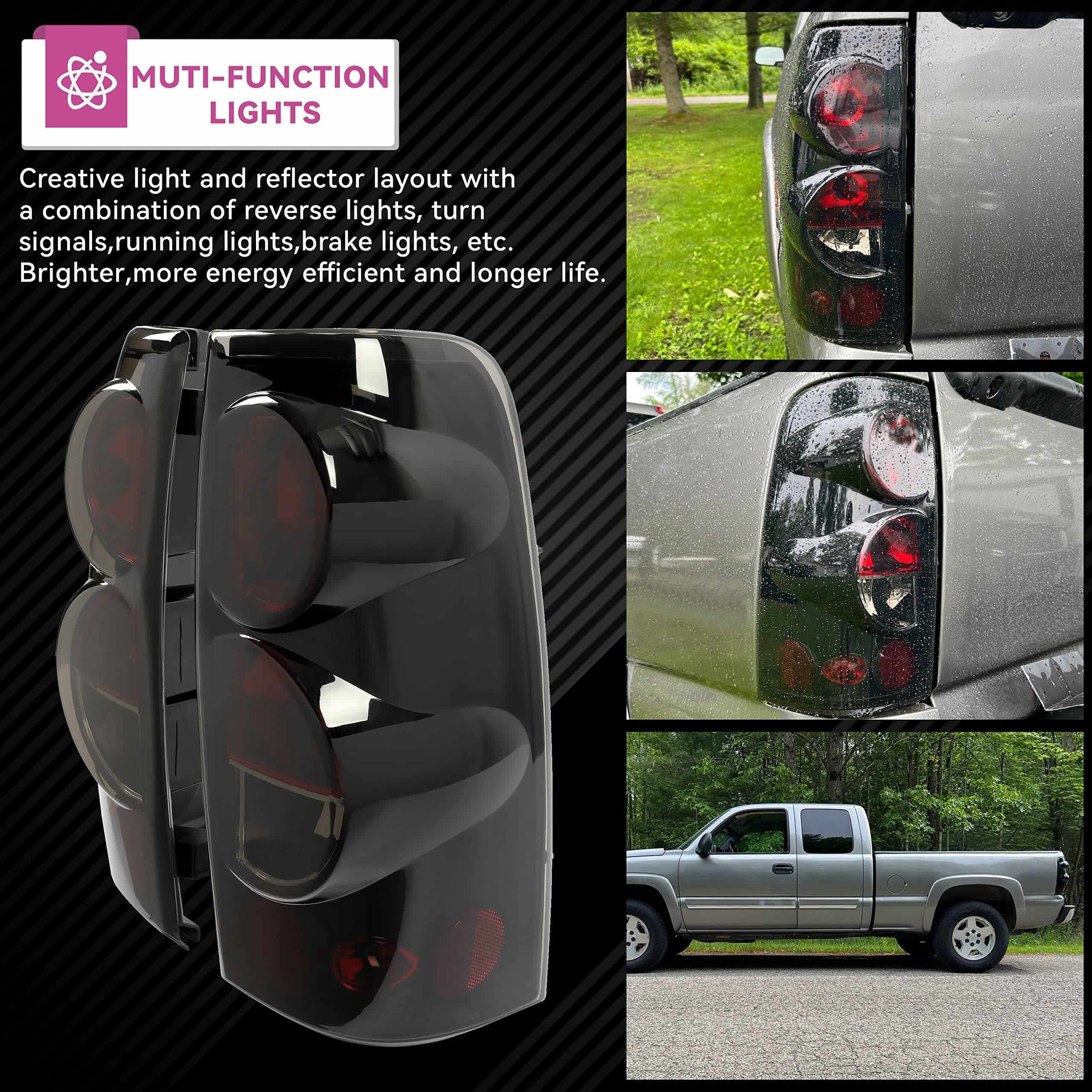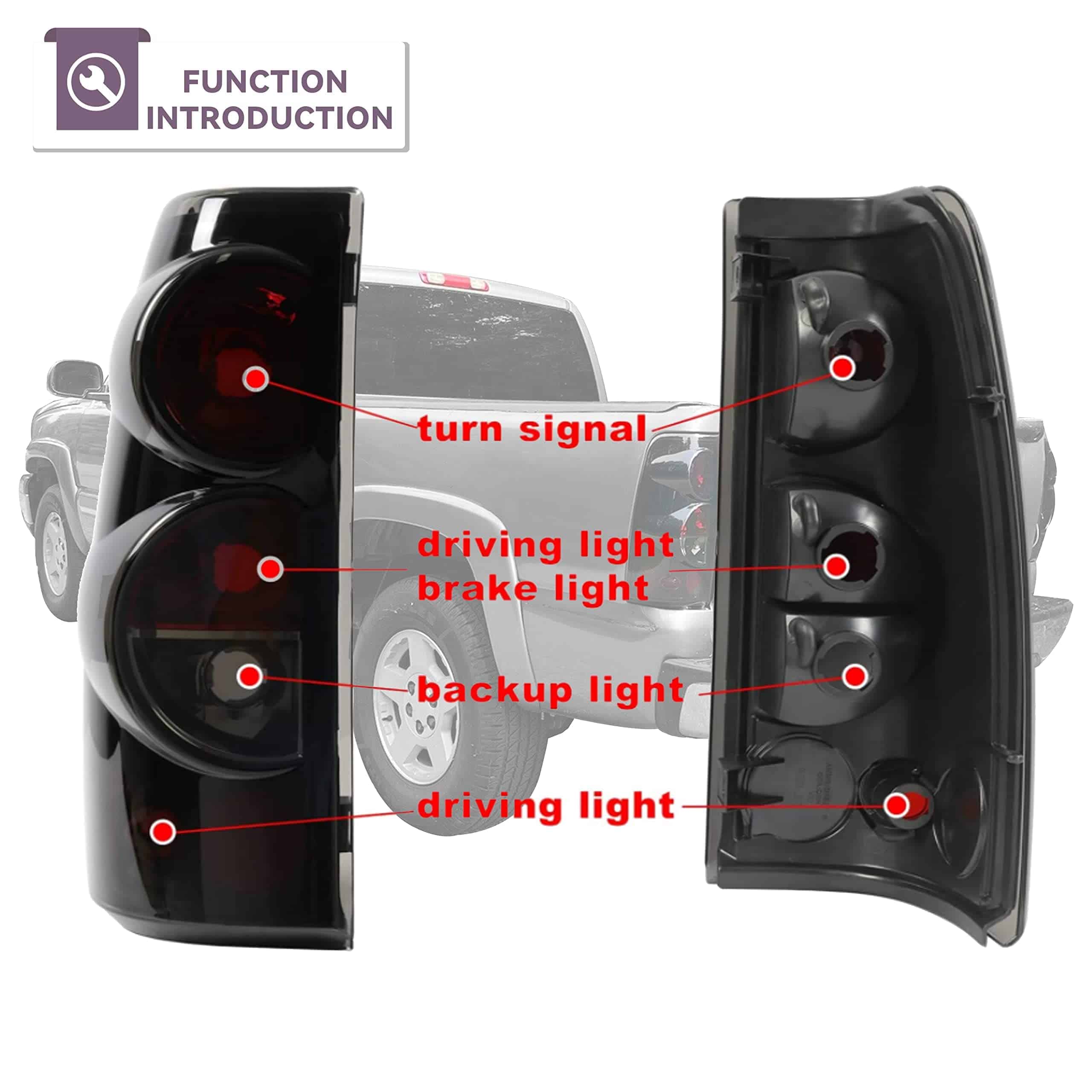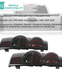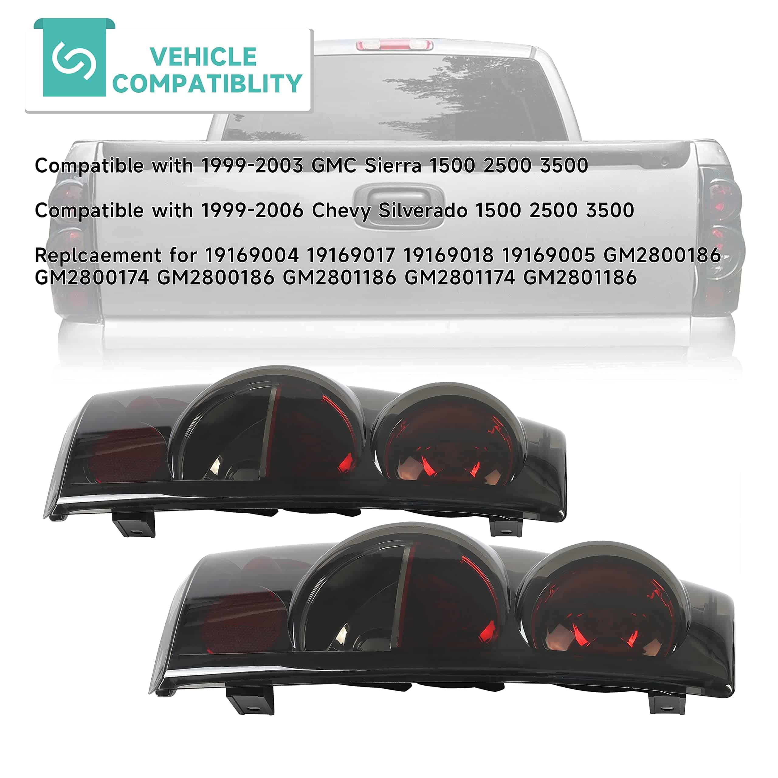 1. Ajuste: luces traseras de freno de estacionamiento de señal de giro compatibles con GMC Sierra 1500/2500/3500 1999-2003, Chevy Silverado 1500/2500/3500 1999-2006, Chevy Silverado Classic 2007. Ajuste para cama Fleetside con 4 puertos de enchufe. NO COMPATIBLE con el modelo de cama Stepside. Para modelos antiguos con solo 3 enchufes, puede ser necesario agregar tapas adicionales para tapar el enchufe de la marca lateral.