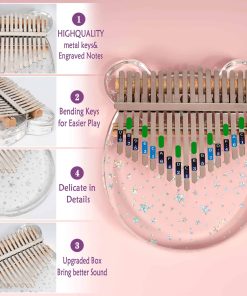1. Kalimba de cristal transparente de 17 teclas: Este piano de pulgar kalimba 17 teclas tiene una forma extremadamente linda de oso con cuerpo de acrílico transparente y 17 teclas de acero al carbono, brindándote una mejor sensación de audición, visión y tacto. Para facilitar el aprendizaje, las 17 dientes de metal adoptan el diseño de ajuste C estándar internacional, solo necesitas tocar notas al azar para hacer un sonido encantador.