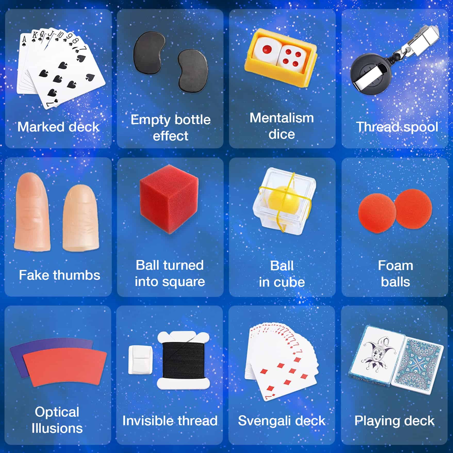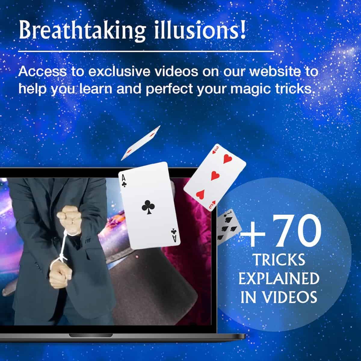 Set de magia de nivel principiante: El kit de iniciación a la magia LUGY es una colección completa de 70 trucos de magia espectaculares aptos para principiantes e magos de nivel intermedio. Está diseñado para proporcionar momentos interminables de diversión y entretenimiento para niños y adolescentes. Este set de magia abarca una amplia gama de temas mágicos, incluyendo levitación, ilusión, mentalismo, magia callejera y emocionantes trucos de cartas nuevos. Con tanta diversidad, puedes sorprender a tu audiencia con trucos inesperados y asombrosos. Más allá del valor de entretenimiento, nuestro set de magia para niños sirve como un juego educativo. Ayuda a desarrollar concentración, construir autoconfianza, reducir el nerviosismo en el escenario, mejorar la creatividad y las habilidades de hablar en público. Este kit de juguete de aprendizaje de magia es un regalo excelente para cumpleaños o Navidad. Despierta la imaginación y el sentido de la maravilla en niños y adolescentes, animándolos a inventar nuevas formas de sorprender y asombrar a sus seres queridos. El paquete de inicio de magia LUGY incluye 14 accesorios mágicos y acceso a tutoriales en video exclusivos en nuestro sitio web. Estos tutoriales en video hacen que sea fácil para los principiantes aprender y dominar cada truco.