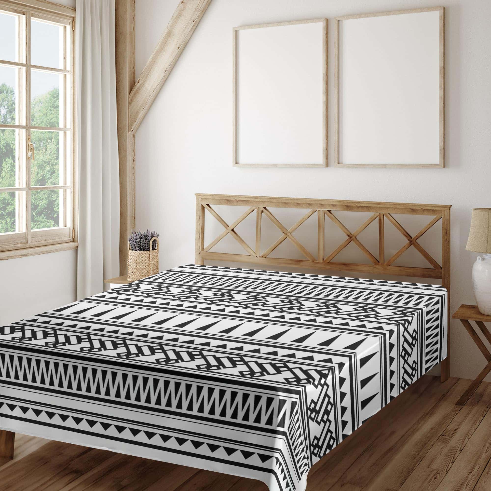 Lunarable Aztec Flat Sheet, Geometric Maori Pattern Borders Sharp Edged Arrows Triangles and Stripes Design. Transforma la apariencia de tu habitación con nuestra sábana plana de Lunarable. Diseñado con impresiones de alta calidad, es la manera perfecta de actualizar tu espacio. Hecho de tela de microfibra cepillada, este sábana proporciona la máxima comodidad y suavidad, lo que lo convierte en una opción ideal para tu dormitorio o habitación de invitados. La sábana es extragrande y ligera para que puedas meterla fácilmente debajo de la cama. Además, es lavable a máquina, lo que la hace fácil de cuidar y mantener. Aporta un toque de estilo y comodidad a tu cama con esta elegante sábana plana de Lunarable.
