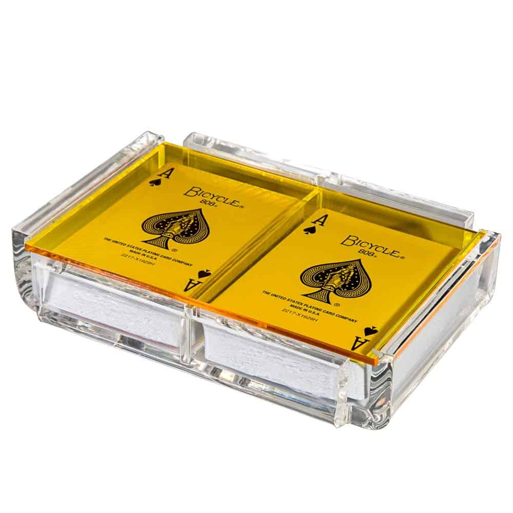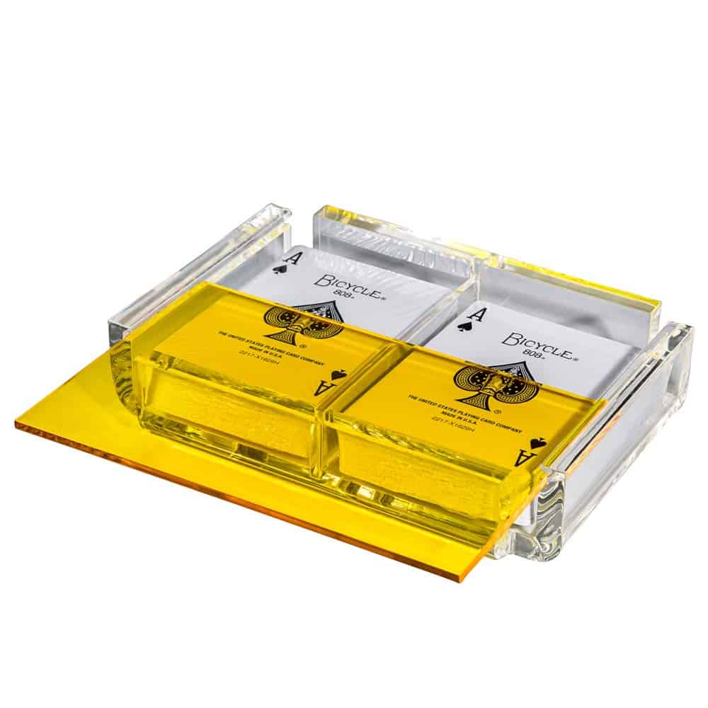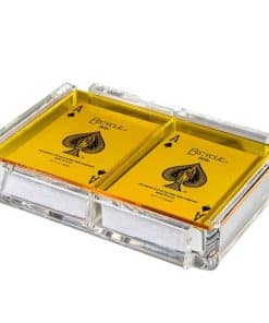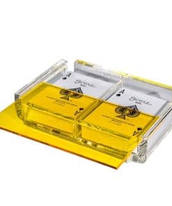 La Pinta es nuestro soporte de mazo de cartas de juego en una hermosa pieza acrílica moderna con una tapa de color. Este soporte/tray de cartas único viene con 2 mazos de cartas de juego Bicycle. Es ideal para cualquier tipo de ocasión, ya que es muy útil y práctico. Sirve como una gran idea de regalo para cualquier persona que quiera jugar cualquier tipo de juego de cartas como póker, black jack, bridge, espadas e incluso go fish!