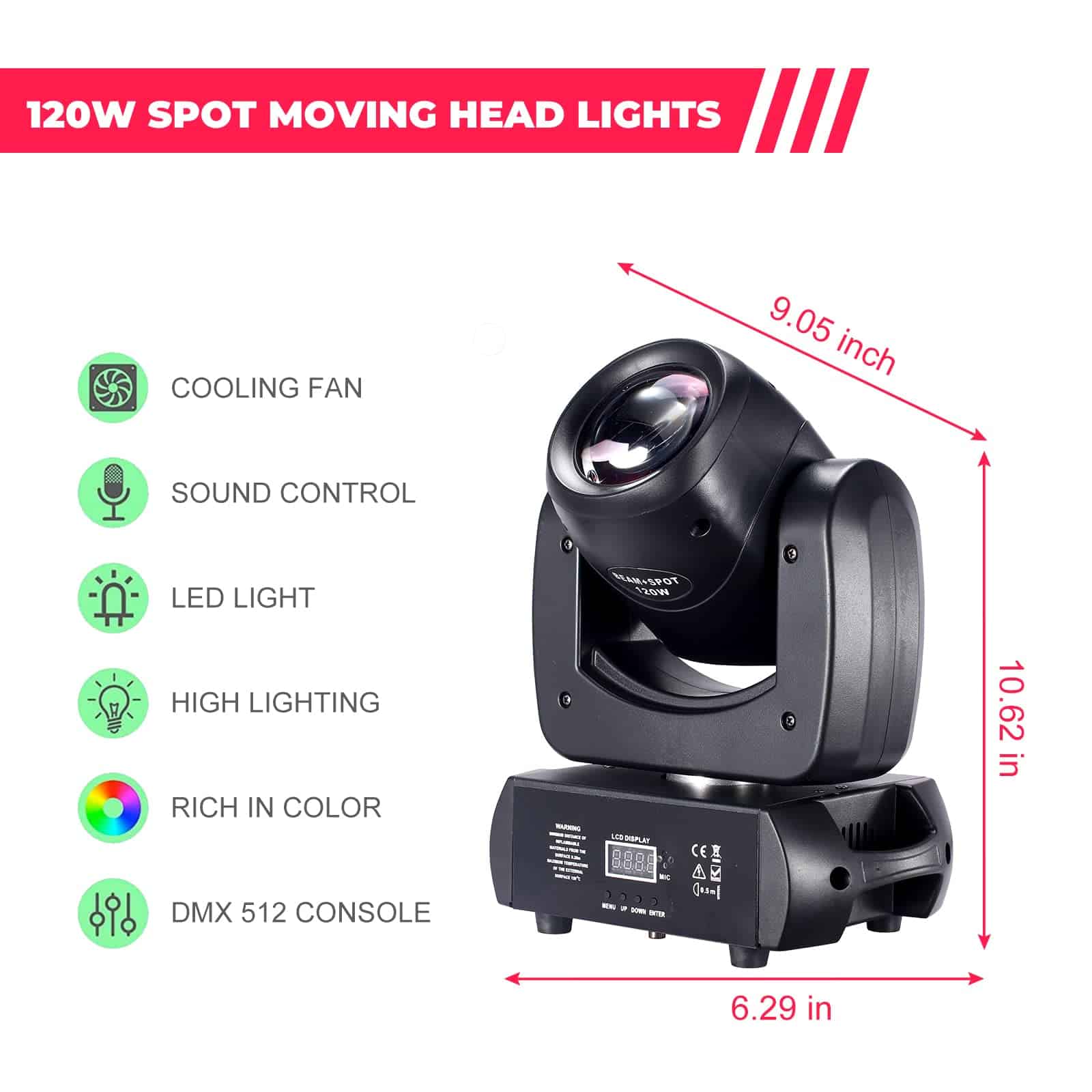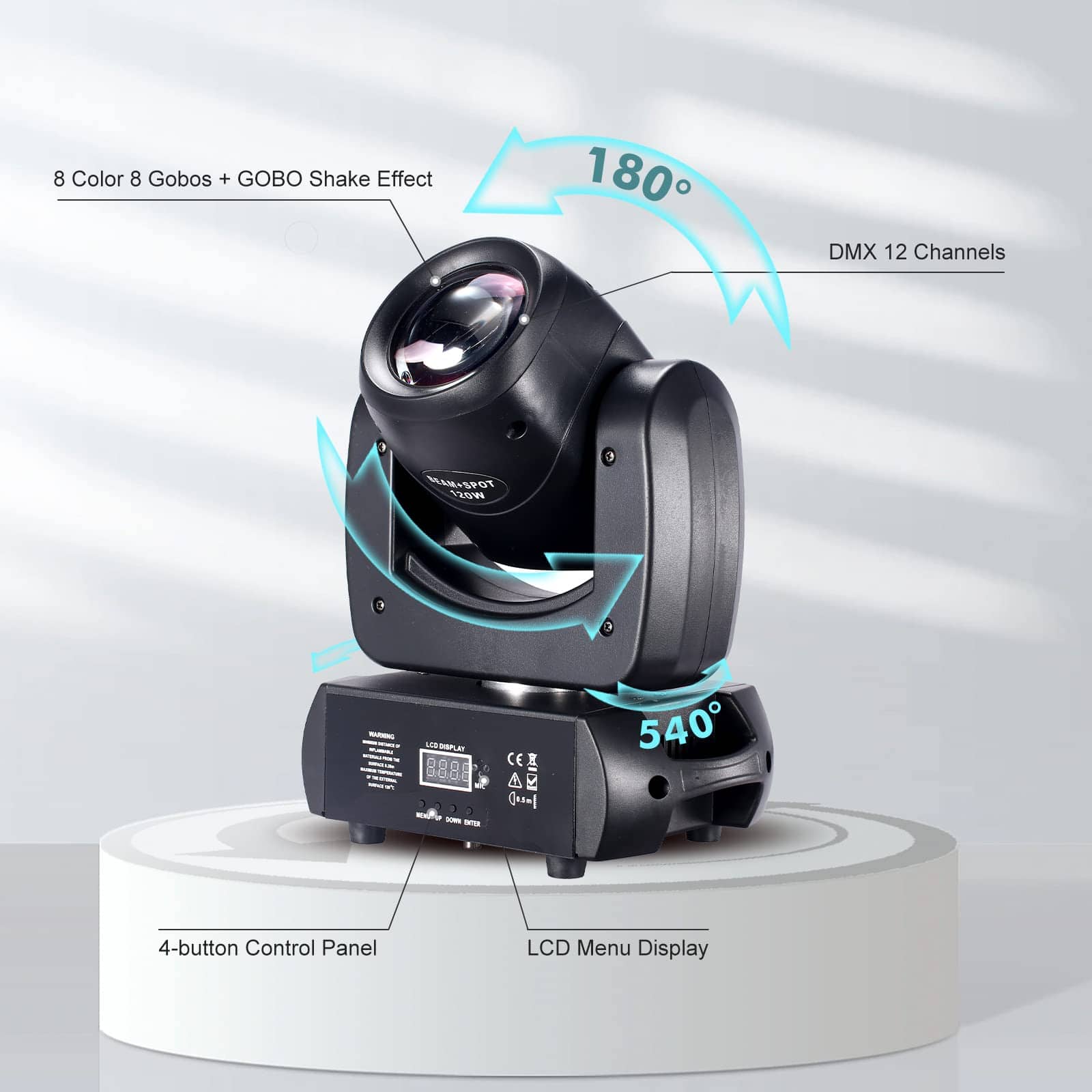 1. BRIGHTNESS EFFECT Esta luz estroboscópica de gobos viene con una fuente LED blanca de 120W (8 colores monocromáticos) 1.5 ángulo de haz; 25 veces/seg estroboscópico puede enriquecer al máximo el efecto de escenario. 2. 8 PRISMAS GIRATORIOS Esta luz de escenario de gobos de haz de 120W tiene 8 colores + 8 gobos con efecto de medio color y rotación infinita (no zoom). 0~100% suavizado super dimming efecto de lavado de gobos o efecto de haz completo. Efecto de rotación de prisma de 8 facetas (efecto de haz de prisma) para varios efectos de escenario. 3. FÁCIL DE INSTALAR Hay dos tornillos de montaje en la parte inferior de la luz de cabeza móvil, soportes estables y cable de enchufe estándar de EE. UU. de 1.2 m y cable dmx de 1 m. Este equipo de etapa y sonido se puede instalar en el truss o la pared. Simple y conveniente, la instalación se puede completar en un minuto. 4. 4 MODOS DMX512, Automático, Control de Sonido, Maestro/Esclavo. Pan: 540 ,Tilt: 180 12 canales. La luz de cabeza móvil LED es muy adecuada para controlar luces de escenario en diferentes ocasiones, como bodas, DJs, clubes, KTV, bares, conciertos, bares, banquetes, cumpleaños, ceremonias, etc. 5. GARANTÍA DE SERVICIO Las luces de disco tienen un sistema de refrigeración de alta calidad para evitar daños en la lámpara LED debido al sobrecalentamiento (se adjuntan instrucciones). Si tiene alguna pregunta, comuníquese con el correo electrónico de posventa de DJXFLI sin dudarlo. Responderemos dentro de las 24 horas y le ayudaremos a resolverlos.
