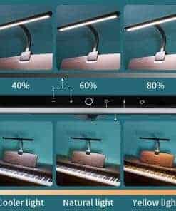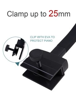La lámpara tiene una vida útil prolongada de hasta 50000 horas y un ahorro energético del 80%. La interfaz táctil de esta lámpara de piano es sencilla y fácil de operar. Utiliza el modo táctil y divide la temperatura de color en modos fríos y cálidos, pudiendo ajustar el brillo en cada temperatura de color. También puedes configurar la función de memoria según tu modo de iluminación favorito, para que la próxima vez que enciendas la lámpara de piano lo hagas en el modo que configuraste. La abrazadera se ajusta hasta 25mm y el cable del adaptador incluido tiene una longitud de 2.5m.