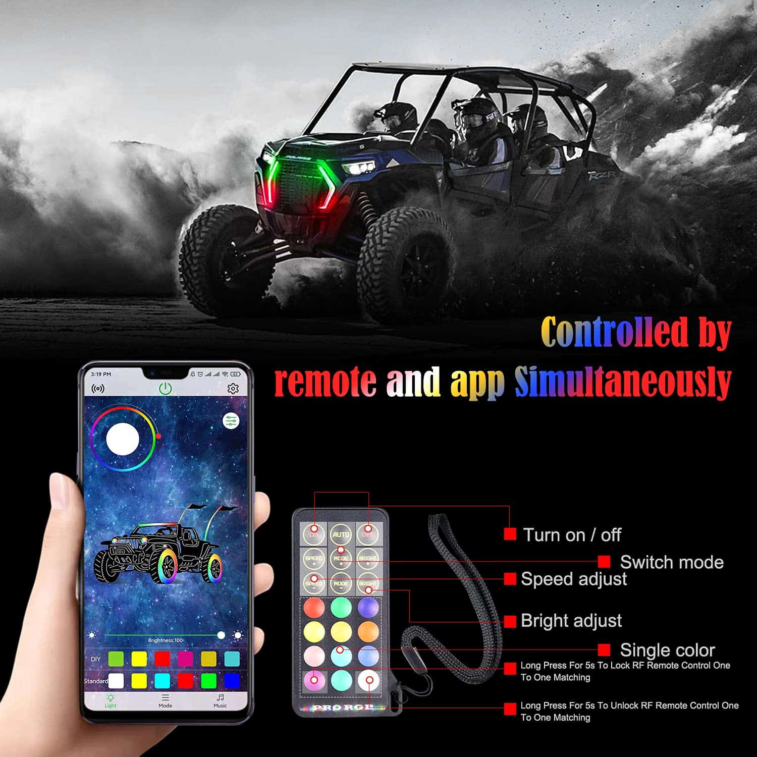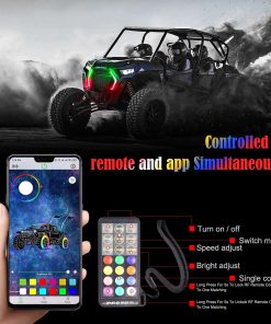 4. Control dual Controlado de forma inalámbrica a través del control de APP, compatible con iPhone o Android. El color en movimiento crea un brillo colorido y deslumbrante. Además, puedes cambiar modos, brillo, velocidad de destello y ajustar colores a través del control remoto según tus preferencias.