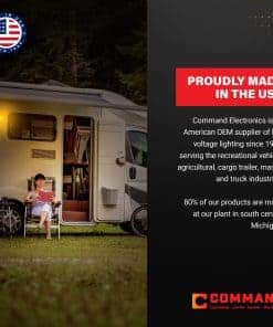 Combinación de elegancia y alto rendimiento envuelta en un paquete elegante. Cuenta con una lente de policarbonato irrompible para resistir el uso diario y puede instalarse fácilmente horizontal o verticalmente para ajustarse a cualquier disposición. La base cuenta con ocho agujeros de montaje disponibles para adaptarse a varias superficies de montaje. Todos nuestros productos están diseñados y fabricados bajo estricto control de calidad y cumplen con la regulación del Departamento de Transporte FMVSS108. Somos expertos en iluminación de bajo voltaje LED, incandescente y fluorescente para las industrias de vehículos recreativos y remolques. Eso es lo que hacemos, y lo hacemos bien. Command Electronics es un fabricante y distribuidor estadounidense de iluminación y accesorios de 12 voltios para las industrias de vehículos recreativos, agrícolas, remolques de carga, marinas y camiones. El 80% de nuestros productos se fabrican en nuestra planta en el centro sur de Michigan. Desde 1969, hemos suministrado iluminación de bajo voltaje a varios clientes OEM. Dimensiones de 4.5″ de diámetro y 0.75″ de profundidad, esta luz es del tamaño perfecto para una solución de iluminación sutil pero potente. Está diseñada para un sistema de 12V y ofrece una bombilla LED para eficiencia. El perfil bajo de la unidad la hace ideal para espacios que requieren una apariencia limpia, discreta con un interruptor conveniente. ID de parte: 001-1053