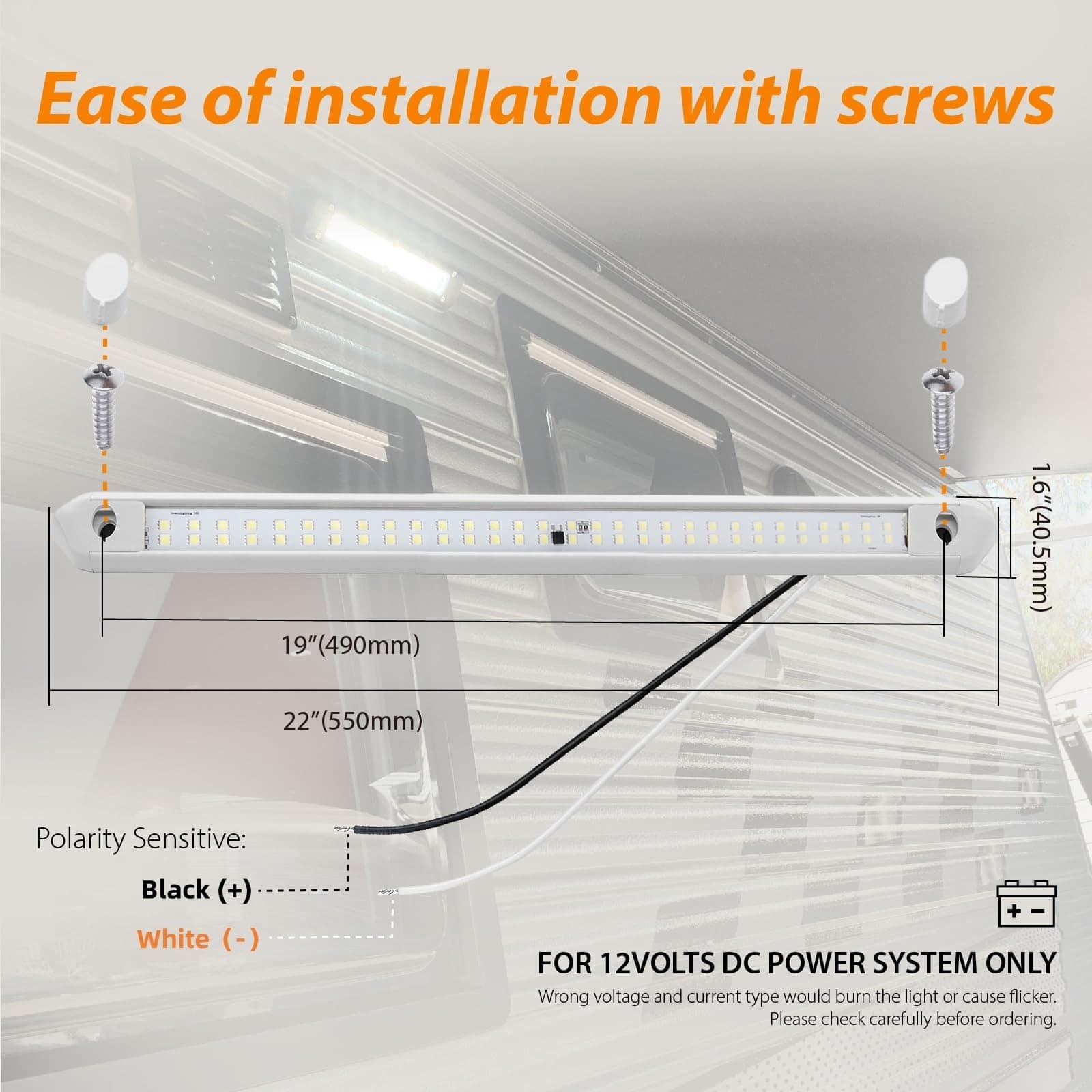 1. Iluminación de bajo voltaje de 12 voltios para espacios exteriores: perfecta para RVs, barcos, remolques y exteriores de hogares, esta delgada luz LED para toldos de 22 pulgadas opera de forma segura en sistemas de energía de CC de 12 voltios. Su compacta carcasa de aluminio de 1.2″W x 1.6″H se adapta perfectamente bajo toldos, patios o camarotes marinos. Ideal para entornos de bajo voltaje, brinda una iluminación brillante y eficiente sin sobrecargar circuitos.