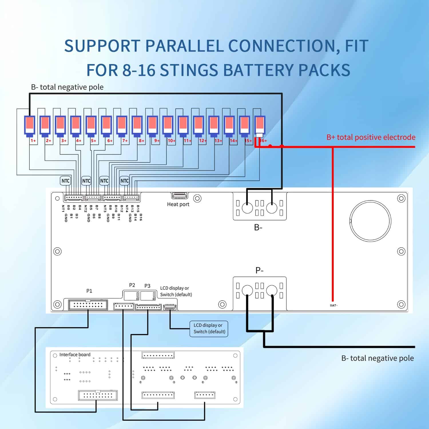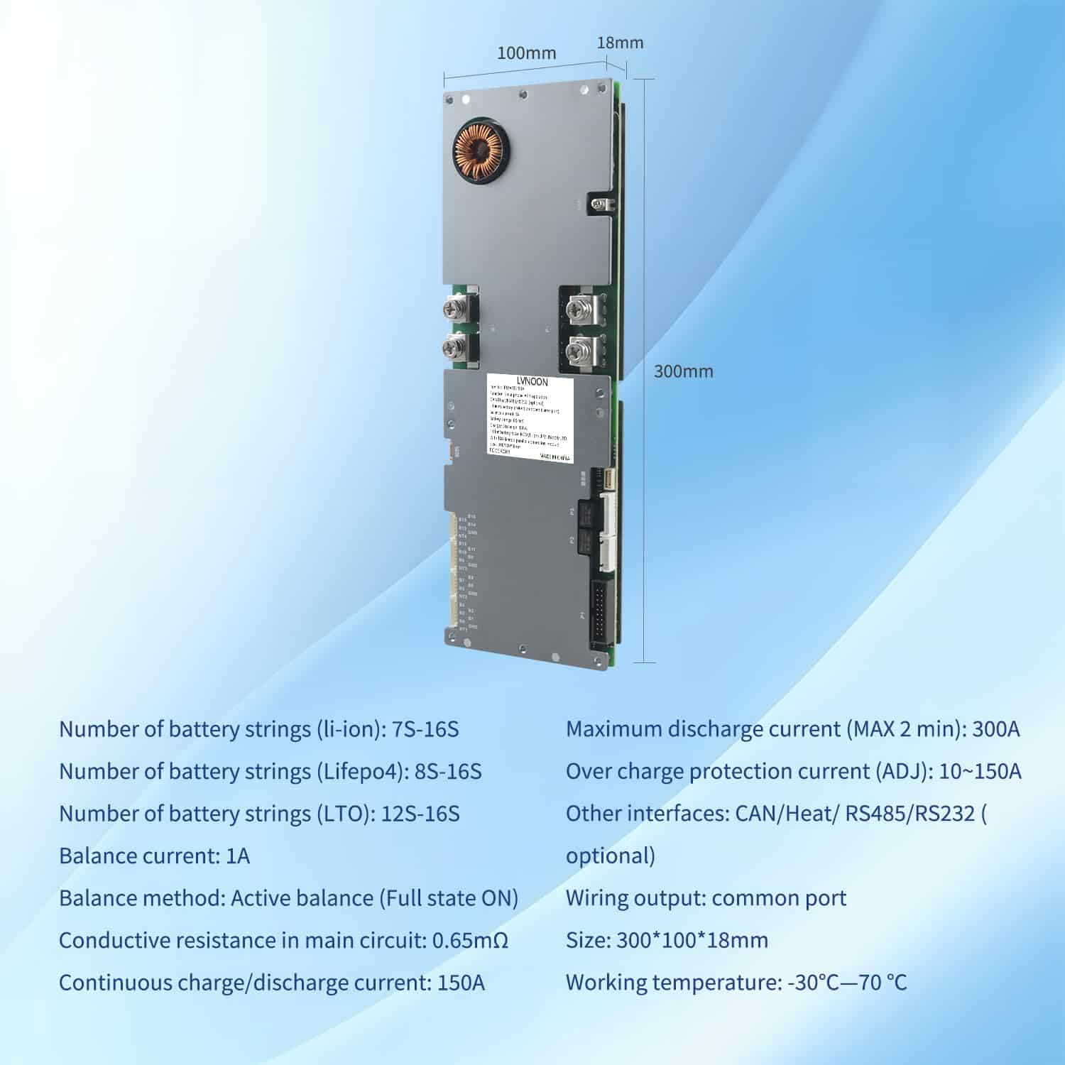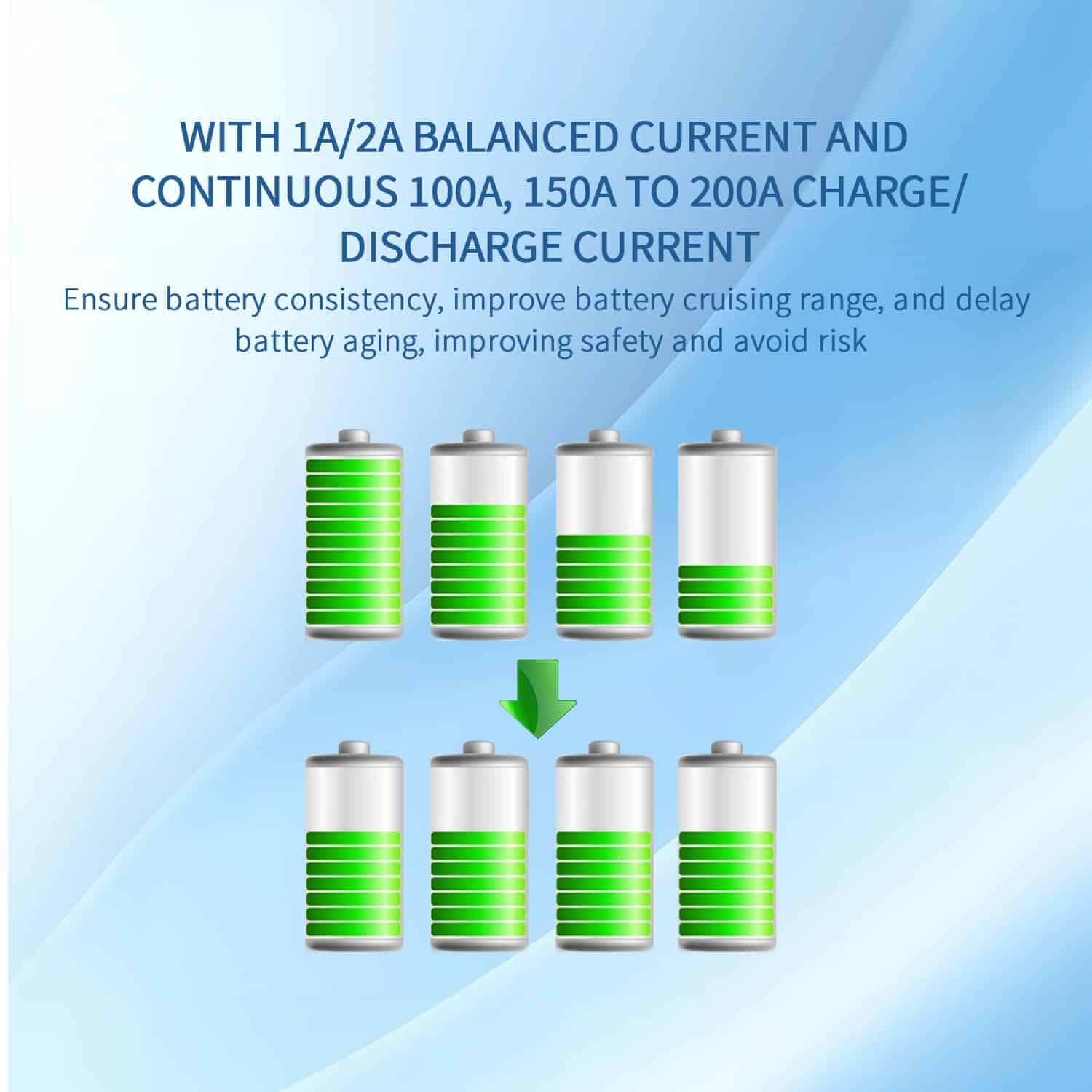 2. Adecuado para 7S a 16S 1V-5V tipos de baterías Li-ion NCM LFP/LiFePo4 LTO. Soporte de conexión en paralelo, con módulo de conexión en paralelo limitado de 10A, apto para uso de voltaje de 24V a 60V. Expanda libre y seguramente la capacidad de la batería con corriente de balance activo de alta eficiencia. Soporte de rango de voltaje de una sola celda de batería 1V~5V, precisión de ecualización 5mV con alta precisión de adquisición de voltaje (20mV) y alta precisión de adquisición de corriente (2%@FS).