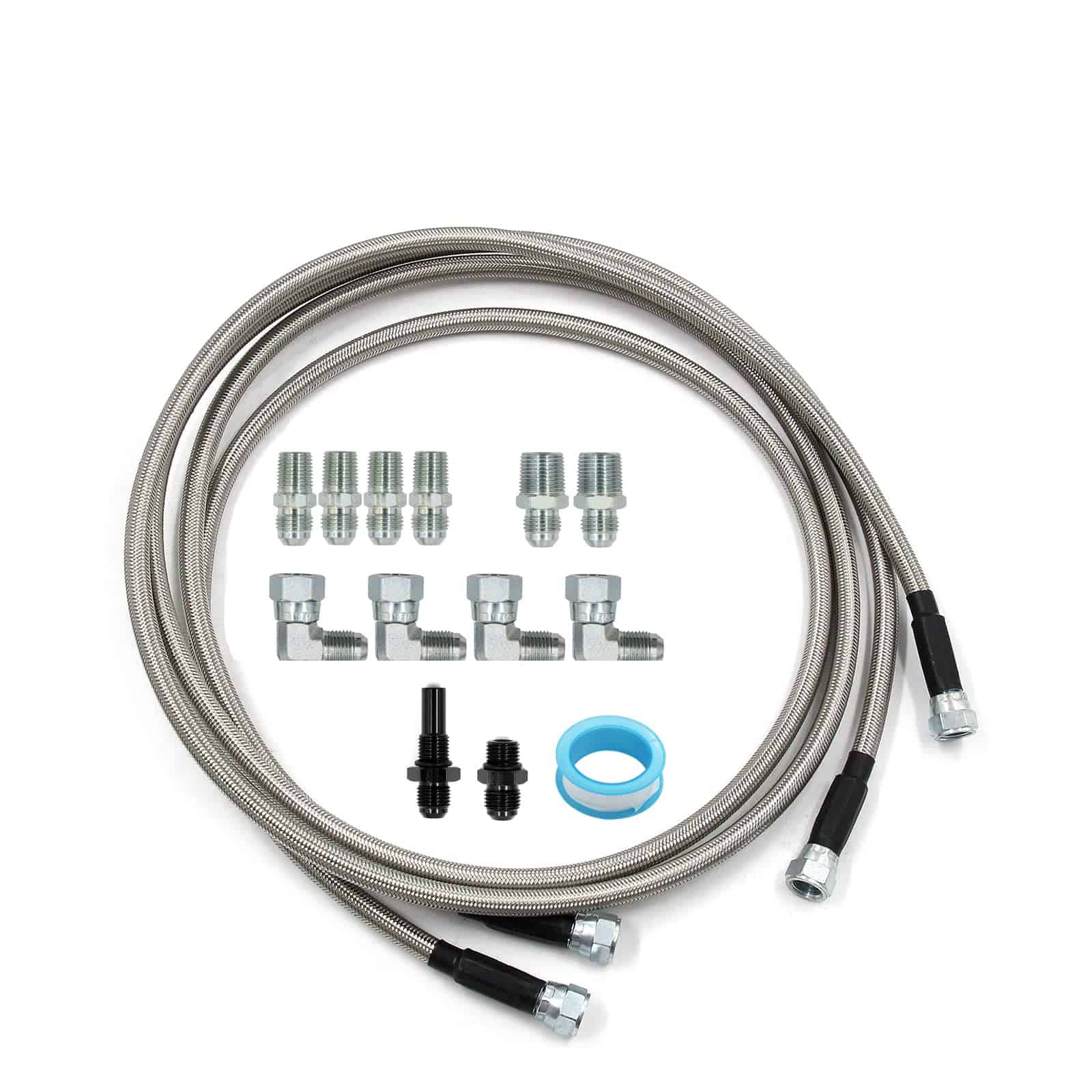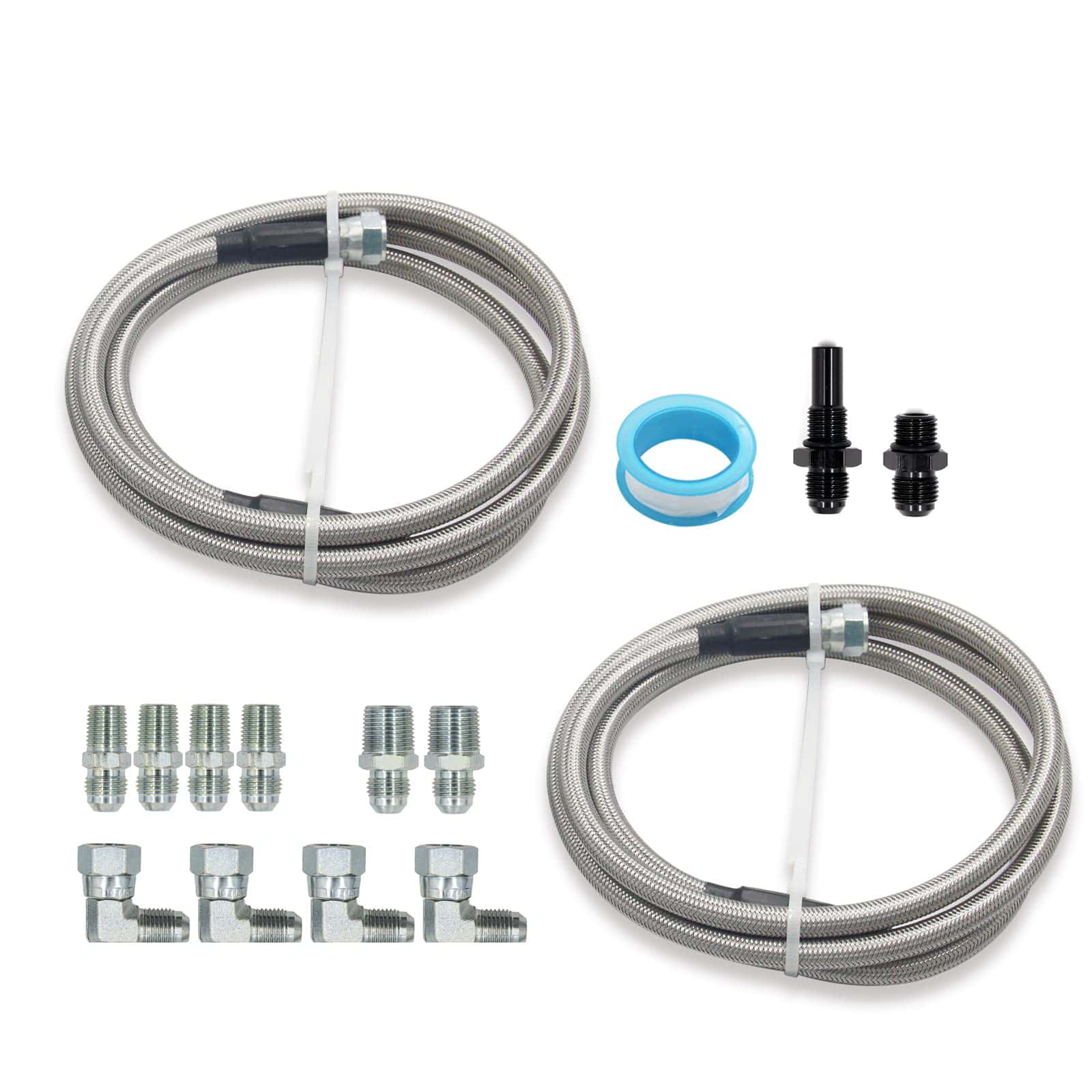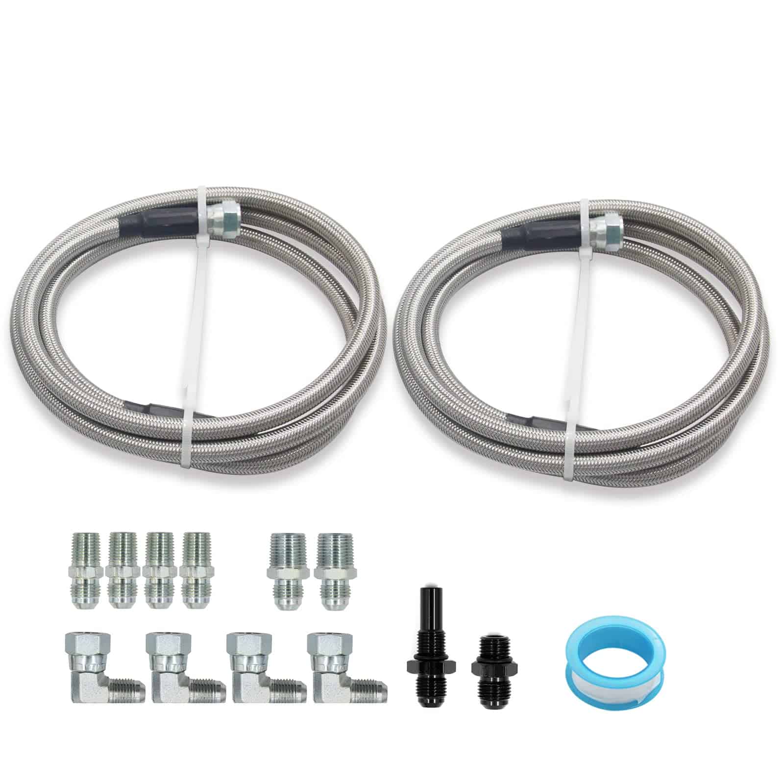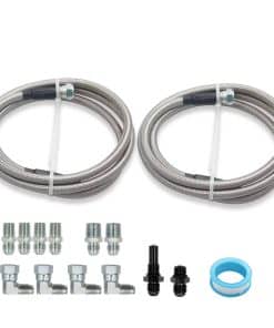 Compatibilidad Se adapta a Turbo 350 (Algunos son de 1/4″ NPT) Se adapta a Turbo 400 Se adapta a Turbo 200 – 200R4 Se adapta a Power Glide (Algunos son de 1/4″ NPT) Se adapta a 700R4 – 4L60 – 4L60E – 4L65E Se adapta a 4L80E: 1996 y posteriores Se adapta a Ford C4 – C6 – AOD La mayoría de los vehículos universales, incluidos autos y camiones Chevy Ford Mopar GM GMC Buick Cadillac. Mangueras/líneas de transmisión trenzadas flexibles de acero inoxidable; SOLO se ajustan a la transmisión 4L80E de 1996 y más reciente; Cada manguera de 3/8″ de diámetro interno tiene aproximadamente 70″ de largo con extremos invertidos AN-6; Mangueras -6AN con extremos giratorios: 7/16 O.D. y 3/8 I.D