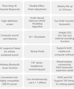 M-KVIVE Black Pedal Box: Tu efector de guitarra / bajo portátil y todo en uno. Desata tu creatividad con Black Pedal Box, un efector de guitarra y bajo multifuncional diseñado para elevar tu rendimiento y sonido. Con 80 presets completamente personalizables, puedes personalizar tu cadena de efectos y guardarlos para uso futuro. Su batería incorporada asegura hasta 10 horas de reproducción continua con una carga completa, lo que hace que Black Pedal Box sea perfecto tanto para entornos de estudio como en vivo. Black Pedal Box cuenta con potentes módulos de efectos, incluyendo: Puerta de ruido Aumento Compresor Módulo AMP (Ganancia, Nivel, Bajos, Medios, Agudos) 7 Modulaciones (Coro, Fase, Trémolo, Flanger, Vibrato, Univibe, Autofiltro) 5 Retardos (Analógico, Retardo de disminución, dTape, Retardo de cinta, Doble retardo, Retardo Lofi) 6 Reverberaciones (Sala, Hall, Hinchada, Resortes, Brillo, Nube) 20 ranuras IR CAB Editar y compartir con facilidad Black Pedal Box está totalmente integrado con software de escritorio y aplicaciones móviles. Descárgalas desde el sitio web oficial para: Editar y cambiar preajustes Importar / exportar archivos IR Actualizar firmware Restaurar configuraciones de fábrica Admite transmisión inalámbrica de música BT, monitoreo con auriculares y funciona como una tarjeta de sonido de ordenador, lo que lo hace versátil en cualquier entorno. Grabación de audio sin problemas Black Pedal Box también puede funcionar como una interfaz de audio para tu teléfono inteligente. Al usar un convertidor OTG (se vende por separado) y el cable USB incluido, puedes conectarlo a cualquier aplicación de grabación de video o audio para grabación directa, perfecto para capturar ideas o crear pistas de alta calidad sobre la marcha. Tu compañero perfecto Con su diseño compacto, características extensas y calidad de sonido excepcional, Black Pedal Box es el compañero definitivo para cualquier músico. Ya sea en el escenario o en el estudio, Black Pedal Box llevará tu sonido al siguiente nivel. Aviso importante: Para dispositivos iOS y Android, por favor, utilice una conexión inalámbrica (BT). Para dispositivos Windows y Mac, conecte mediante USB. Asegúrese de descargar el software correcto. Consulte la página 15 del manual para obtener el enlace de descarga.