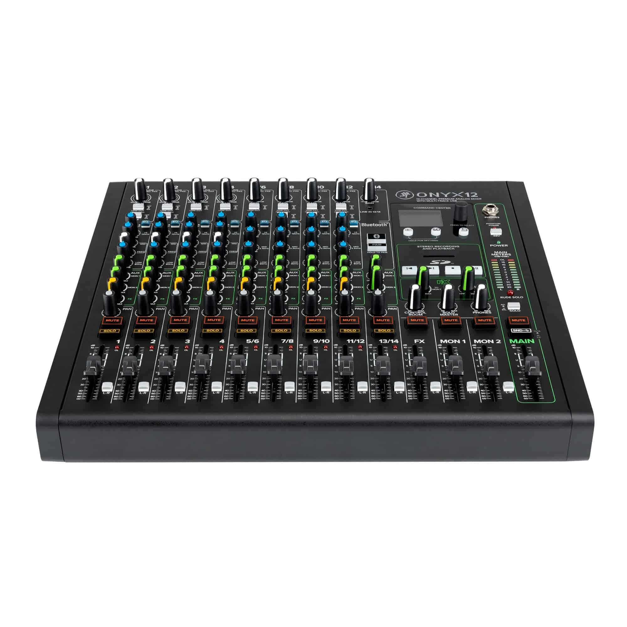 El Mackie Onyx12 Mezclador Analógico Premium de 12 Canales con USB es la solución compacta definitiva para audio en vivo, grabación en casa y creación de contenido. La grabación multitrack de 24 bits / 96kHz, los galardonados y de alto rendimiento preamplificadores de micrófono Onyx, y un diseño de extremo a extremo ultra bajo ruido ofrecen la calidad de sonido que los profesionales demandan. Repleto de características que incluyen potentes efectos DSP, EQ estilo británico Perkins, pantalla a color completa y grabación integrada y reproducción desde una tarjeta SD. El Mezclador Analógico Premium Onyx12 te brinda la potencia que necesitas para capturar tu mejor actuación con fidelidad prístina en casa o en movimiento.