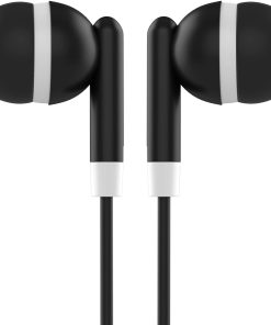 1. Audífonos estéreo tipo intrauditivos con cable de 48 pulgadas y un conector de audio de 3.5 mm en forma de L.