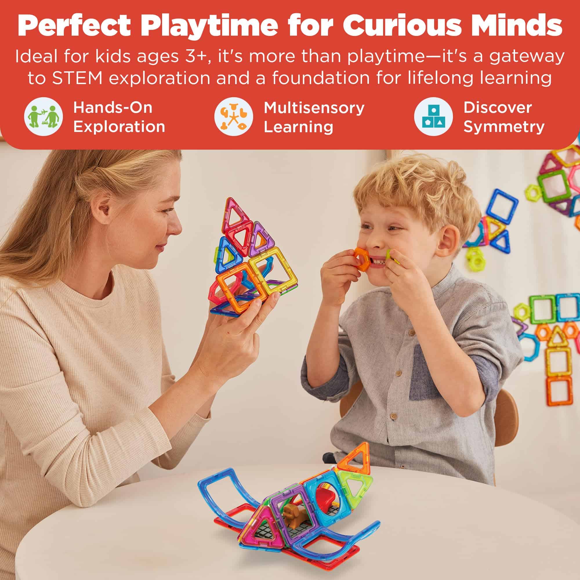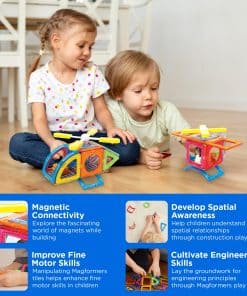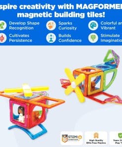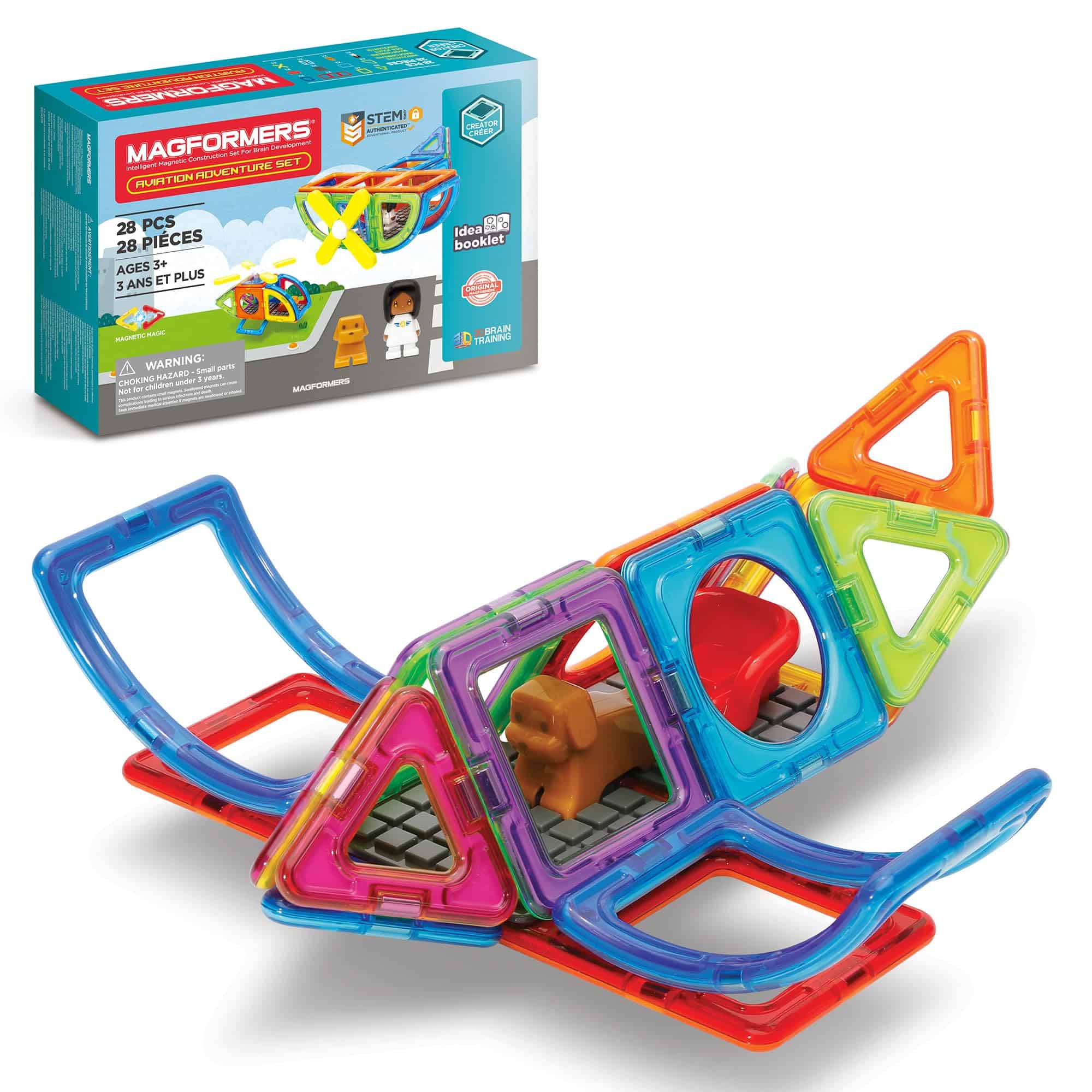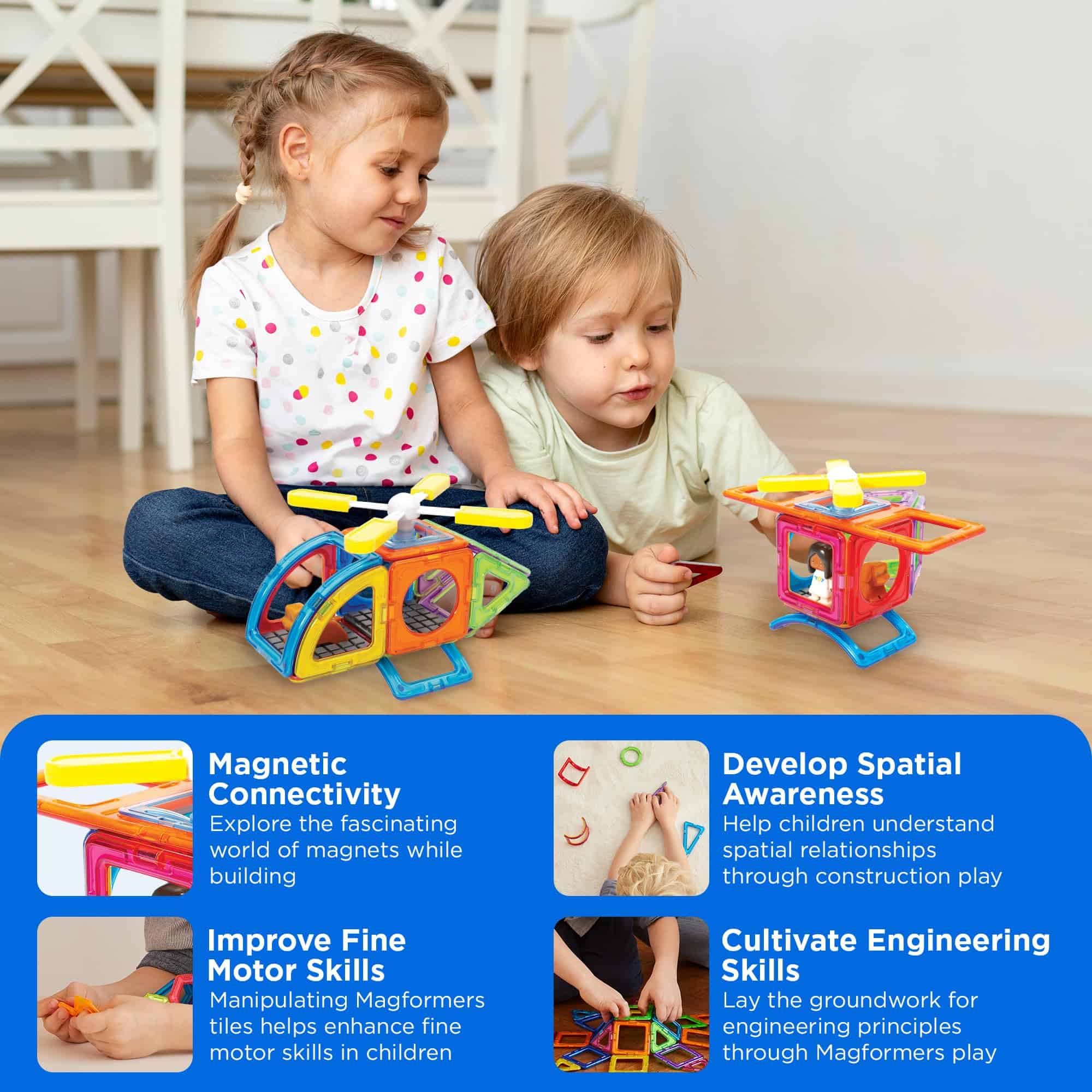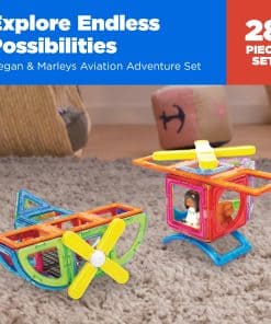 Construye aviones y haz volar a Megan y Marley en una aventura. El set de juguete de aventura de aviación de Magformers permite que tu pequeño constructor se sumerja en la emoción de una experiencia de vuelo. Utiliza cuadrados Magformers, triángulos y nuevas formas de círculo cuadrado internas para construir helicópteros y aviones. ¡Agrega una hélice y da vida a tus ideas!