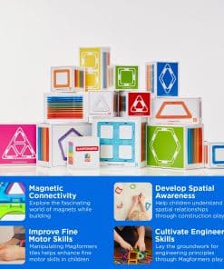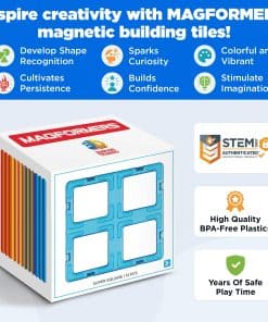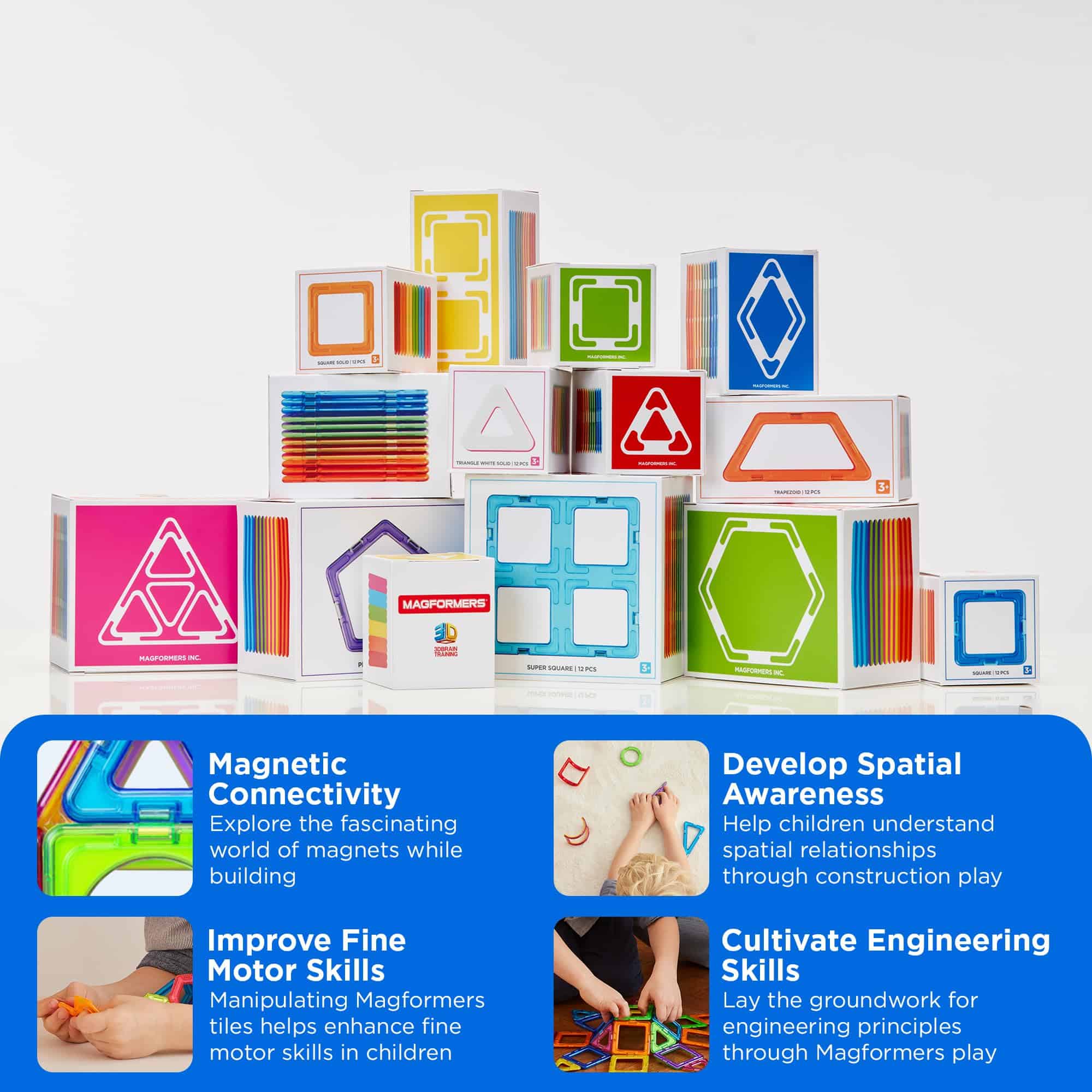 Construye con 12 cuadrados del arco iris, la adición perfecta a tu colección de Magformers. Cada forma geométrica contiene imanes que nunca se rechazan, por lo que siempre escucharás el clic de Magformers. Cuando se acabe el tiempo de juego, utiliza el poder magnético para simplemente apilar y almacenar. Perfecto para la educación STEM y el aprendizaje.