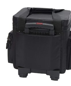 1. Telescopic handle on a reinforced trolley-board system. 2. Holds approximately 90 records. 3. Extra-thick removable 1″ padding all around. 4. Removable padded shoulder strap. 5. 3 additional exterior pockets for headphones, needles and other accessories