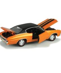 Parte de la línea SS («Super Sporting») de Chevrolet, el 1971 Chevrolet Chevelle estaba cargado con una larga lista de impresionantes características de rendimiento. Con una parrilla negra con acentos con el emblema SS, esta versión a escala 1:18 de este popular cupé está equipada con todos los detalles estilísticos, tanto por dentro como por fuera. Amplias franjas deportivas en el capó y las tapas del maletero (ambas se pueden abrir) y cuatro neumáticos de goma con el logo de Goodyear añaden un aspecto auténtico al auto. Además, con un tablero de instrumentos detallado y dos puertas funcionales, el Chevelle viene con un volante funcional que moverá las dos ruedas delanteras y asientos tipo cubo con apariencia realista. El auto está hecho de metal fundido con componentes de plástico y mide 10.5 pulgadas de largo. Soporte de presentación de plástico incluido. –Chris Burns