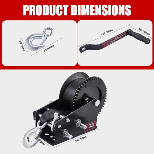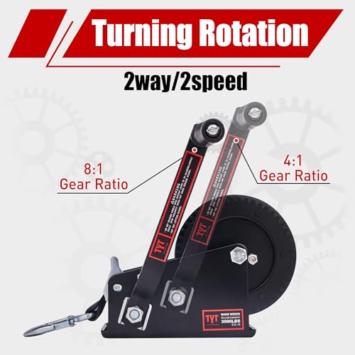 Malacate de barco con acabado de galvanizado negro de alta calidad para máxima resistencia y durabilidad que resiste el óxido y la corrosión. Engranajes de acero endurecido, primera relación de velocidad 4:1, segunda relación de velocidad 8:1, relación de transmisión de alta eficiencia 4:1/8:1. Engranajes de acero de alto carbono para resistir el desgaste y durar más. Tamaño de rendimiento del mango: 25 cm / 9.84 pulg, el mango curvo de los malacates de correa TYT hace que sea más fácil de girar, mover algo de 3500 lbs o menos, el mango antideslizante garantiza un agarre firme para menos fatiga del usuario y más productividad al girar el malacate manual. Gancho de amarre de dos vías equipado con un perno de seguridad, que puede trinquetear hacia adelante y hacia atrás. El malacate de trinquete se puede utilizar para levantar objetos, arrastrar barcos o red de voleibol, ideal para remolcar o cargar barcos, embarcaciones personales y equipo de jardín. Paquete y garantía, agujero de montaje estándar, tamaño pequeño portátil, fácil de instalar. El paquete de caja interna pasa la prueba de rechazo de 1 metro, protege el producto de daños. Garantía de 365 días, si tiene algún problema con nuestro malacate de engranaje TYT, no dude en ponerse en contacto con nosotros, le proporcionaremos una solución de satisfacción del 100%. Por favor, dé el primer paso, únase a TOP YOUR TARGET, alcanzaremos la meta juntos.