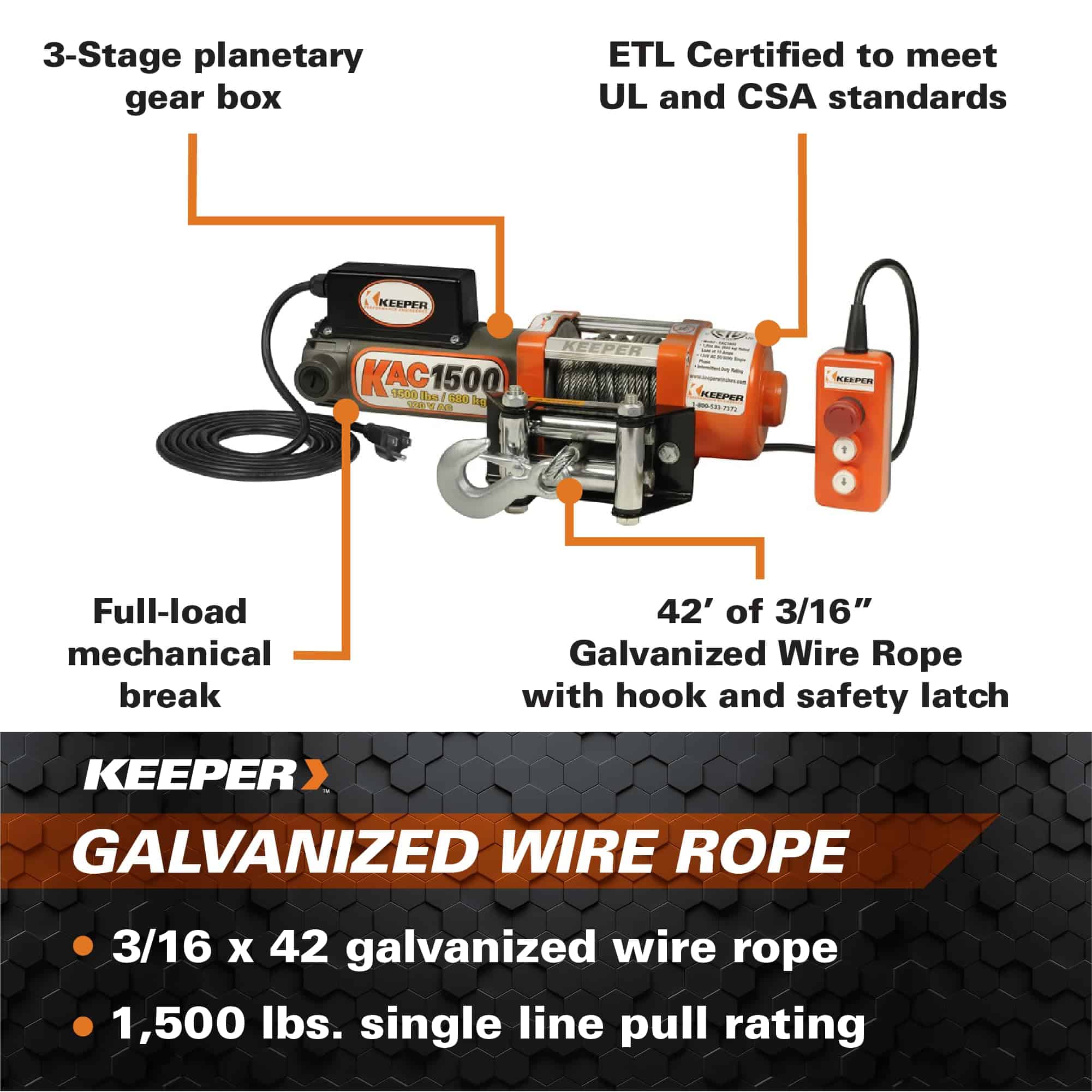 El KAC1500 es ideal para aplicaciones en garajes y talleres. Está lleno de características esenciales para una operación eficiente y confiable. Motor de 1.0 HP 120V AC. Freno automático de retención de carga completa. Cable de acero galvanizado de 42 L x 3/16 diámetro y gancho con traba de seguridad. Caja de engranajes planetarios de 3 etapas con engranajes endurecidos. Placa base con polea guía de 4 vías y placa de tensión del cable. Control remoto con cable. Cable de 12 pies con interruptor de circuito reiniciable y interruptor de parada de emergencia reiniciable. Aprobado ETL para EE. UU. y Canadá. Se conecta a cualquier salida de 110/120V AC de 3 clavijas con conexión a tierra compatible con GFI. Enchufe de 3 clavijas en cable de 8 pies. Operación de Encendido/Apagado de Energía. 1500 lbs. de potencia de tracción (clasificación de línea única). Capacidad de carga completa con menos de 10 amperios AC.