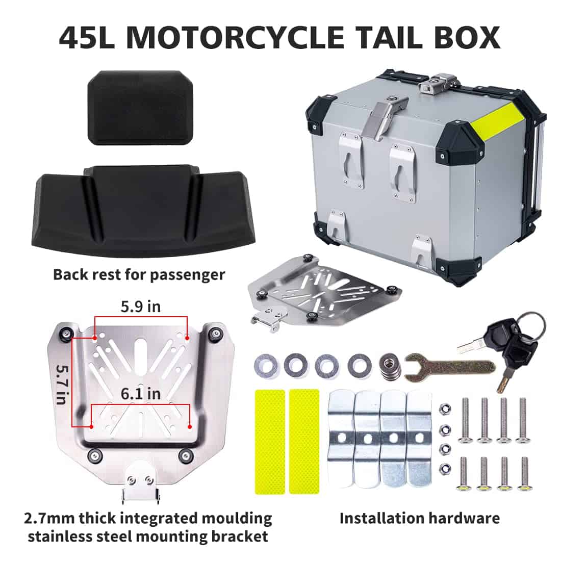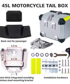 Diseño universal para la mayoría de los modelos de motocicletas de marcas como: Suzuki, Honda, Kawasaki, Victory, Yamaha, Harley, etc. Compatible con la mayoría de los portaequipajes tubulares. Accesorios incluidos: placa de montaje, tornillos, tuercas, arandelas, 2 llaves, cinta reflectante (no pegada) y 2 respaldos tapizados. Embalaje: bolsa de columna de aire y embalaje de cartón. Peso neto: 14.3 libras. Debido a que no cambiamos las nuevas imágenes a tiempo, hay una reseña de un cliente de 3 estrellas El estuche recibido no es el que se describe. Las imágenes del producto están actualizadas ahora, los clips de amarre del equipaje están hechos de nylon, diseño integrado, que pueden soportar una fuerte tensión, el mango de aleación de aluminio es cuadrado, parte superior plana, caja fuerte. Las imágenes que ve para comprar serán iguales al diseño del producto que reciba.