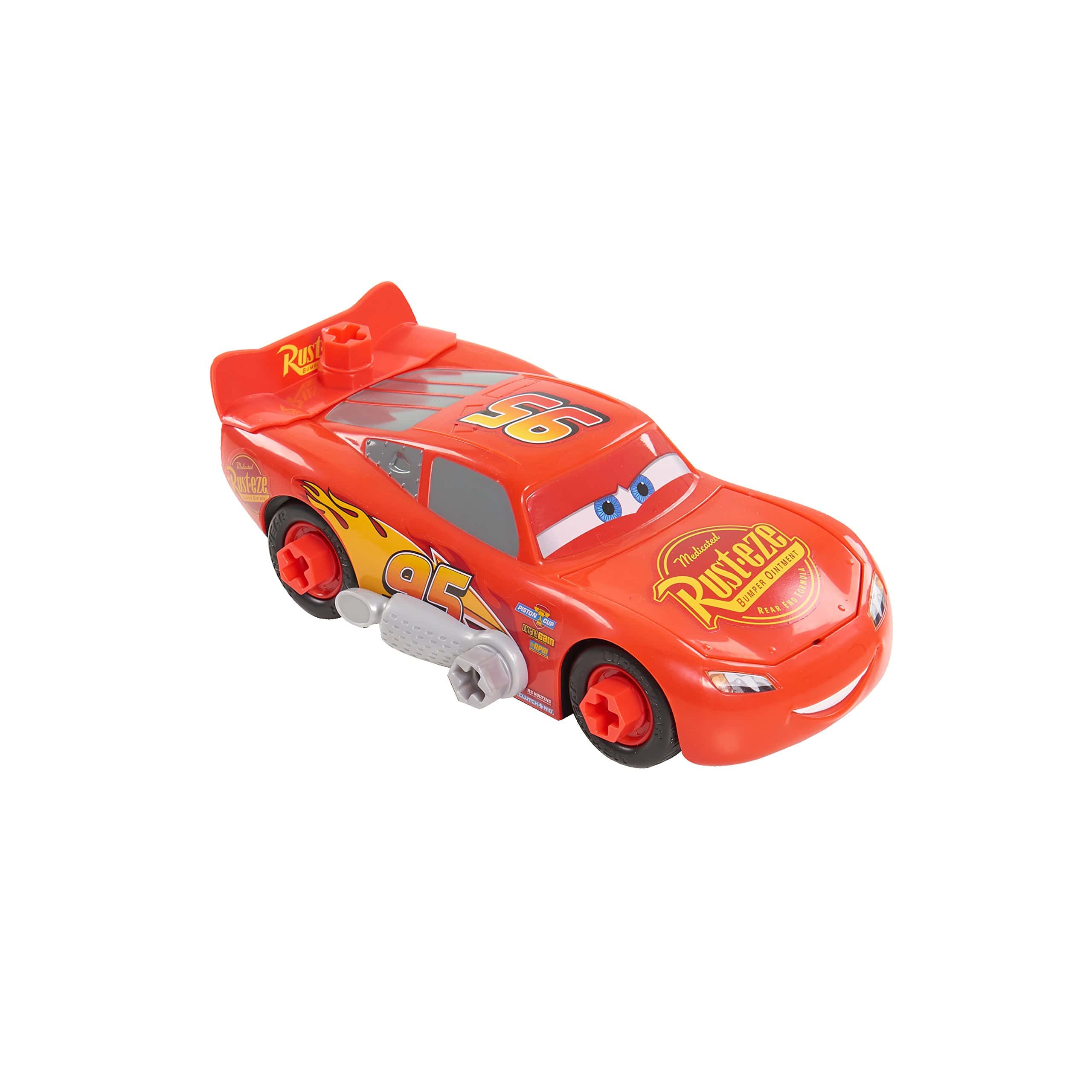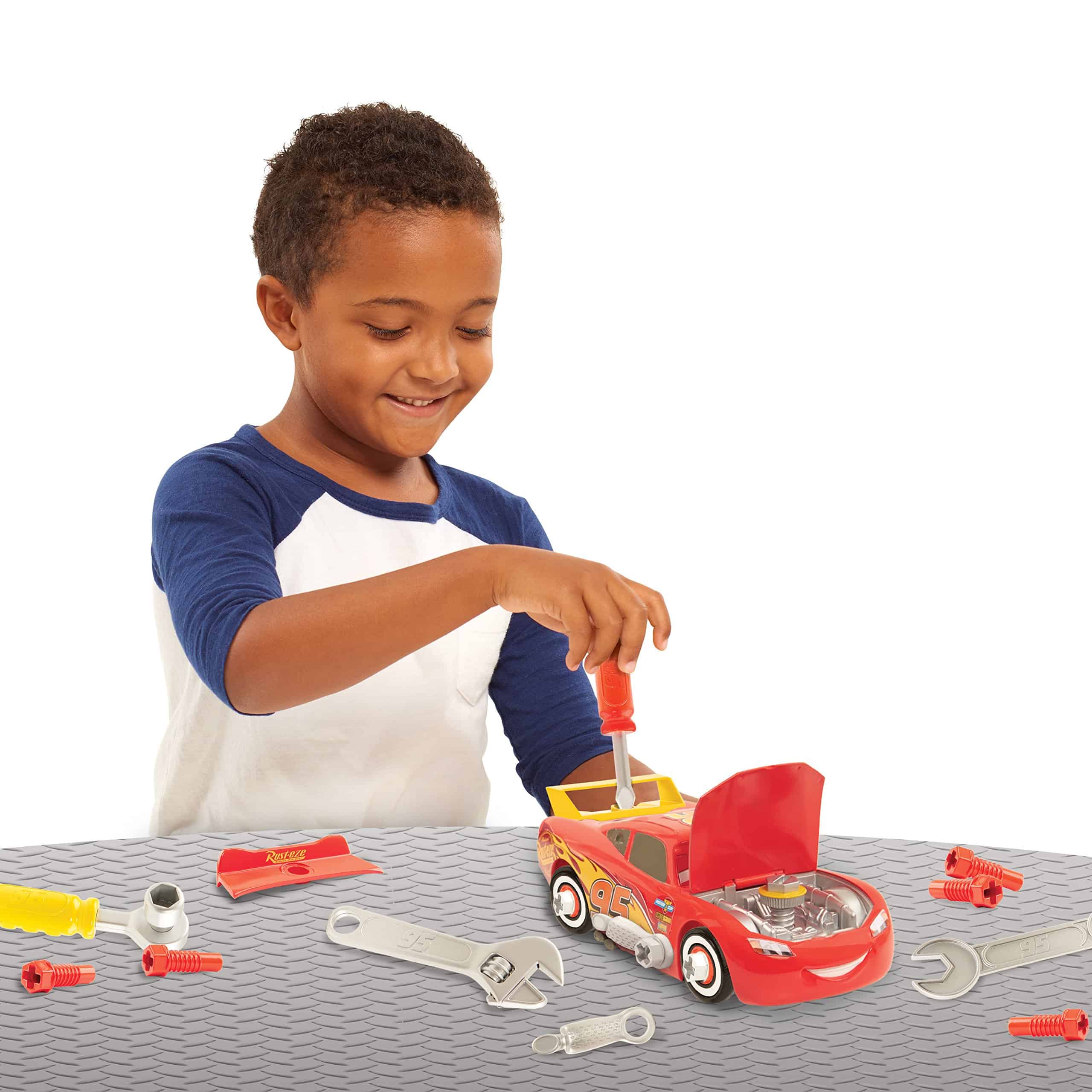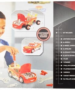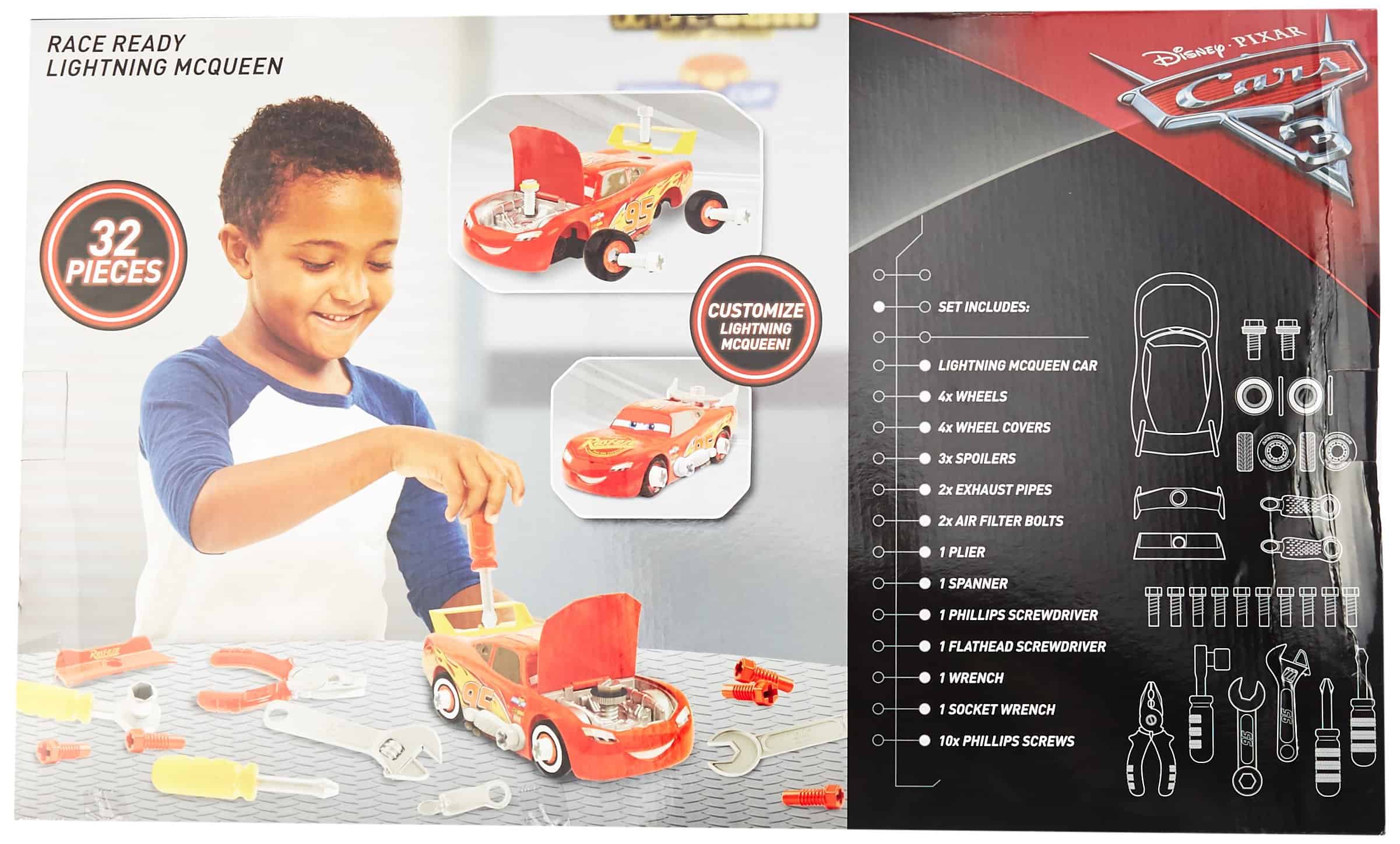 ¡Construye tu propio auto de carreras ganador con el Maletín de Herramientas Race Ready de Rayo McQueen de Disney Pixar’s Cars 3! Este set está repleto de una increíble cantidad de 32 piezas de juego que te permiten construir, ajustar y personalizar tu propio auto de carreras de Rayo McQueen. ¡Levanta el capó de McQueen para echar un vistazo en el interior y afinar su motor! ¡Gira, quita y personaliza los neumáticos de McQueen y cambia sus alerones para diferentes aerodinámicas! ¡La diversión de personalización nunca termina con el Race Ready Lightning McQueen! El set incluye 31 piezas y herramientas de personalización y un vehículo de Rayo McQueen.