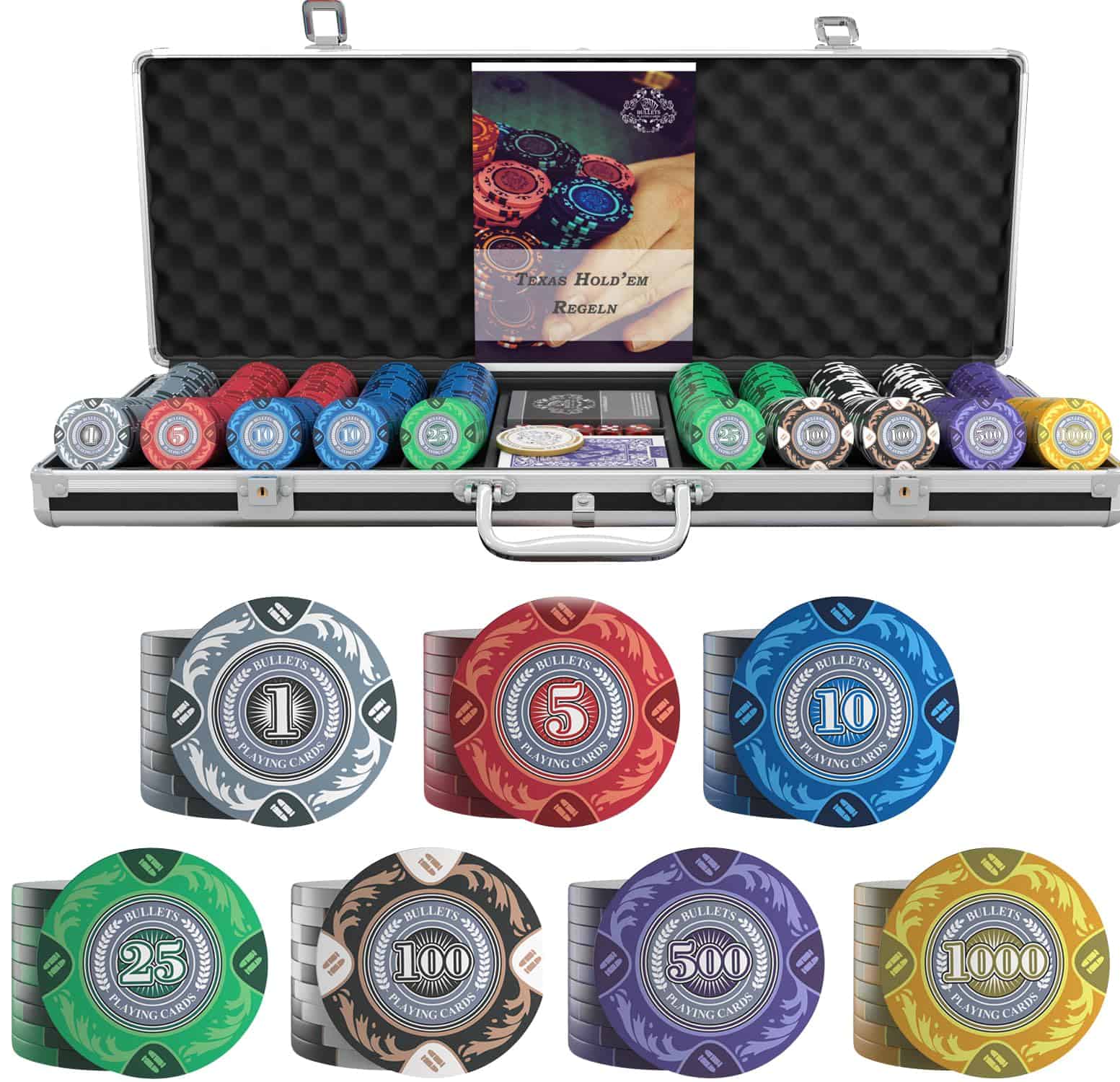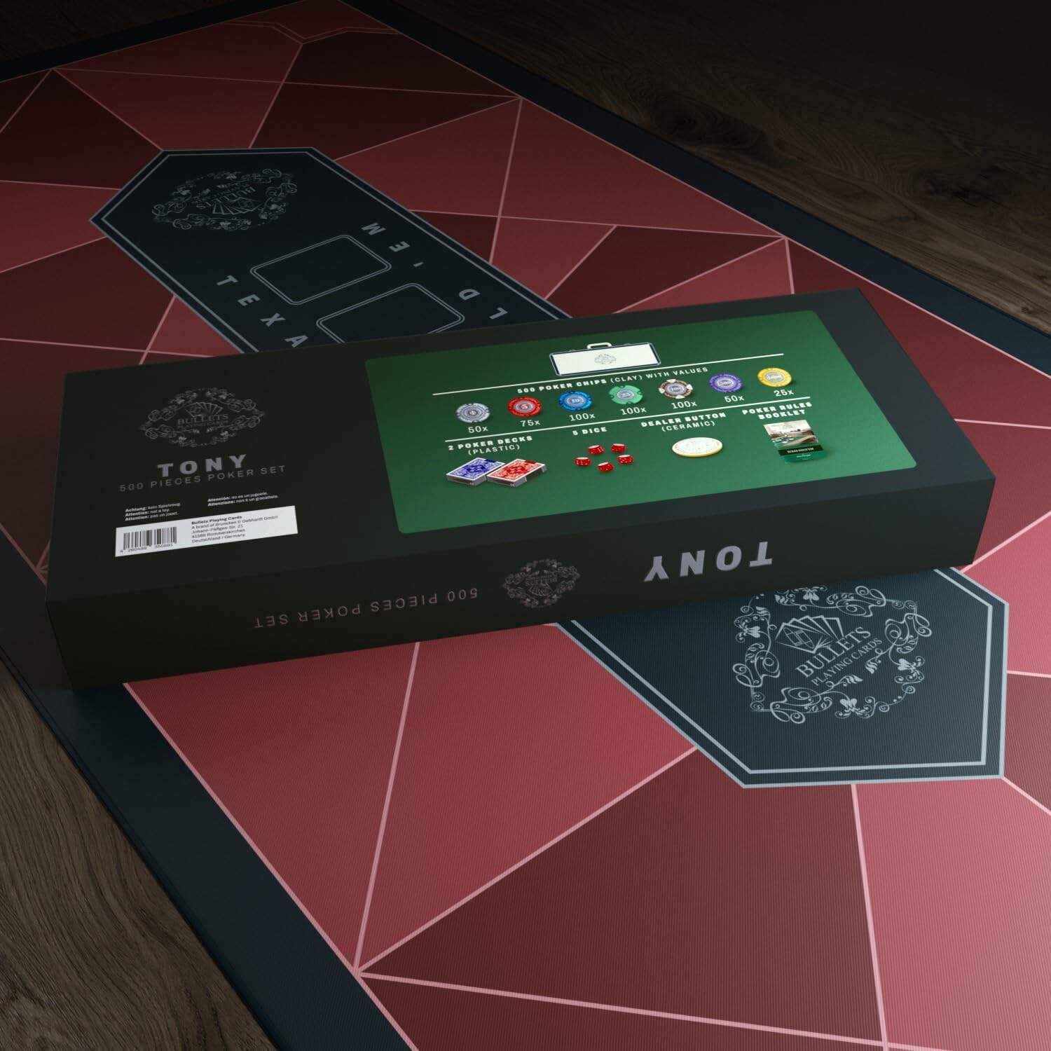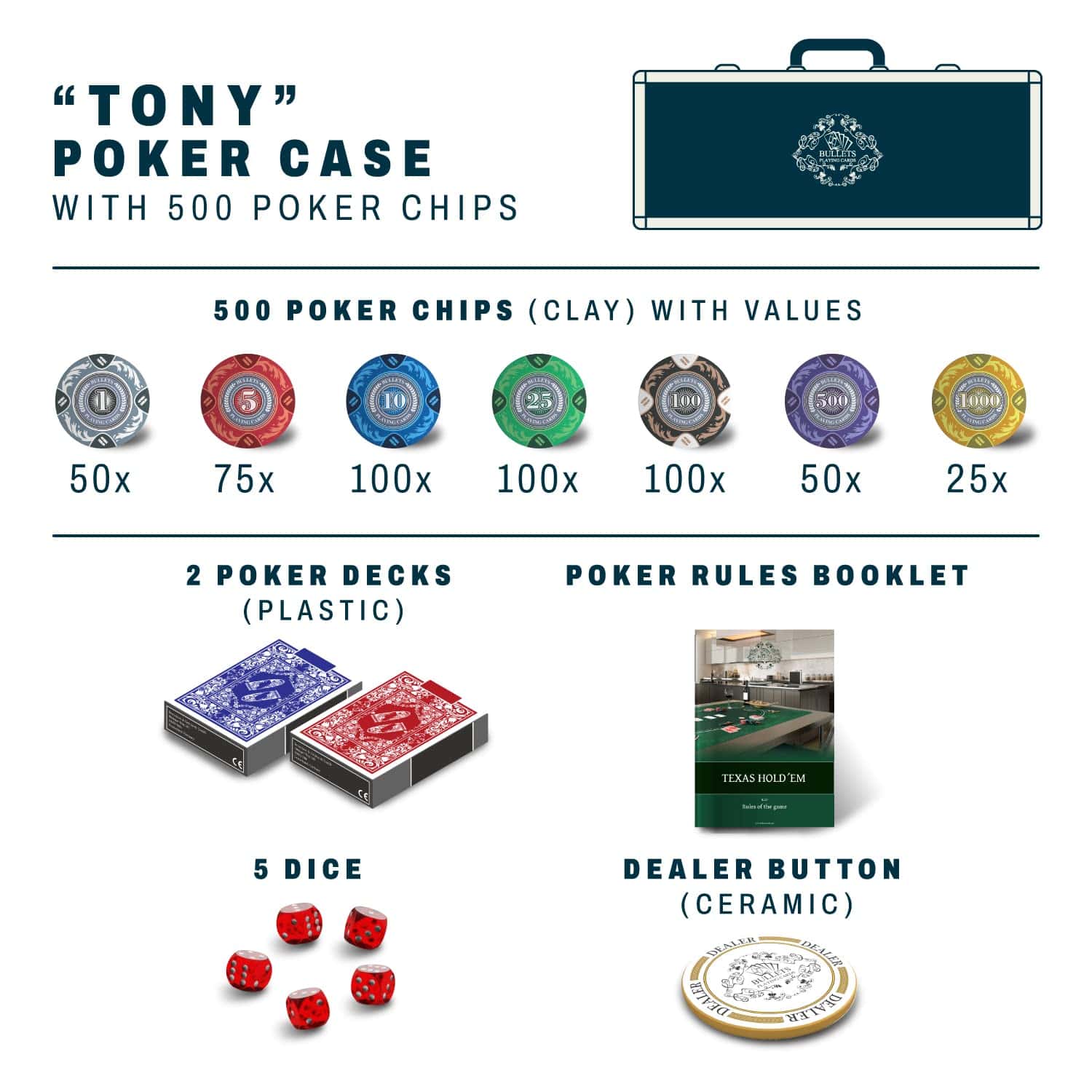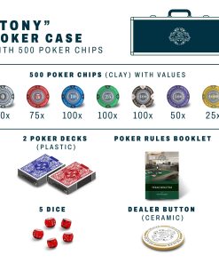 Maletín de Poker Bullets Playing Cards ‘Tony’ con 500 fichas de póker de arcilla premium ideal para juegos de efectivo y torneos. Incluidas 500 fichas de póker de arcilla diseñadas con un peso aproximado de 12 g cada una. Además, el set contiene un botón de repartidor de cerámica, 2 barajas de cartas de póker bullets, 5 dados y reglas de póker. El tutorial colorido proporciona reglas para Texas Holdem Poker y consejos sobre cómo jugar. La denominación de fichas es perfecta para un juego variado. ¡También es ideal para jugar Ruleta, Blackjack y otros emocionantes juegos de casino!
