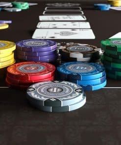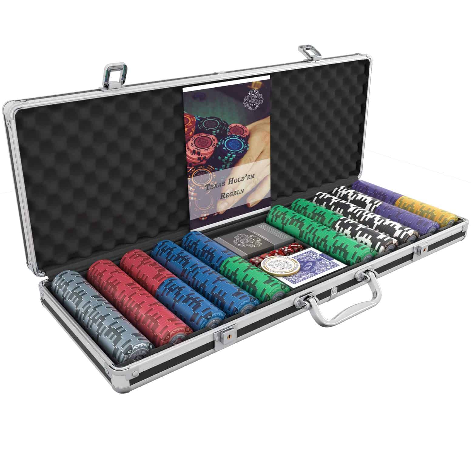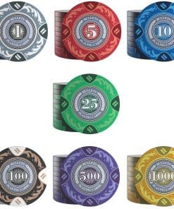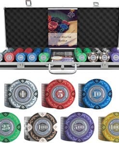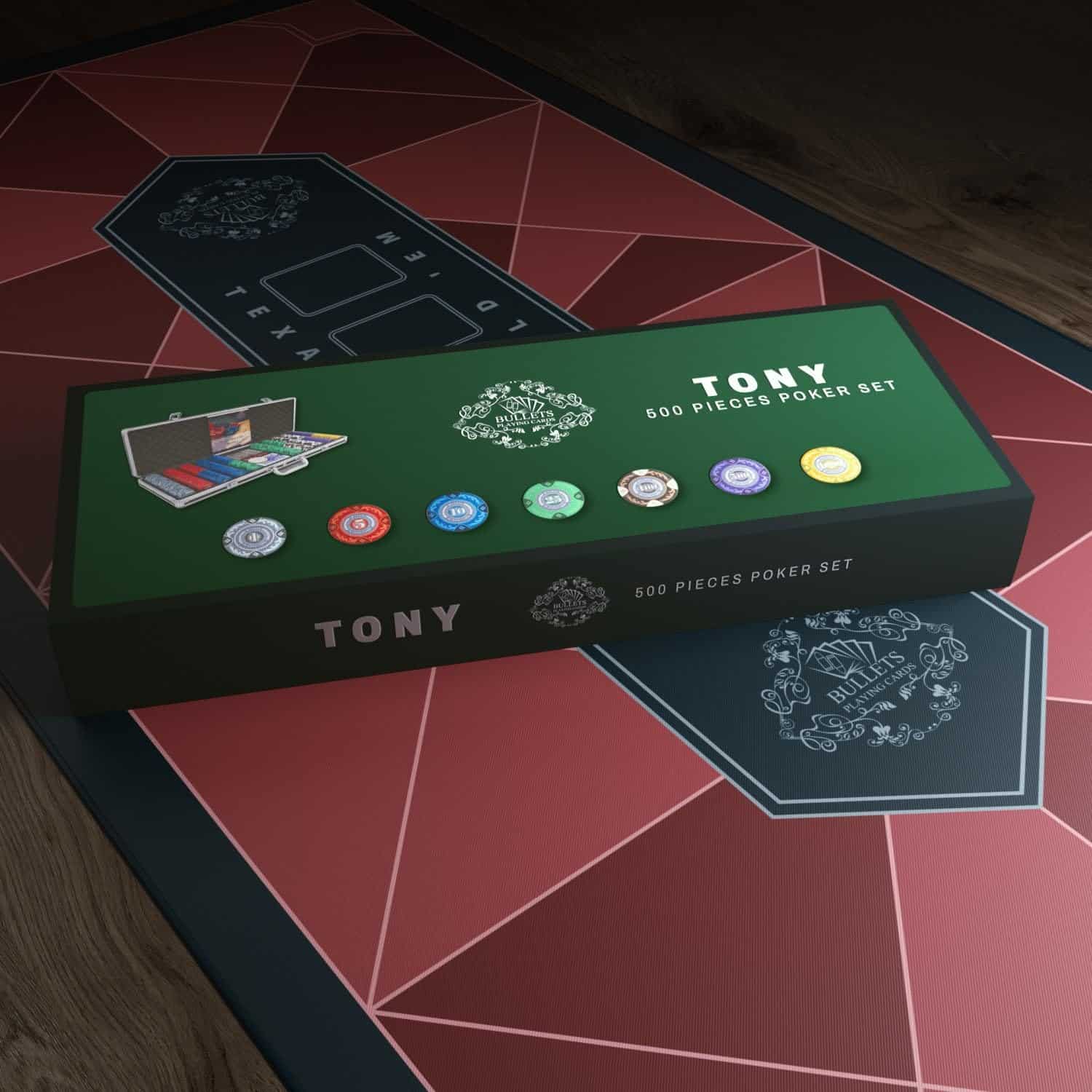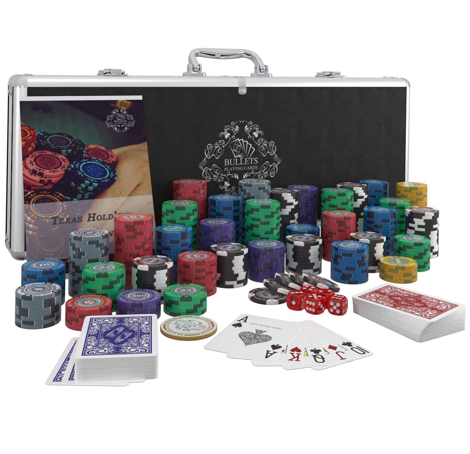 Maletín de Poker Bullets Playing Cards ‘Tony’ con 500 fichas de póker de arcilla premium ideal para juegos de efectivo y torneos. Incluidas 500 fichas de póker de arcilla diseñadas con un peso aproximado de 12 g cada una. Además, el set contiene un botón de repartidor de cerámica, 2 barajas de cartas de póker bullets, 5 dados y reglas de póker. El tutorial colorido proporciona reglas para Texas Holdem Poker y consejos sobre cómo jugar. La denominación de fichas es perfecta para un juego variado. ¡También es ideal para jugar Ruleta, Blackjack y otros emocionantes juegos de casino!