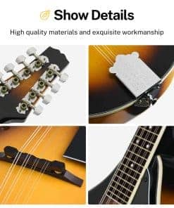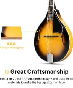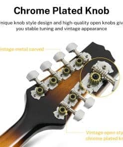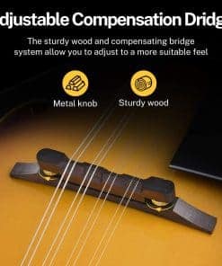 Especificaciones Color: Sunburst Número de Trastes: 20 Orientación de la Mano: Derecha Forma del Mastil: Forma «C» Espalda y Lados: Caoba Africana AAA Tapa del Cuerpo: Caoba Africana AAA Material del Mastil: Caoba Africana AAA Incrustaciones de Posición: Puntos Incluidos en el Paquete: 1 x Mandolina DML-1 1 x Estuche Grande 1 x Cuerdas de Guitarra 1 x Afinador DT-2 1 x Paño de Pulido 2 x Púas