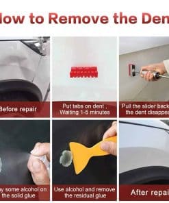 3. Ampliamente utilizado – El kit de tirador de abolladuras es adecuado para la mayoría de las grandes abolladuras. Acción eficiente en automóviles y otras abolladuras de superficie metálica. (La temperatura aplicable para las barras de pegamento varía de 0 a 40 grados. Si la temperatura desciende por debajo de 0 grados, el pegamento termofusible puede solidificarse rápidamente y no puede pegarse. Para este caso, simplemente caliente la unión con un secador de pelo antes de usar este producto.).
