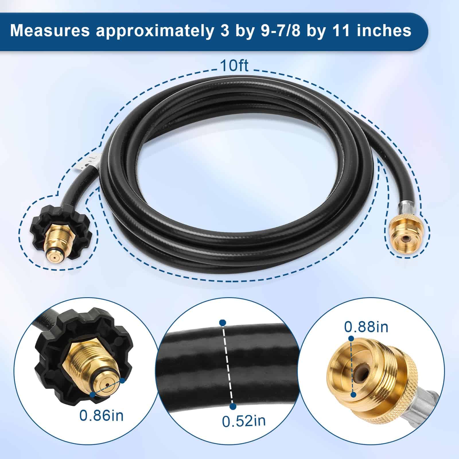 1. Compatibilidad de la Manguera Adaptadora de Propano: La manguera de propano F273704 es compatible con la serie Mr. Heater Mr Buddy, manguera de propano de 10 pies con ensamblaje de accesorios adaptadores compatible con Mr.Heater MH9B Portable Buddy y MH18B Big Buddy, parrilla Blackstone, estufa Coleman para acampar y más. Adaptador de manguera de propano de 1 lb a 20 lb», compatible con más equipos de calentador y tanques de propano.