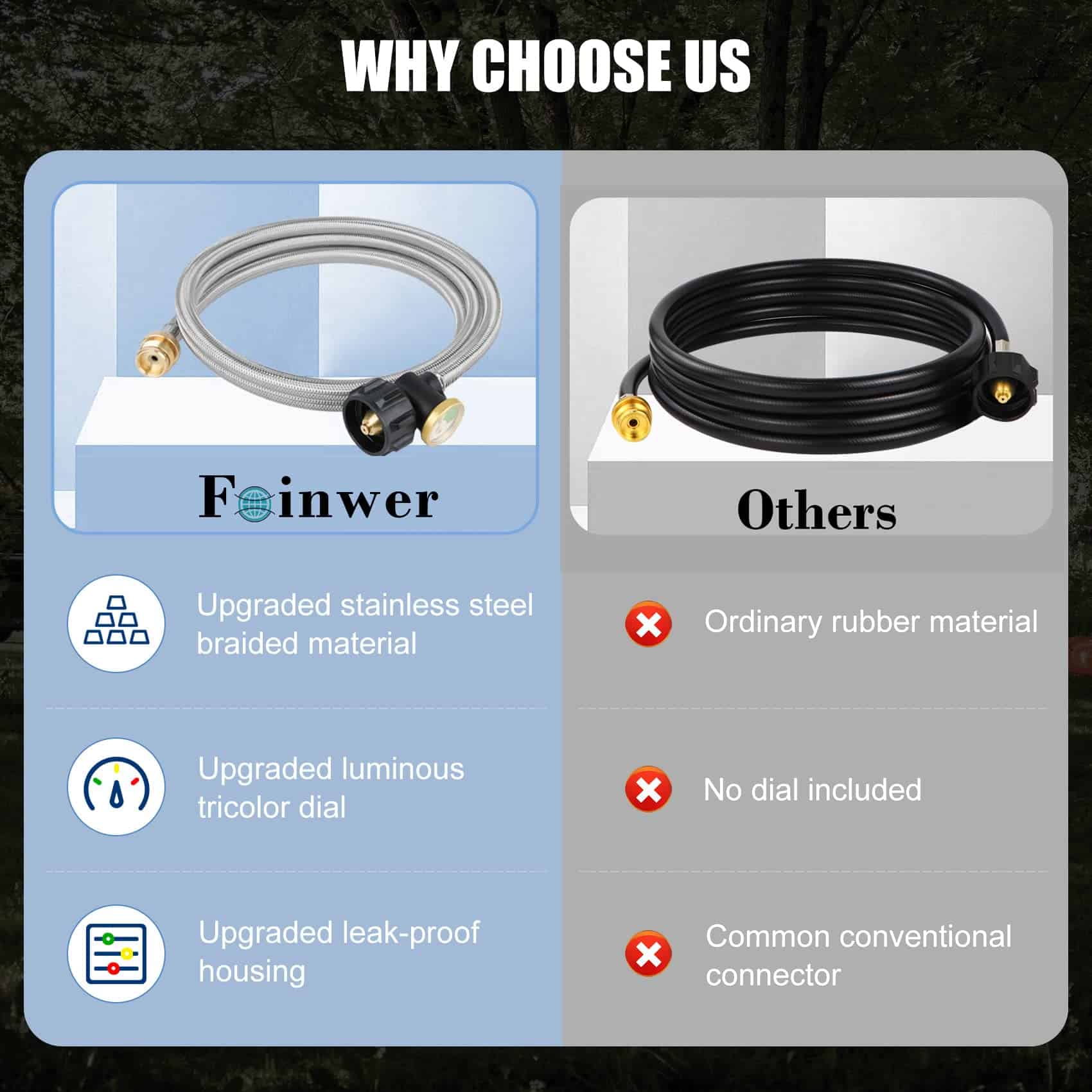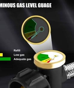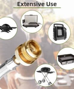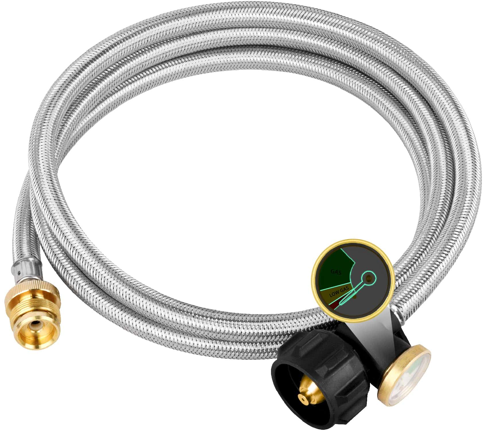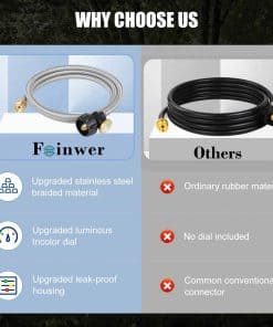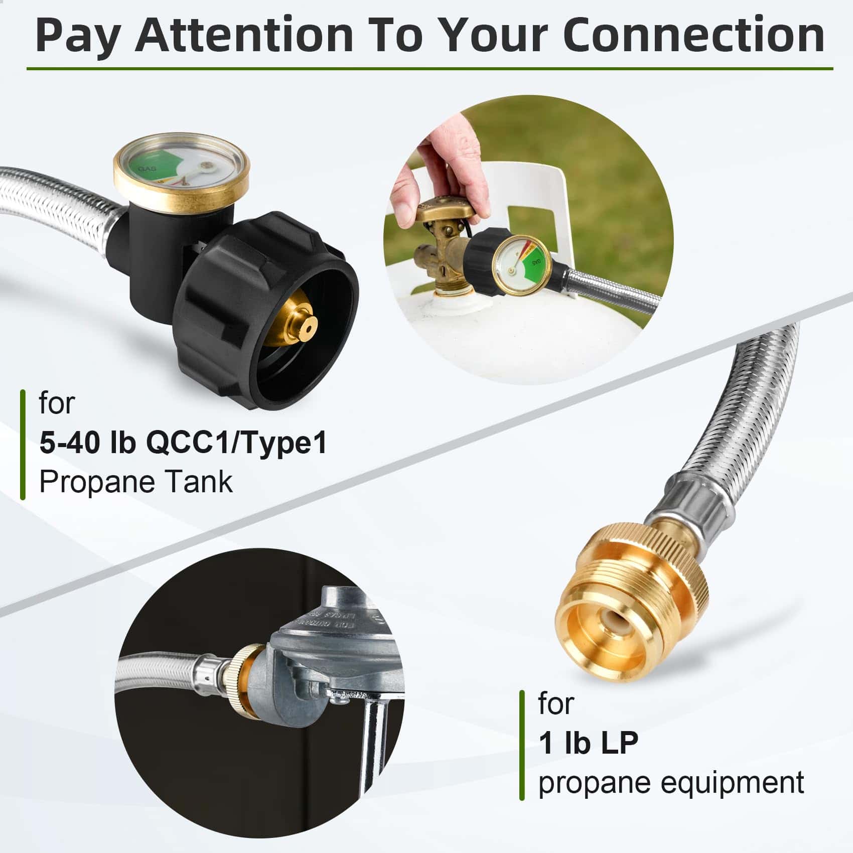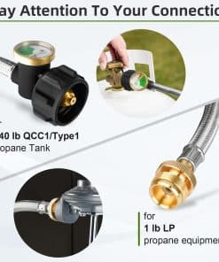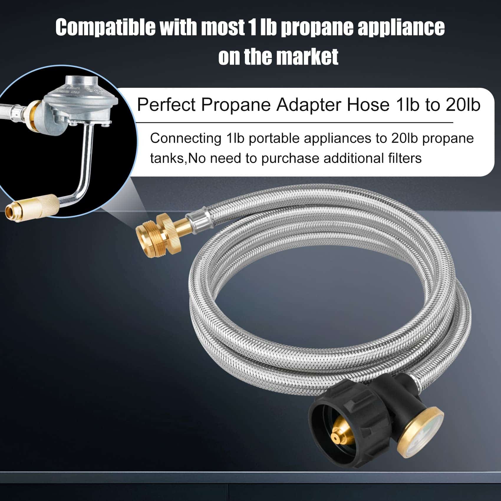 Manguera adaptadora de propano de 6 pies, de 1 lb a 20 lb, manguera de tanque de propano trenzada de acero inoxidable de 1 lb para aparatos portátiles hacia tanque de 5-40 lb QCC1/Type1, adaptador de propano con medidor para calentador portátil, estufa de camping, parrilla de gas. Esta manguera de tanque de propano es el reemplazo perfecto para el tanque pequeño verde de 16.4 oz/1 libra, sin la necesidad de comprar un regulador adicional. La manguera adaptadora de propano se conecta directamente a un dispositivo portátil de propano de 1 libra. Compatible con todos los equipos con conexión QCC1/Type 1 y tanques de propano de 1 lb a 20 lb, es adecuada para estufas de camping, parrillas de mesa, eventos deportivos, calentadores exteriores y más equipos portátiles de propano de 1 lb. El dial luminoso giratorio permite detectar claramente la cantidad de gas en el tanque de propano, ya sea de día o de noche, sin la necesidad de agitar el tanque. La manguera adaptadora de propano trenzada de acero inoxidable es más eficaz que una manguera de goma para resistir las inclemencias del tiempo y prevenir que los animales la muerdan. Con un 100% de unión sólida de latón y un empaque de goma en el interior para evitar fugas. Equipada con una rueda manual para una instalación conveniente. Ofrece servicio de garantía por un año para su tranquilidad. ¡No dude en usar esta manguera adaptadora de propano de alta calidad para sus necesidades de propano portátil!