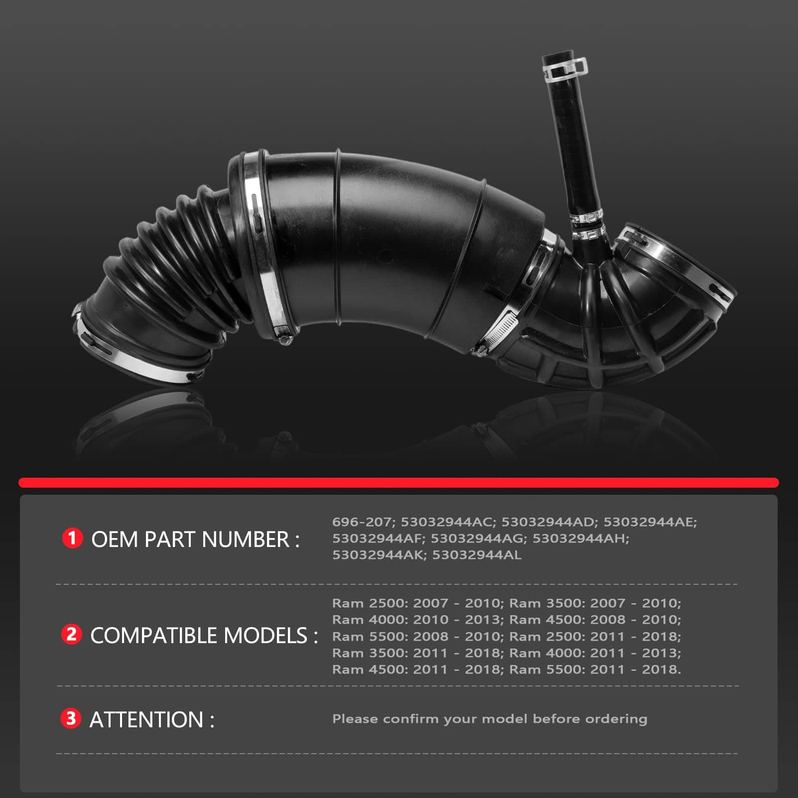 2. Compatibilidad: Esta tubería de admisión de aire es compatible con Ram 2500 3500 2007-2018 Ram 4000 2010-2013 Ram 4500 2008-2018 Ram 5500 2008-2018.