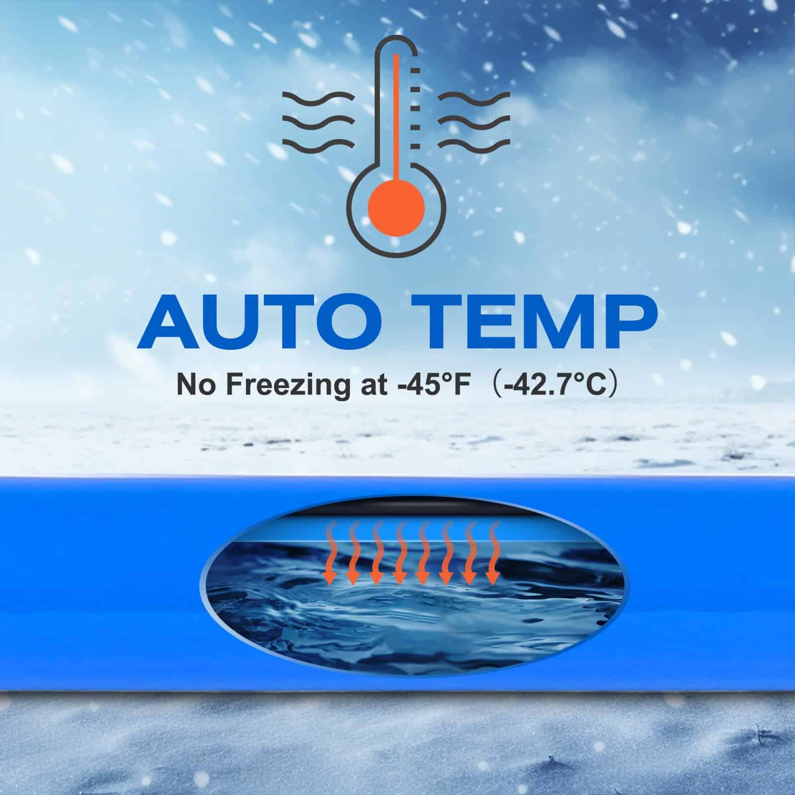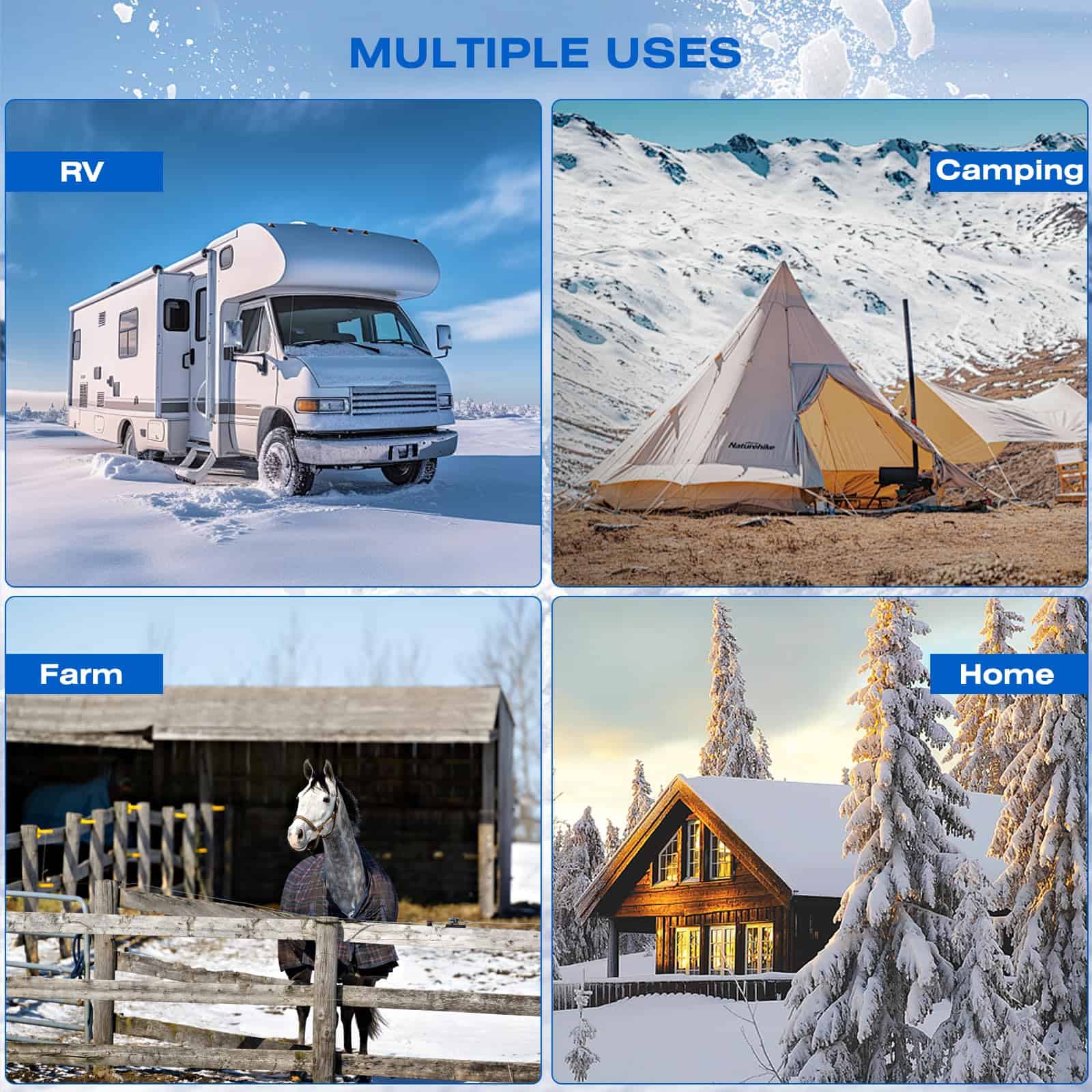 1. APLICACIÓN MULTI-ESCEAES La manguera de agua caliente para accesorios de RV puede evitar que el agua se congele hasta -45 (-42.7), y su único sistema de control de temperatura inteligente descongela gradualmente el hielo en agua. La manguera de agua caliente está certificada como segura para el agua potable. Puede usarse en RV, camping, gallineros, hogares, jardines y viajes, ayudando a innumerables familias a evitar la escasez de agua en climas extremadamente fríos.