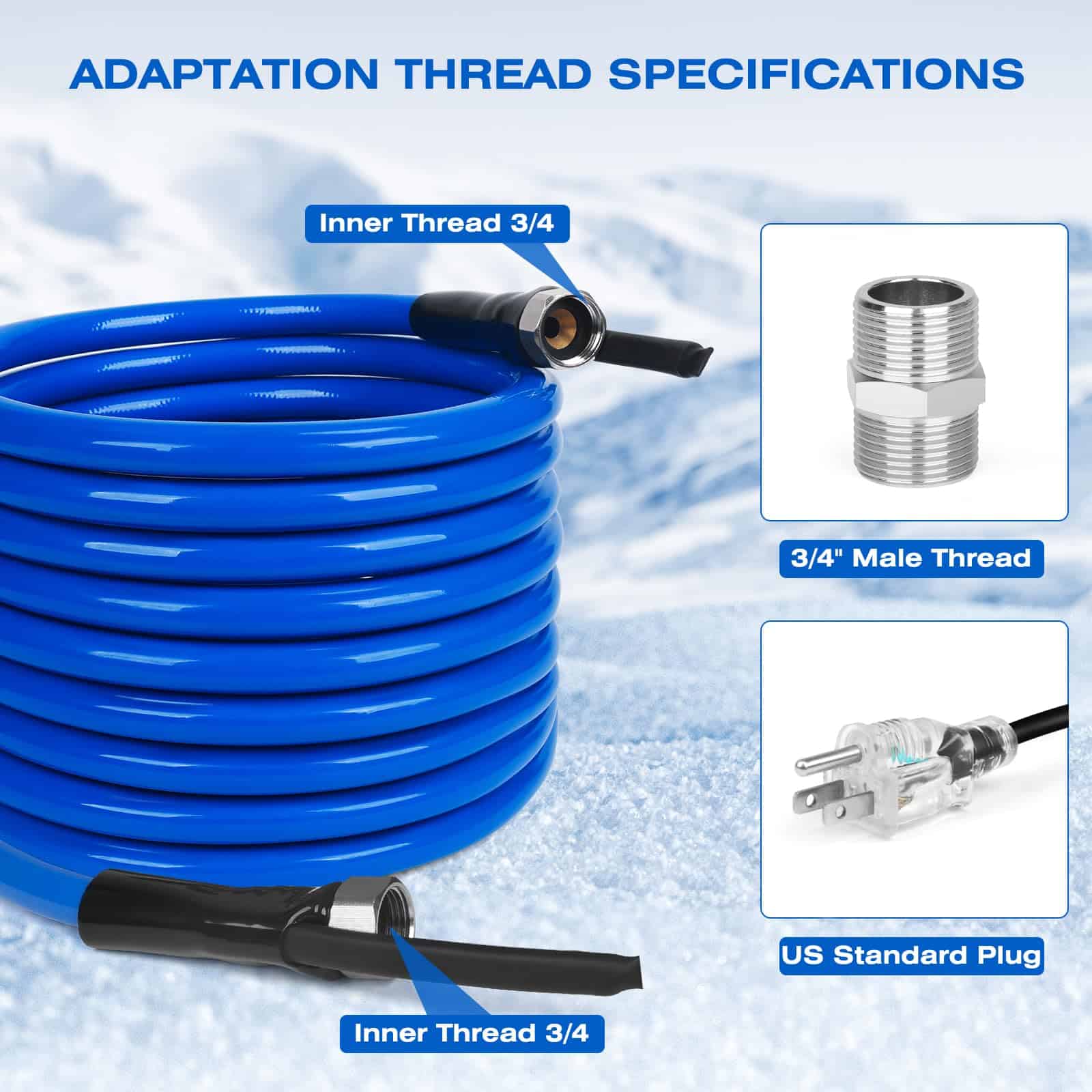 2. Rosca: Ambos extremos del producto tienen roscas hembra. Se incluye un tubo de rosca macho en ambos extremos de la manguera. La rosca es de 3/4″, que se puede conectar al sistema de suministro de agua en ambos extremos de la manguera. Por favor, preste atención a la dirección y posición del enchufe de alimentación al usarlo.