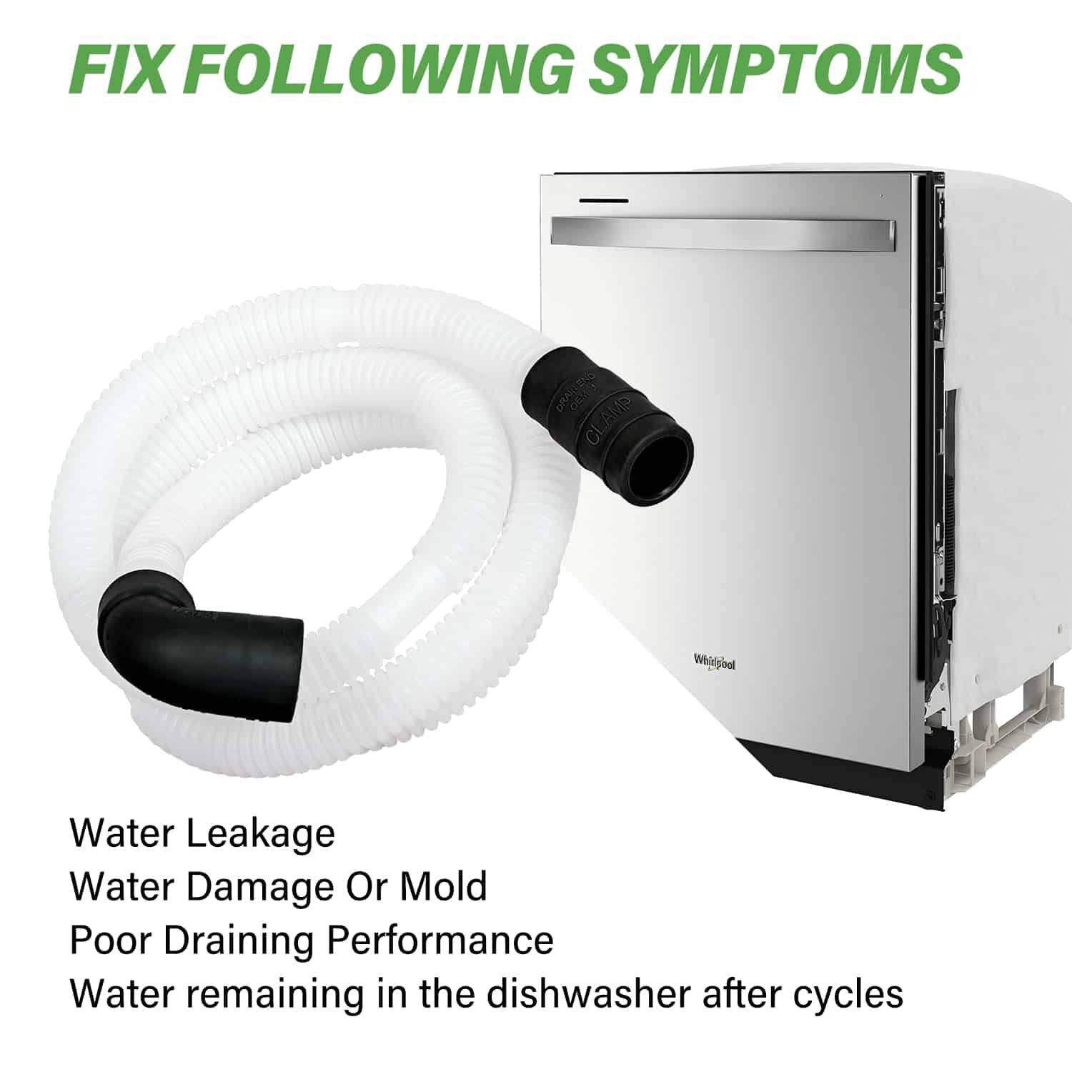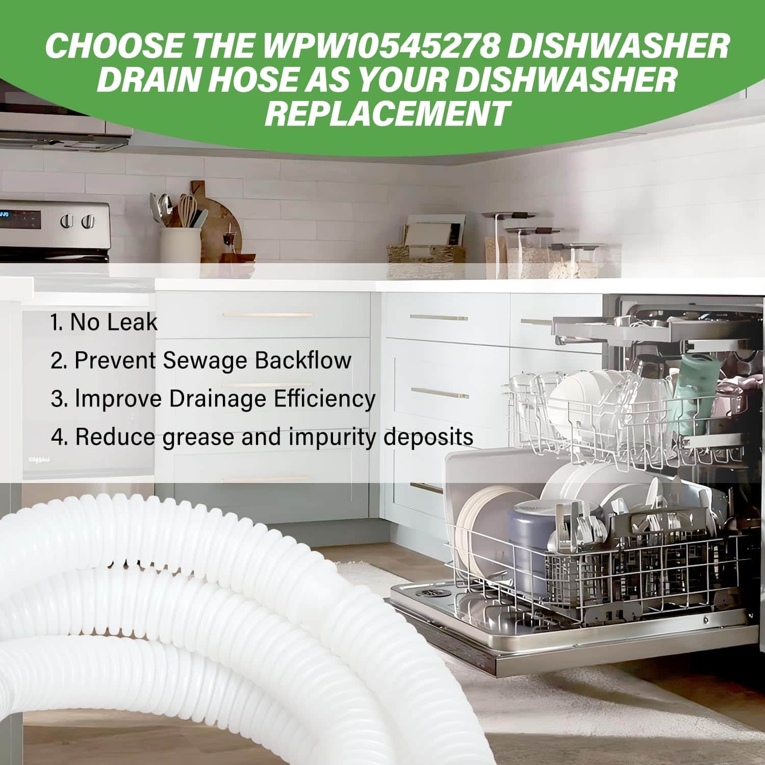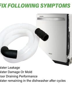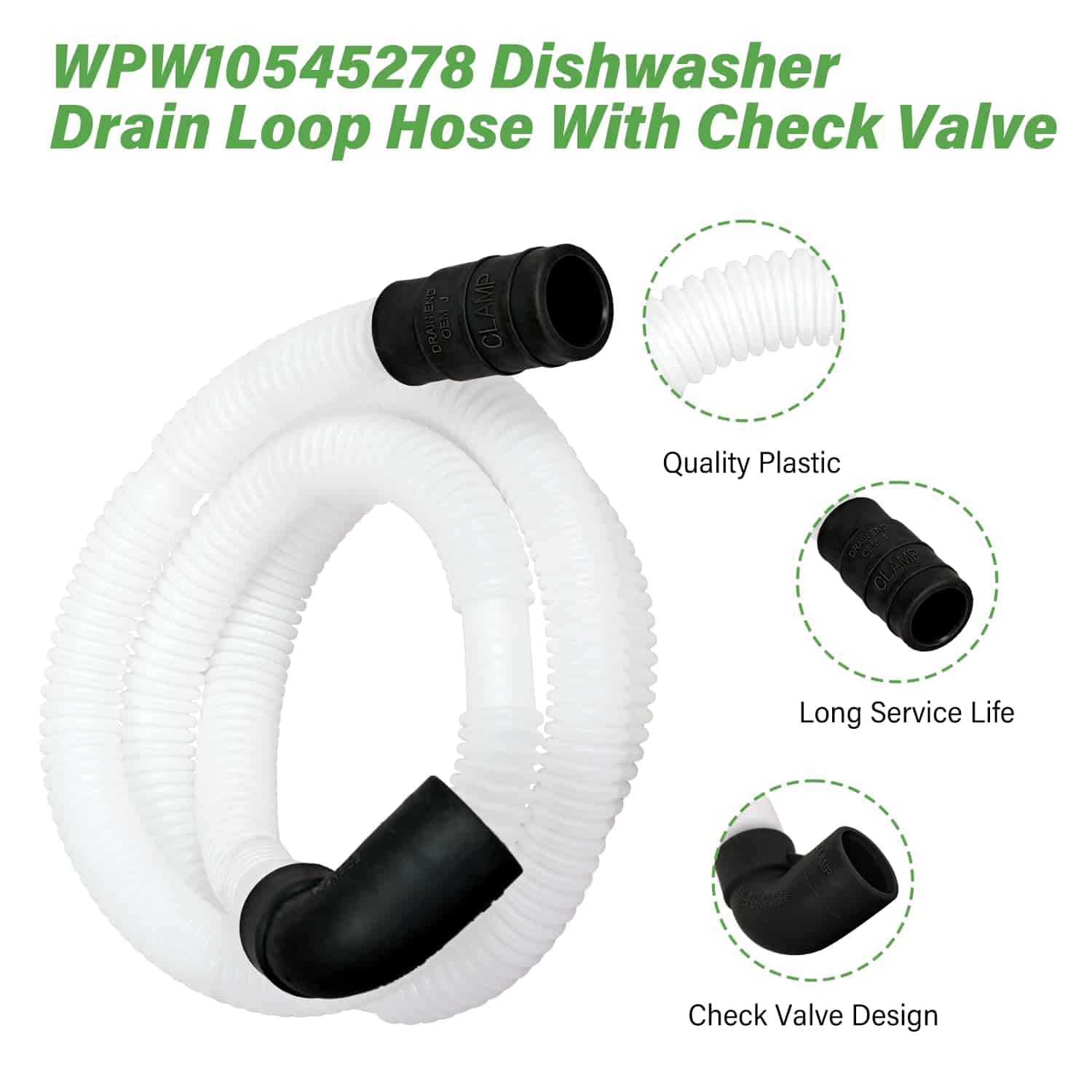 4. Soluciona los siguientes síntomas La manguera de bucle de drenaje para lavavajillas WPW10545278 con válvula de cheque está hecha de plástico de calidad y ha sido probada cuidadosamente por el fabricante. Es mejor que el OEM y perfecta para tu lavavajillas. Soluciona los siguientes síntomas: Fugas, No drena, No limpia los platos adecuadamente.