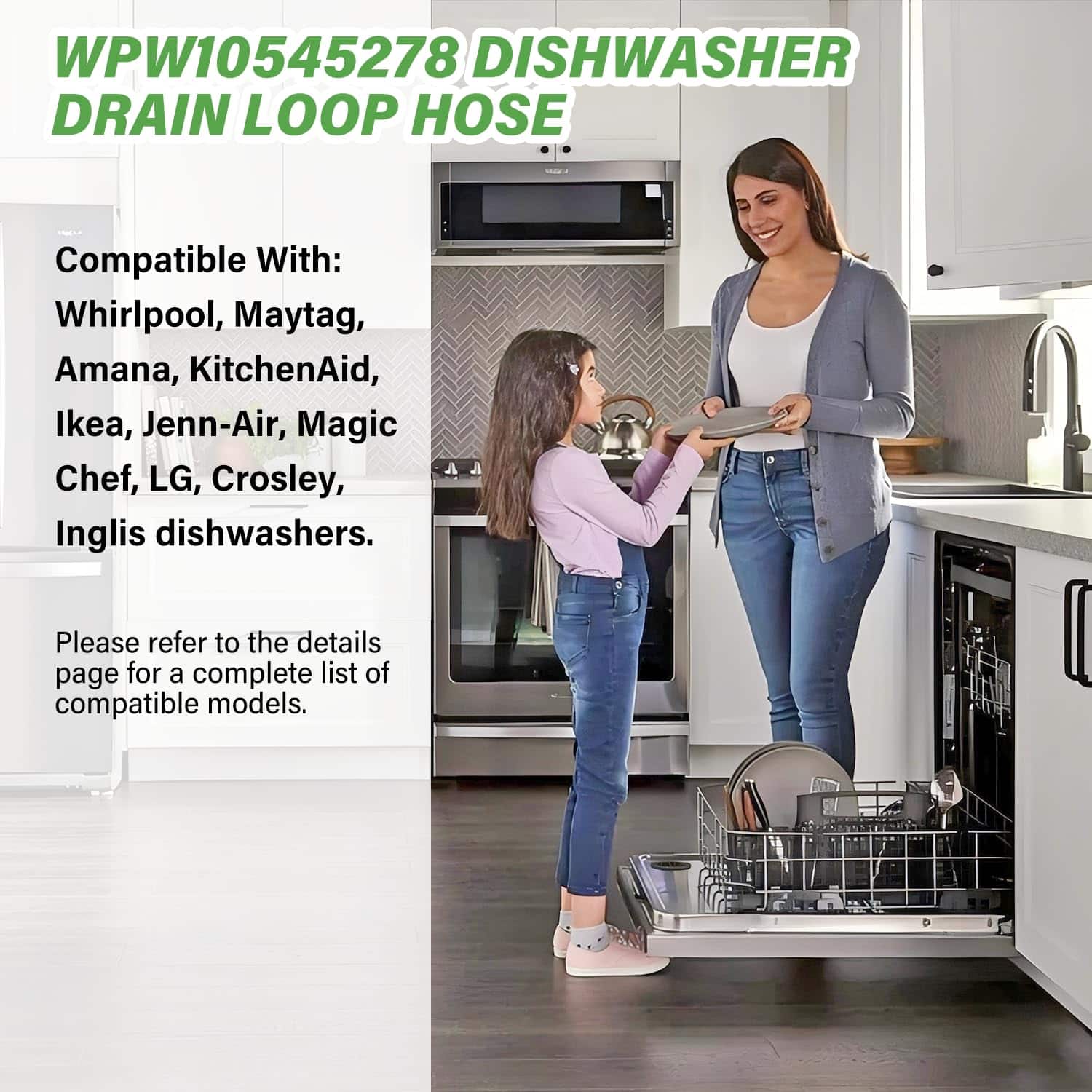 3. Compatible con La manguera de bucle de drenaje para lavavajillas WPW10545278 es compatible con Kenmore, Whirlpool, Maytag, Amana, KitchenAid, Ikea, Jenn-Air, Magic Chef, LG, Crosley, Inglis.