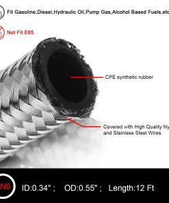 Manguera de combustible de alta calidad de 12 pies de longitud, con una cubierta exterior trenzada de fibra de nylon 6AN y un revestimiento interno de goma sintética de Polietileno Clorado (CPE). Esta manguera es universal y puede utilizarse para combustible, lubricante, alcohol, etanol, refrigerante y aire en automóviles o motores marinos. Es especialmente adecuada para coches de carreras y motos de carreras, pero no es aplicable a E85. La manguera está hecha de material resistente a la abrasión y flexible, combinando goma sintética CPE y trenzado de acero inoxidable para una mayor durabilidad. Sin embargo, no se recomienda su instalación en entornos corrosivos, ya que esto puede afectar la vida útil de la manguera. La cubierta exterior de nylon trenzado proporciona inflamabilidad adicional, haciendo que su uso sea más seguro. Con una presión de trabajo máxima de 1000 psi y una presión de explosión de 6000 psi, esta manguera puede soportar condiciones extremas. El rango de temperatura de trabajo es de -40 a 350 , lo que la hace adecuada para diversas aplicaciones. El kit incluye la manguera de 12 pies y 6 conectores de manguera giratorios en diferentes ángulos para una instalación personalizada. Sin embargo, es importante tener en cuenta que esta manguera no cumple con las regulaciones de C.A.R.B. y no es legal en los estados de California y Nueva York.