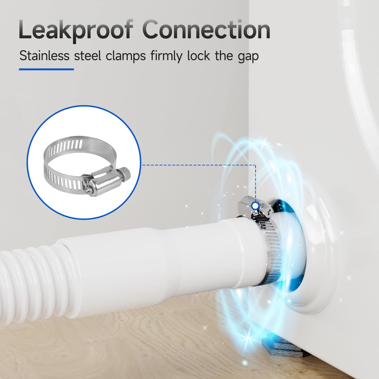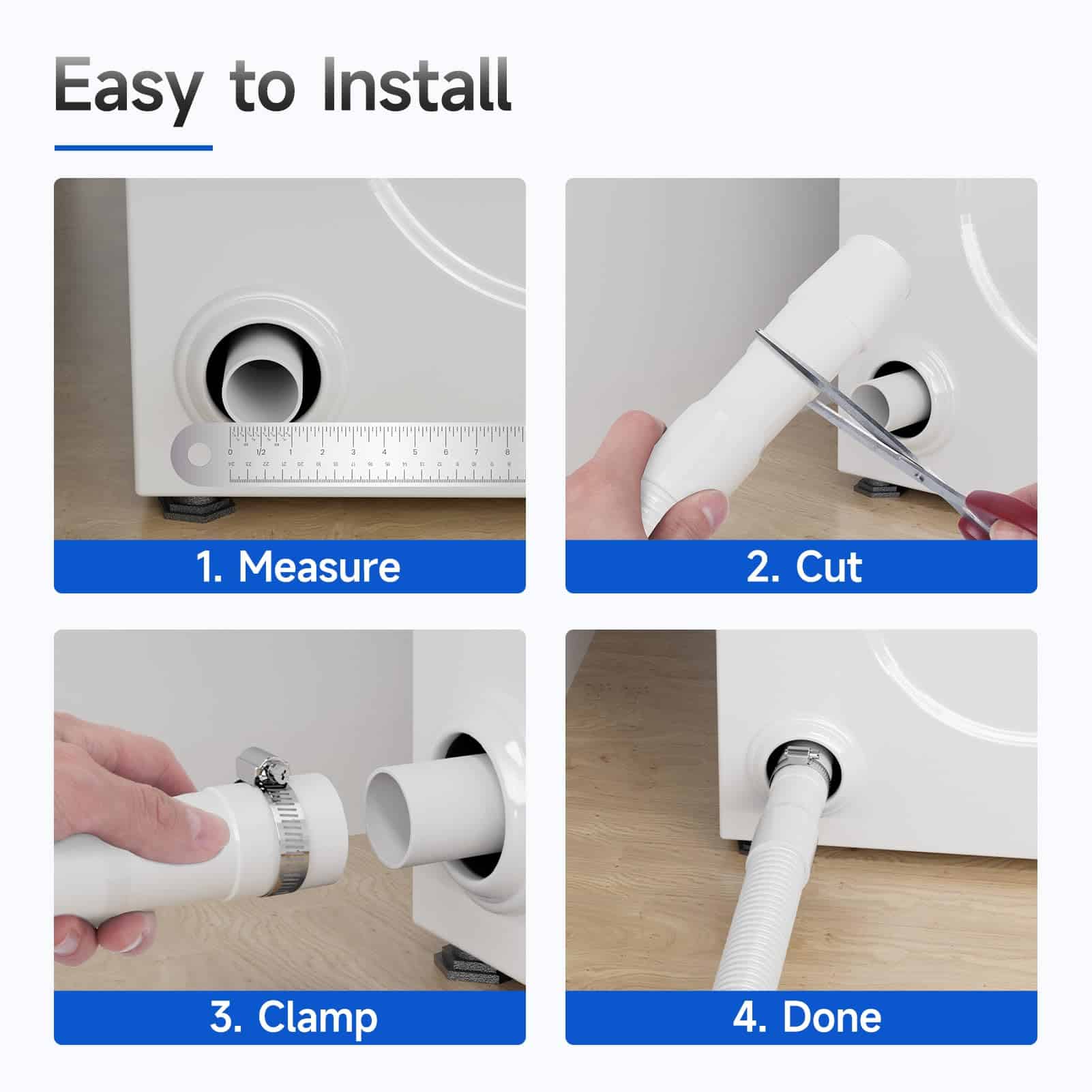 5. Fácil de instalar Simplemente corte el extremo de la manguera de desagüe de la lavadora al tamaño deseado y apriete la abrazadera.