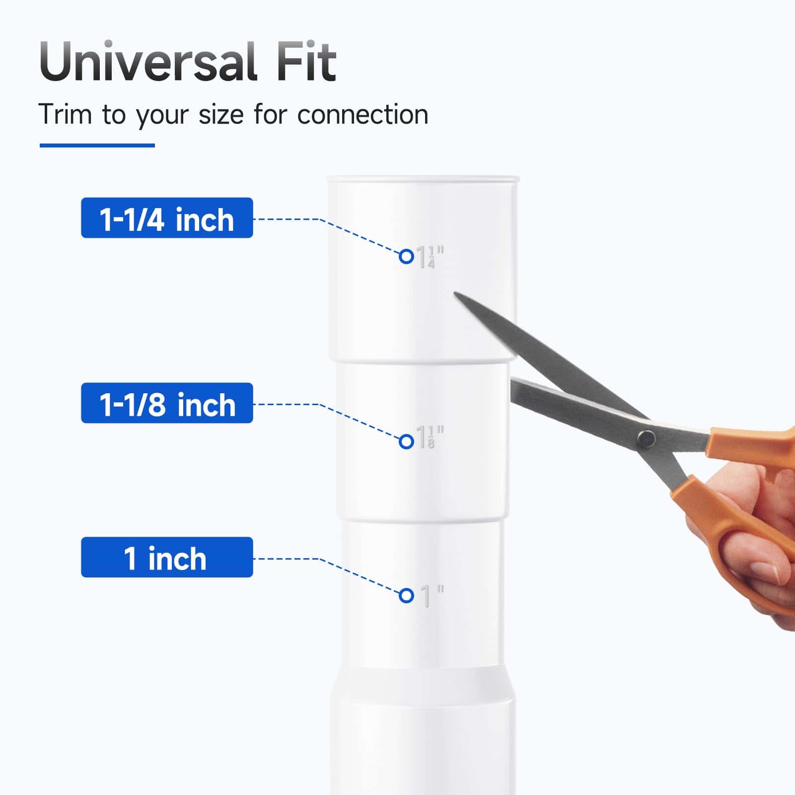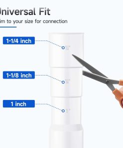 1. Ajuste universal se adapta a salidas de 1 pulgada, 1-1/8 pulgadas y 1-1/4 pulgadas. Los extremos de goma se pueden cortar para adaptar la manguera de desagüe para la lavadora.