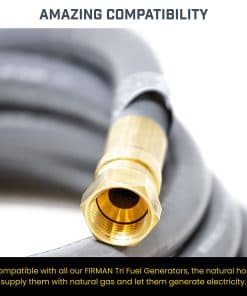 La Manguera de Extensión de Gas Natural Firman 1815 de 25 pies es la solución perfecta para ampliar el alcance de su generador de tri-combustible FIRMAN. Con su longitud extendida, ofrece una colocación flexible del generador y un alcance conveniente para su uso en exteriores. La construcción resistente a la intemperie y reforzada garantiza un rendimiento duradero en todos los entornos, lo que le brinda la tranquilidad de saber que su generador estará siempre listo para funcionar. La conexión rápida proporciona una configuración sin herramientas que permite una conexión rápida y segura a las líneas de gas natural, lo que le permite utilizar su generador de inmediato. Esta manguera es compatible con todos los generadores de tri-combustible FIRMAN, excepto la serie V-twin T12071, para una integración perfecta. La correa de almacenamiento incorporada mantiene la manguera ordenada, libre de enredos y fácil de transportar o almacenar entre usos, lo que la convierte en una adición conveniente a su equipo de generador.