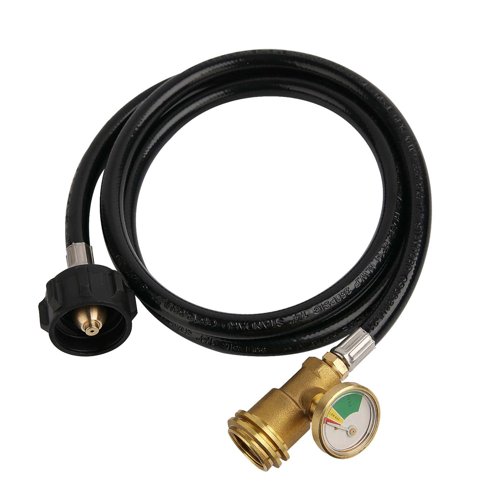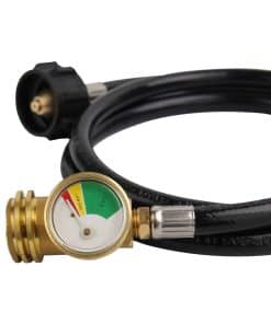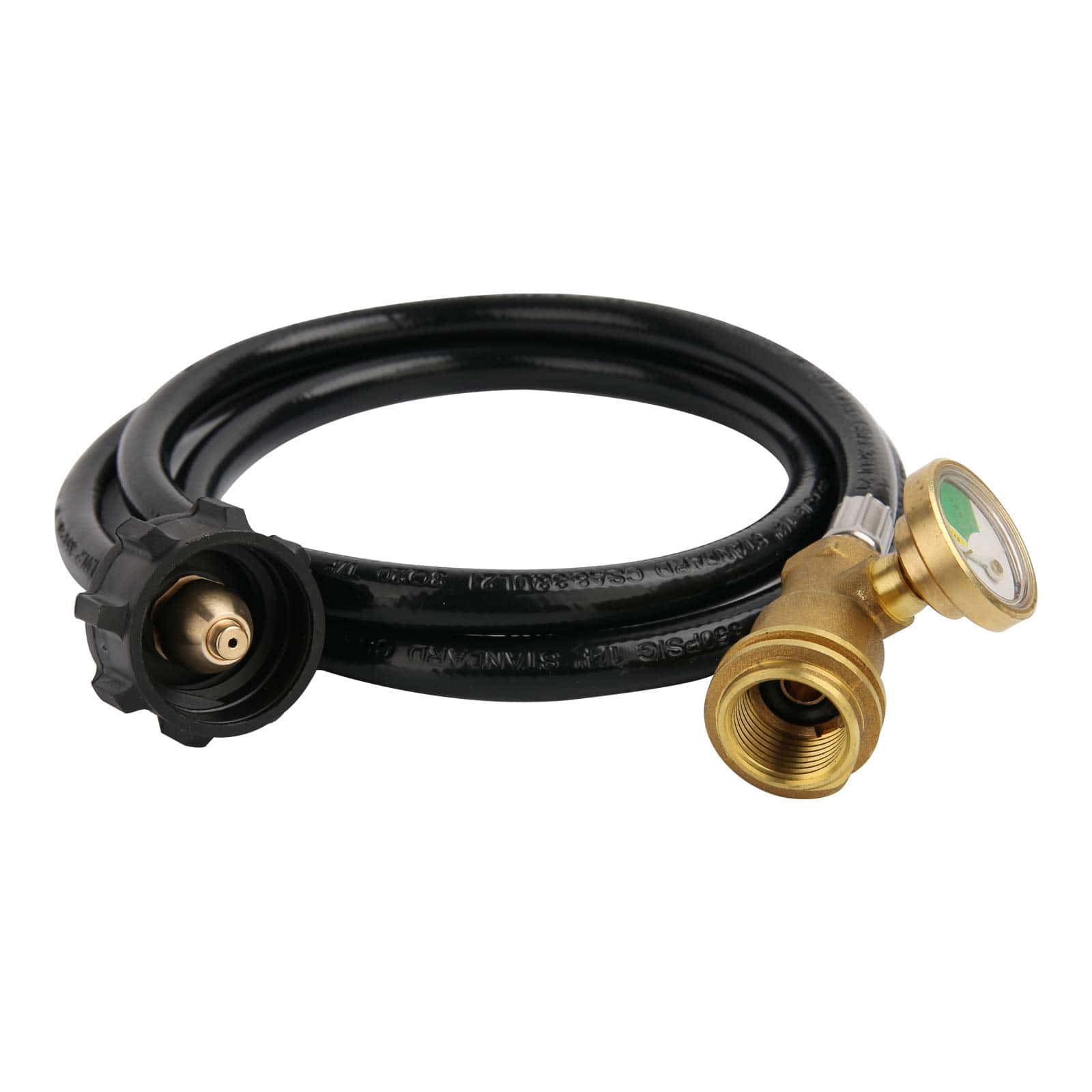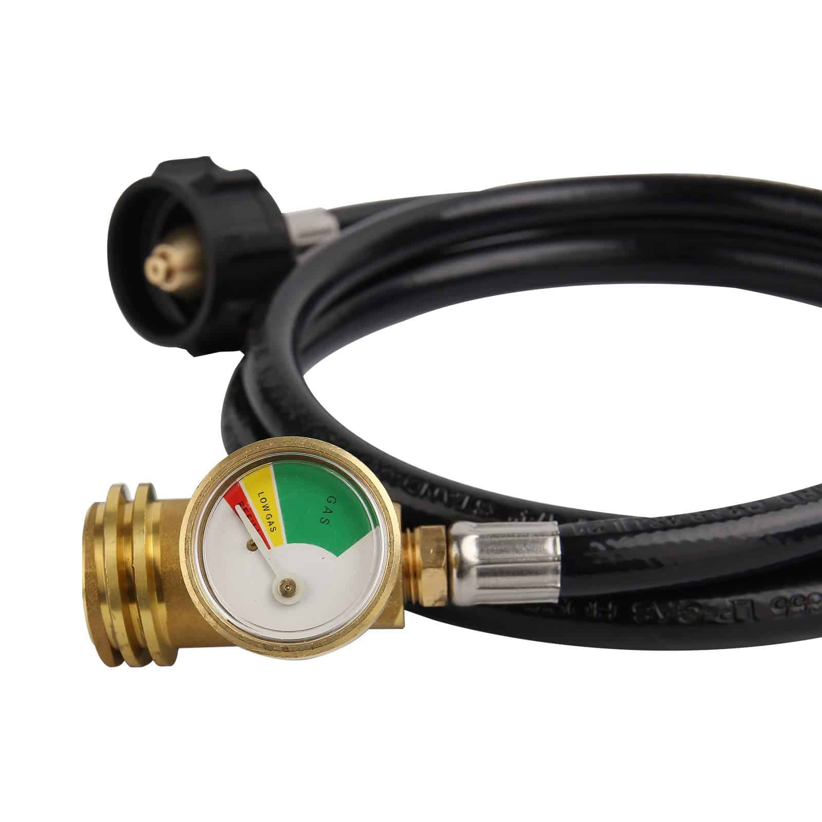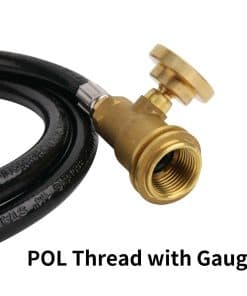 Manguera de Extensión de Tanque de Propano Solimeta de 5 Pies con Medidor, Adaptador de Tanque de Propano, Manguera de Tanque de Propano, Adecuada para Tanque de Propano de 1lb a 20lb. Conecta un electrodoméstico portátil de 1 libra a un tanque de propano de 20 libras o más mediante la conexión de este adaptador. Construcción de latón macizo resistente a la intemperie, rayones, abolladuras y corrosión. La longitud de la manguera de goma es de 5 pies. Conector de entrada: tipo QCC1 Conector de salida: rosca hembra POL con medidor de propano.