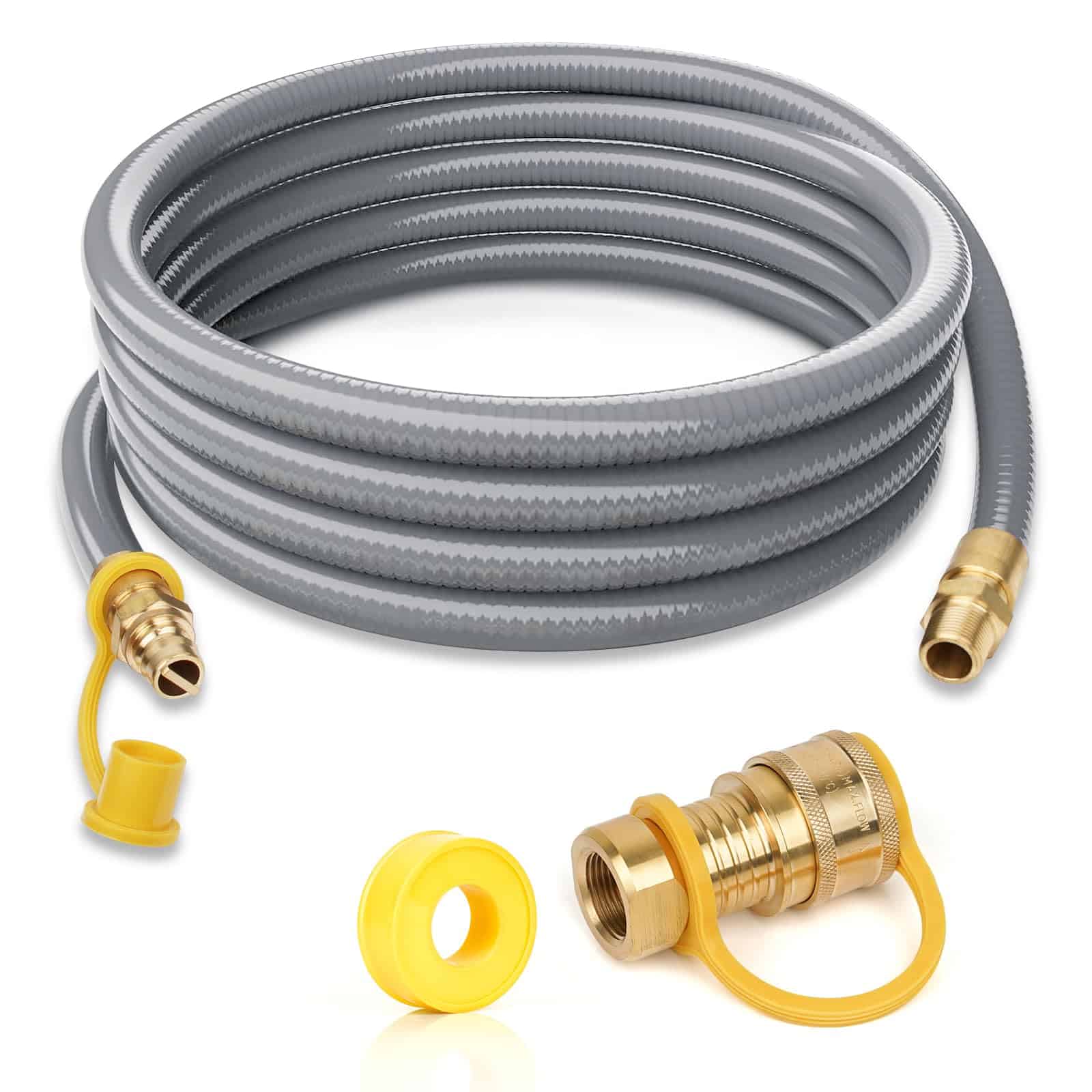 4. Lista de Paquetes: Manguera de gas natural de 24 pies de 3/4″ de diámetro interior (Enchufe de desconexión rápida macho de 3/4″ x Rosca hembra de tubería de 3/4″) + 1 Conector rápido de 3/4″ (Conexión rápida de 3/4″ x Rosca hembra de tubería de 3/4″) + Llave de Orificio de 7mm + Cinta selladora + Velcro de Hebilla.