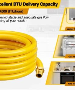 La manguera de gas natural flexible de 33 pies 1/2″ es la solución perfecta para su instalación de gas residencial o comercial. Con una capacidad de flujo alta de 100,000 BTU/hr, esta manguera puede satisfacer todas sus necesidades de gas. Su diseño flexible y seguro le permite adaptarse a cualquier rincón de manera fácil y segura, garantizando una instalación sin problemas. La manguera está construida con acero inoxidable duradero en el interior y una cubierta amarilla resistente en el exterior, asegurando resistencia a la oxidación y a la corrosión, así como una larga vida útil. Con accesorios de latón macho de 1/2″ en ambos extremos, la conexión es rápida y sencilla. Esta manguera de gas es ideal para una amplia gama de aplicaciones, desde parrillas hasta calentadores de agua, garantizando versatilidad y confiabilidad. Además, nuestro compromiso con el servicio postventa asegura que estaremos allí para ayudarlo en caso de cualquier problema. ¡No dude en adquirir nuestra manguera de gas natural flexible y disfrutar de una instalación segura y eficiente!