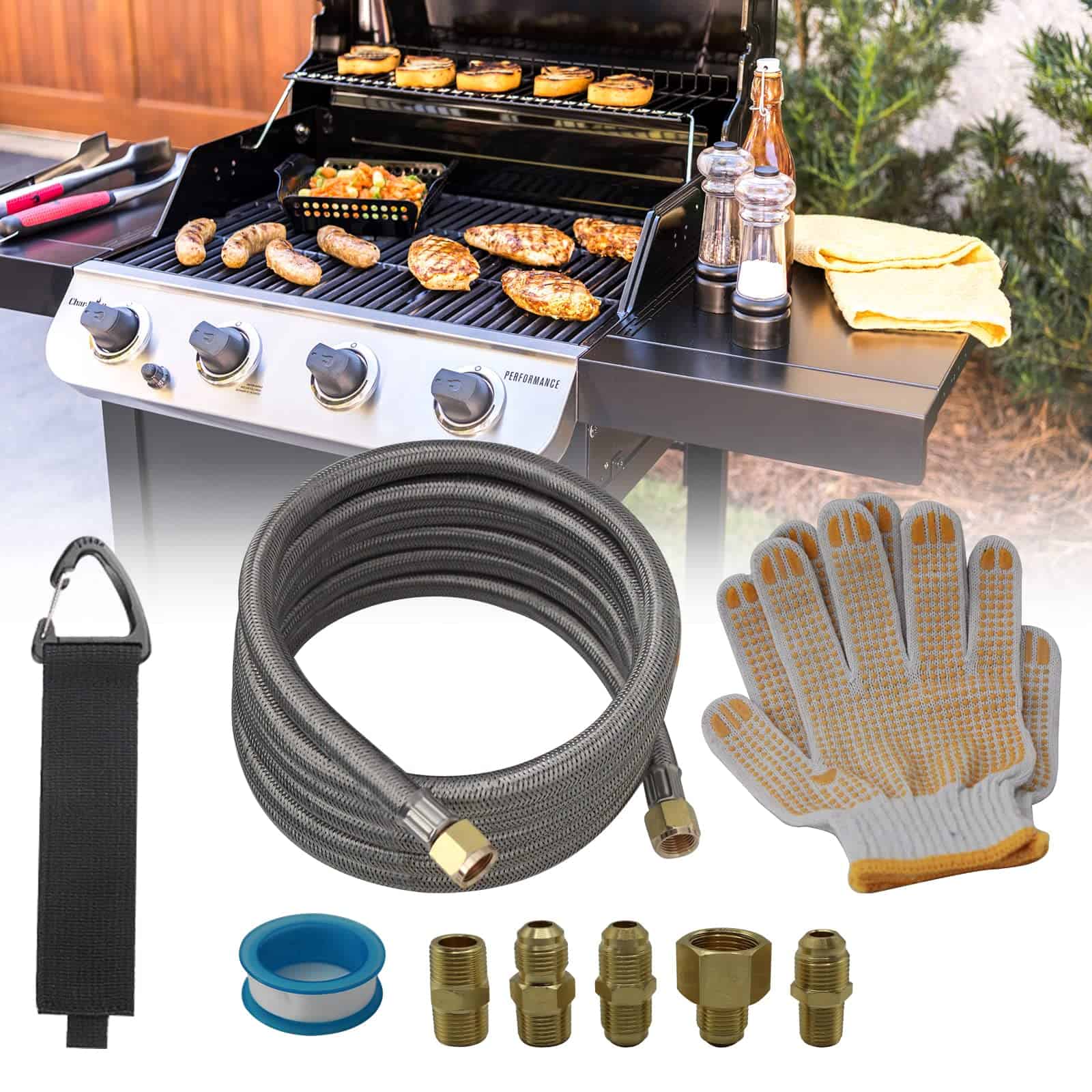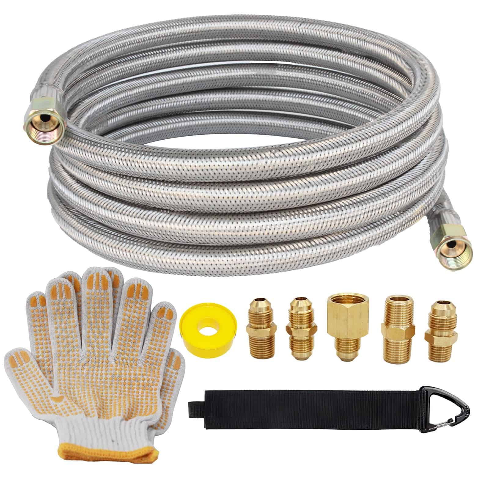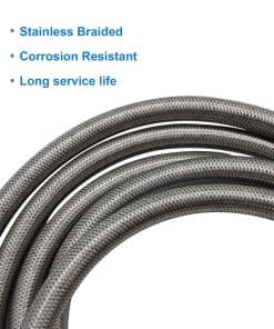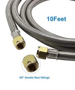 Manguera de Propano Presurizada de Alta Presión de 10 Pies con Acoplamiento de Conversión 3/8″ a 1/2″ Hembra NPT, 1/4″ Macho NPT, 3/8″ Macho Flare para RV, Cocina, Fuego de Propano, Calentador. Esta manguera de propano de alta presión de 10 pies es la solución perfecta para tus necesidades de extensión de propano. Con extremos de ajuste de bronce de 3/8″ de antorcha hembra en ambos extremos, esta manguera te permite convertir equipos exteriores a tu línea natural o de GLP para ampliar su alcance y flexibilidad. La manguera de propano de 3/8″ hembra de rosca está trenzada de acero inoxidable duradero, lo que la hace resistente a la corrosión, al envejecimiento, estanca, al aire, al calor y flexible para un rendimiento constante. Este kit incluye un adaptador de accesorios de bronce para 6 tipos diferentes de manguera de propano de 3/8″, que garantiza una instalación fácil y segura. Con una presión de 350 PSI, esta manguera de extensión de propano certificada por CSA es perfecta para su uso en fogatas, parrillas de gas, calentadores de propano, estufas, ahumadores de propano, generadores portátiles, quemadores, generadores de propano, RVs y más. Ya sea que estés de viaje o en un remolque de RV, este kit de manguera de propano tiene todo lo que necesitas para una instalación rápida y sin complicaciones. El paquete incluye: 1 Manguera de Extensión de Propano de Alta Presión de 18FT (10 pies); 5 Acoplamientos de Accesorios (3/8″ NPT Macho x 3/8″ NPT Macho, 3/8″ Macho Flare x 3/8″ Macho Flare, 3/8″ NPT Macho x 3/8″ Macho Flare, 1/2″ Hembra NPT x 3/8″ Macho Flare, 1/4″ NPT Macho x 3/8″ Macho Flare); 1 Rollo de Cinta de Sellado; 1 Hebilla de Velcro; 1 Par de Guantes. No dudes en contactarnos si tienes alguna pregunta o problema con este producto.