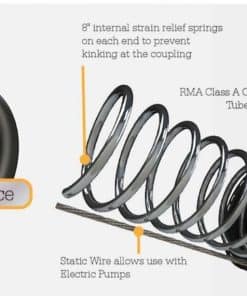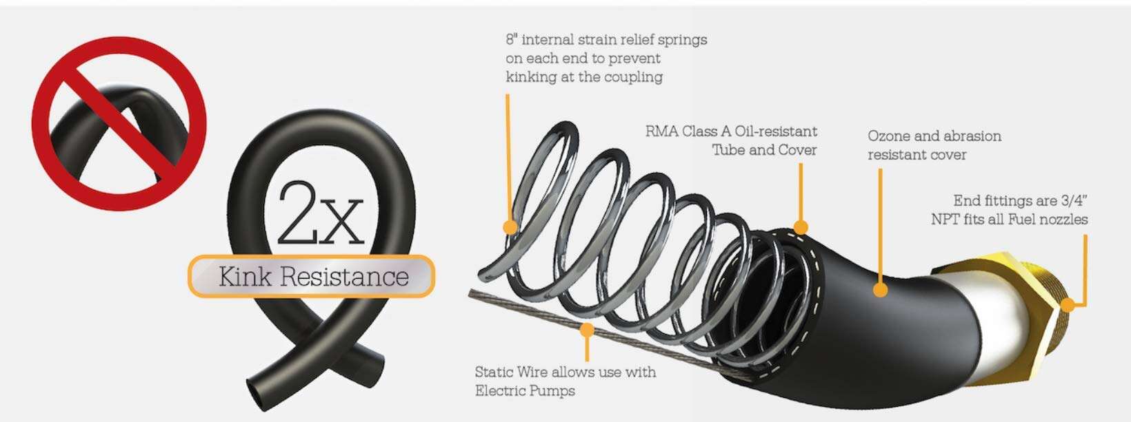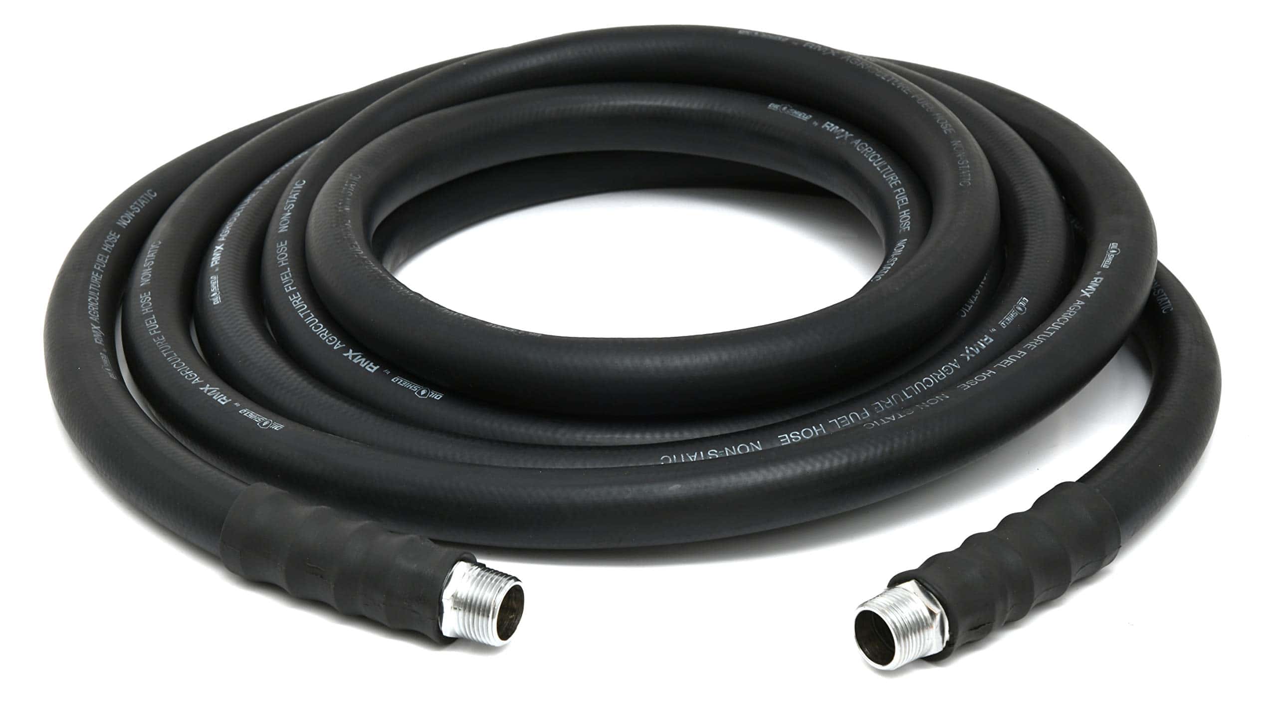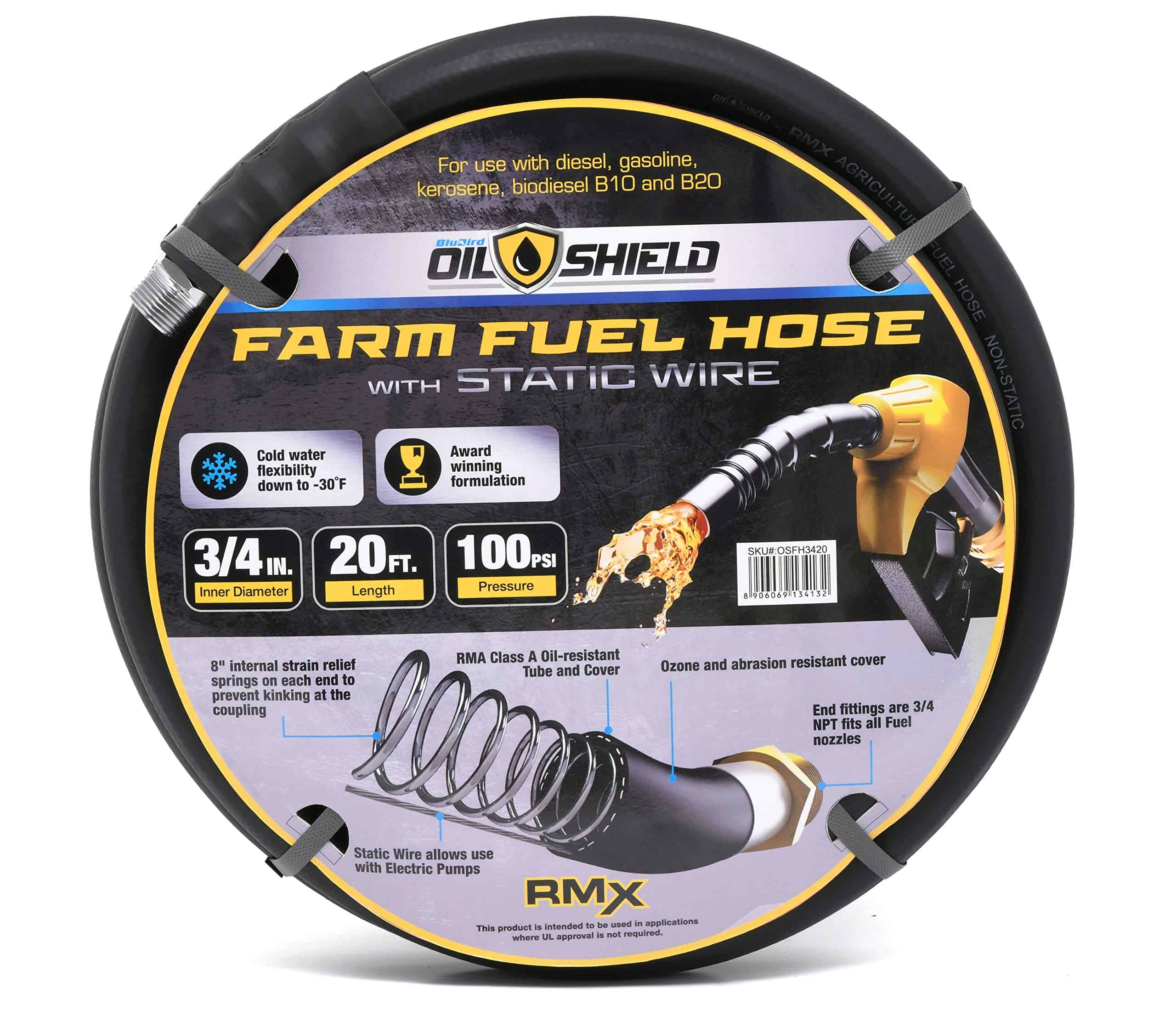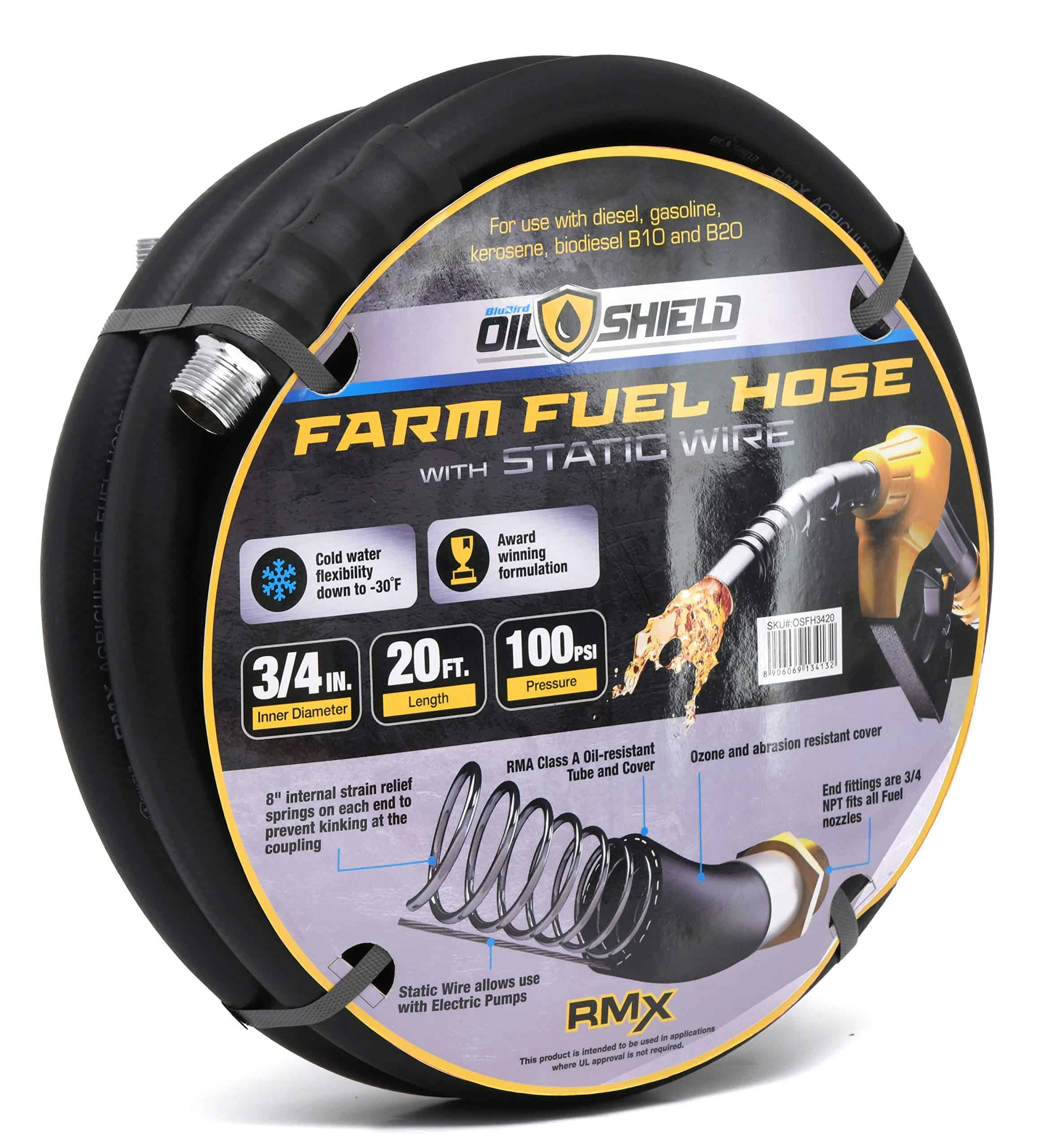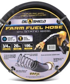 Manguera de transferencia de combustible para granjas RMX Oil Shield de hilo sintético con cable estático, requerida para su uso con bombas eléctricas de 12 o 110 voltios. 2 veces más resistente a dobleces y flexible a -30 F. Formulación galardonada. Recomendada para dispensar gasolina, hasta un 15 % de etanol, diesel, queroseno y aceite. Construcción: tubo/cubierta resistentes al aceite. Reforzada en espiral con hilo sintético. Incluye cable estático incorporado en la pared de la manguera. Ensamblajes: acoplados macho x macho con un «cable estático» incorporado para disipar la electricidad estática asociada con bombas eléctricas. Guardias internas de resorte de 8 pulgadas en cada extremo, evitan que la manguera se doble en el acoplamiento, extendiendo la vida útil de la manguera tres o cuatro veces.