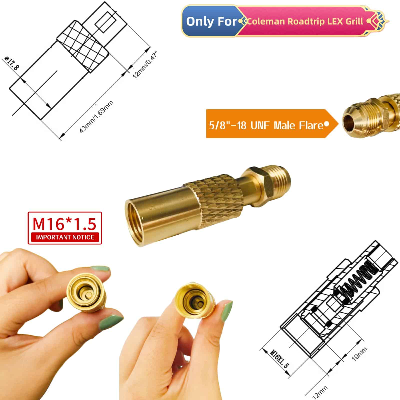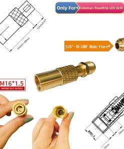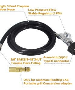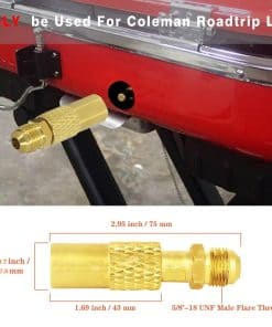 5. Adaptador de varilla macho de 3/8» fabricado en latón 100%, compatible con el adaptador del regulador de gas para parrilla Coleman Roadtrip LEX, reemplaza C001, 5010000743 para el ajuste del regulador de parrilla portátil Coleman roadtrip LEX, funciona con la manguera de regulador de propano para conectar un tanque grande de propano de 5 lb a 20 lb. 6. Manguera de regulador de propano de baja presión de 5 pies adaptador para válvula estándar estadounidense QCC1/Type1 de tanques de propano cilíndricos. Es ideal para convertir la parrilla estufa portátil Coleman para conectar cilindros de tanques de propano de 50 lb a 40 lb, evitando gastar dinero en tanques de 16.4 oz / 1 lb que durarán pocas horas de uso. También tiene protección de seguridad: el adaptador QCC1 tiene una función de protección contra desbordamiento que cortará automáticamente el flujo de gas cuando se alcance la presión. 7. Diferentes adaptadores de entrada con rosca para modelos Coleman: El tamaño de rosca del adaptador para parrilla Coleman RoadTrip LXE es ____ , mientras que el tamaño de rosca del ____ es ____.