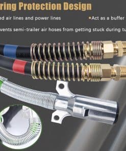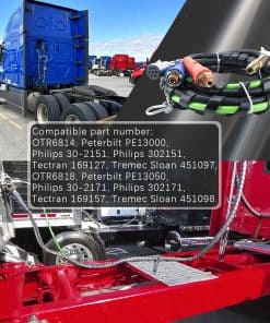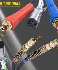 Manguera de aire semi 3 en 1 Incluye 2 mangueras de aire negras y 1 cable de alimentación eléctrica de 7 vías ABS verde. Las mangueras de aire en 3 en 1 de alta calidad para camiones de semi permiten un transporte más seguro y conveniente. El kit de manguera de aire de camión semi puede mantener la parte trasera del tractor/remolque ordenada y organizada. Manguera de aire de alta calidad para camiones semi El kit de manguera de aire está hecho de materiales de alta calidad, tiene buena flexibilidad, funciona bien a altas y bajas temperaturas, evita el agrietamiento de la tráquea y las fugas de aire. El cable de aire de 7 vías está hecho de cobre puro de alta calidad, con una larga vida útil, una excelente conductividad eléctrica y térmica, una transmisión de energía efectiva Utiliza el enchufe de zinc fundido a presión estándar de la industria para transmitir eficientemente la energía desde el motor a su remolque/camión. Resorte especialmente diseñado con extremos evita el adelgazamiento de la línea debido a la fricción prolongada. Evite fricciones que hagan que la línea de aire se hinche. Nuestras mangueras de aire para camiones semi 3 en 1 tienen una resistencia excepcional a la flexión y a la abrasión, incluye una abrazadera para facilitar la instalación. Número de pieza compatible: OTR6814, Peterbilt PE13000, Philips 30-2151, Philips 302151, Tectran 169127, Tremec Sloan 451097, OTR6818, Peterbilt PE13050, Philips 30-2171, Philips 302171, Tectran 169157, Tremec Sloan 451098. Paquete incluido: 1x Kit de mangueras de aire 3 en 1 para camión semi